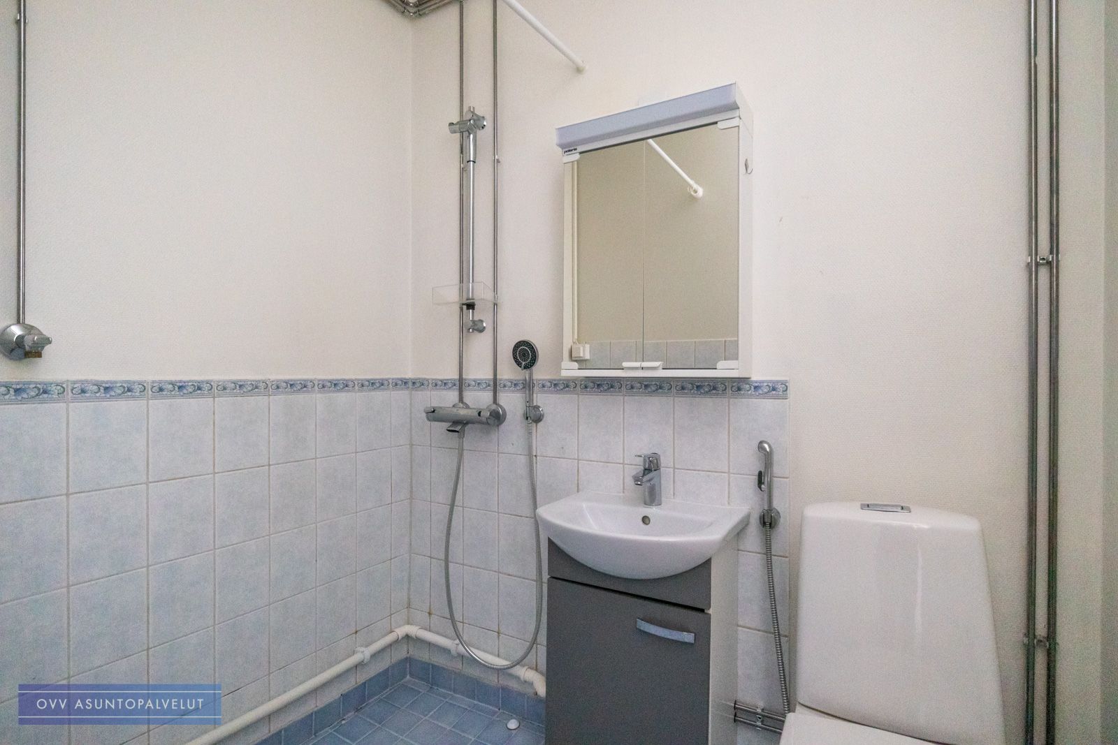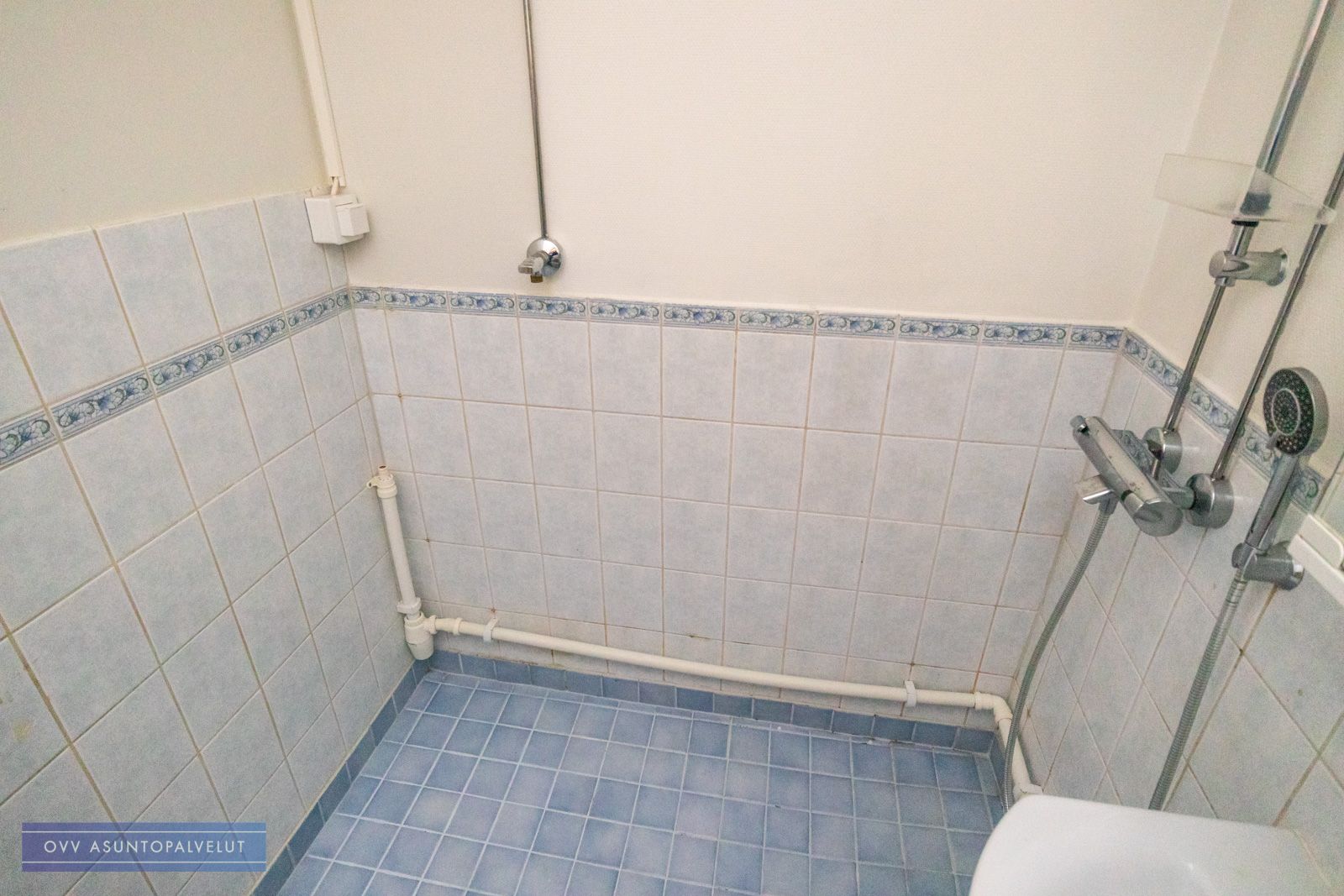 Kylpyhuoneessa paikka ja liitäntä pyykinpesukoneelle. Vesikalusteita vaihdettu käyttövesijohtoremontin yhteydessä.