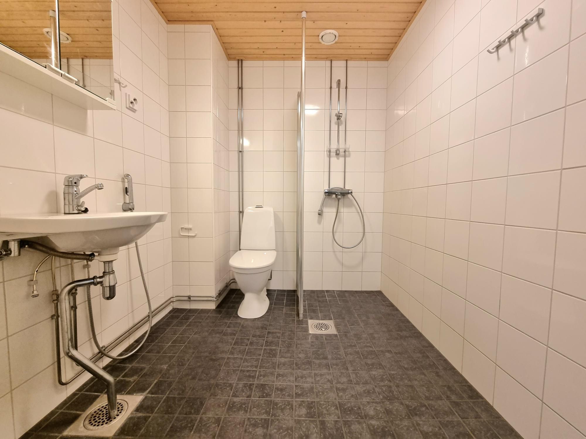 Laatoitetussa kylpyhuoneessa tila sekä liitäntä pyykinpesukoneelle.