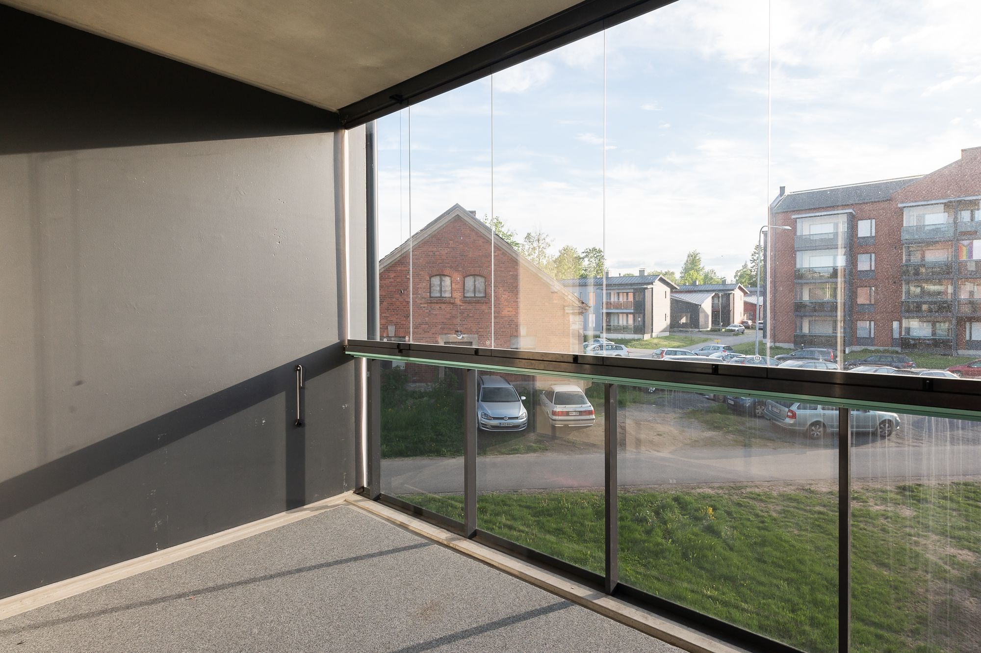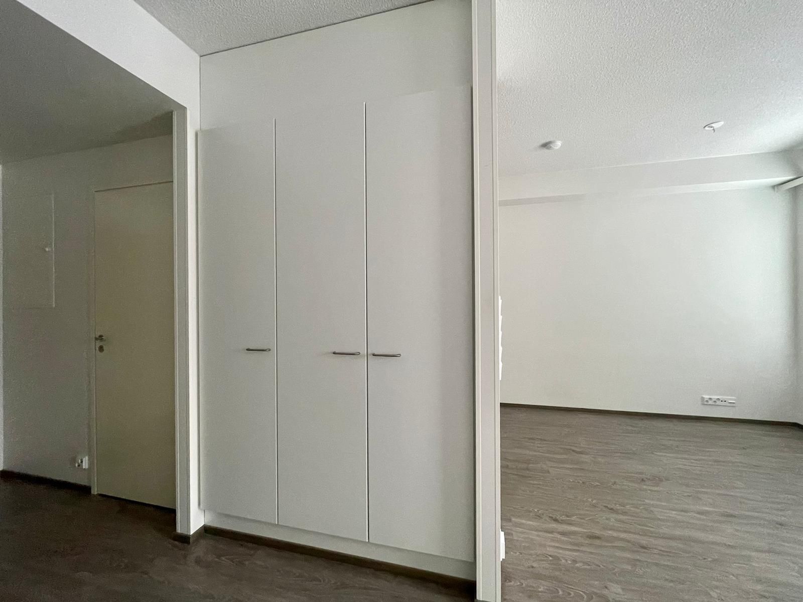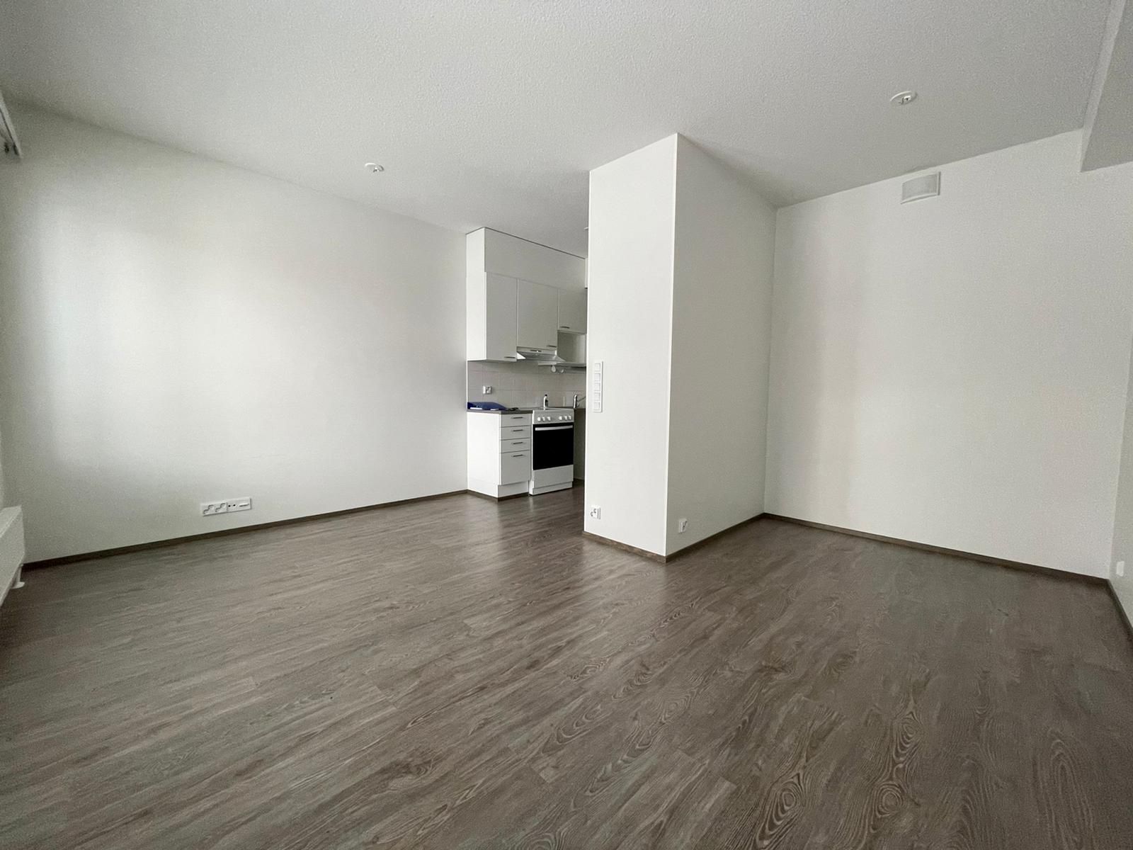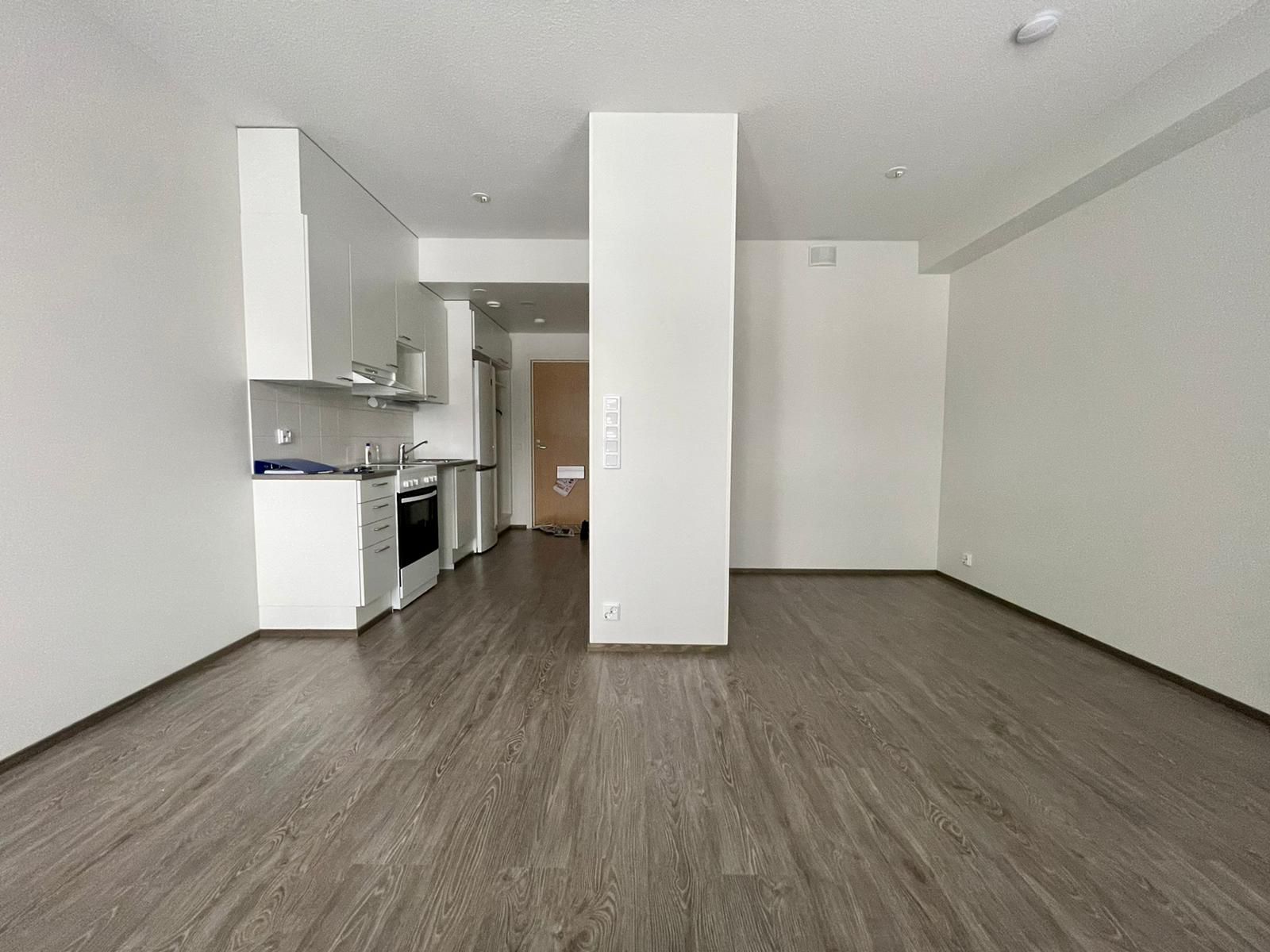 Avokeittiössä modernit valkoiset kalusteet; liesi, liesituuletin, jääkaappipakastin sekä tila ja liitäntä astianpesukoneelle. Seinät on maalattu valkoisiksi ja lattiat harmaasävyistä laminaattia. Alkoviin mahtuu isompikin sänky ja lasitettu parveke tuo lisätilaa asumiseen. Ikkunoissa myös valmiina sälekaihtimet.