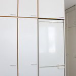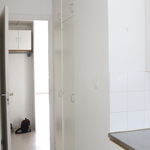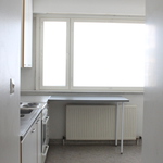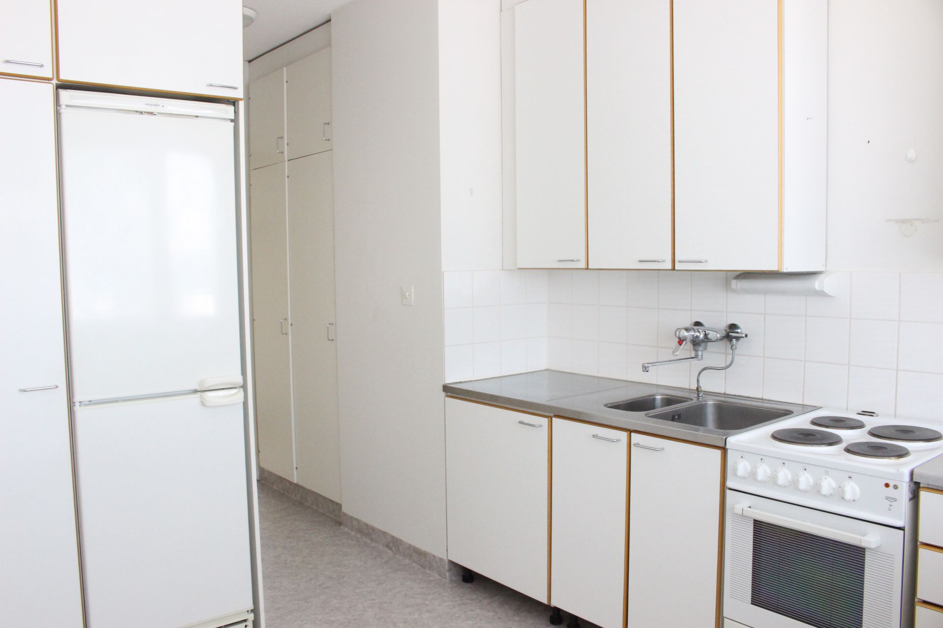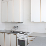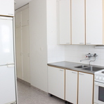 Keittiössä jää/pakastinkaappi, liesi ja liitäntä astianpesukoneelle.