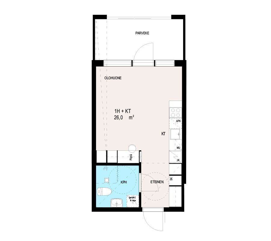 Kerrostalo, 26 m², 1h + tupakeittiö + lasitettu parveke