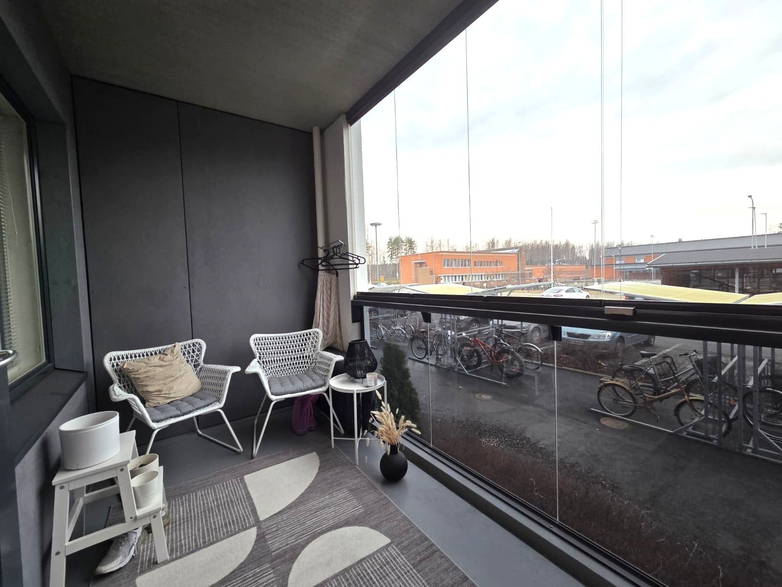 Ensimmäisen kerroksen asunto lasitetulla parvekkeella, astianpesukone valmiina. Kaakeloidussa kylpyhuoneessa on liitäntä pyykinpesukoneelle.