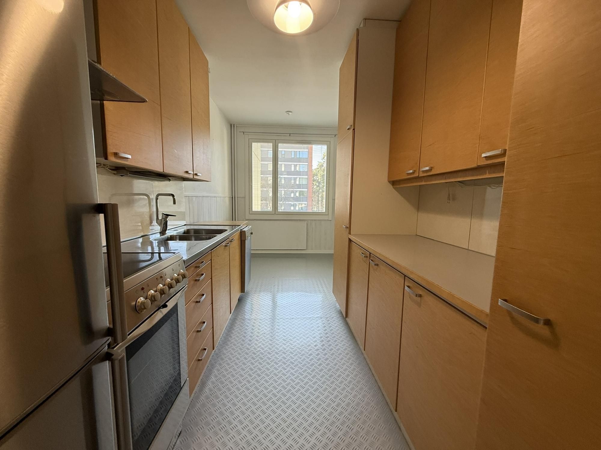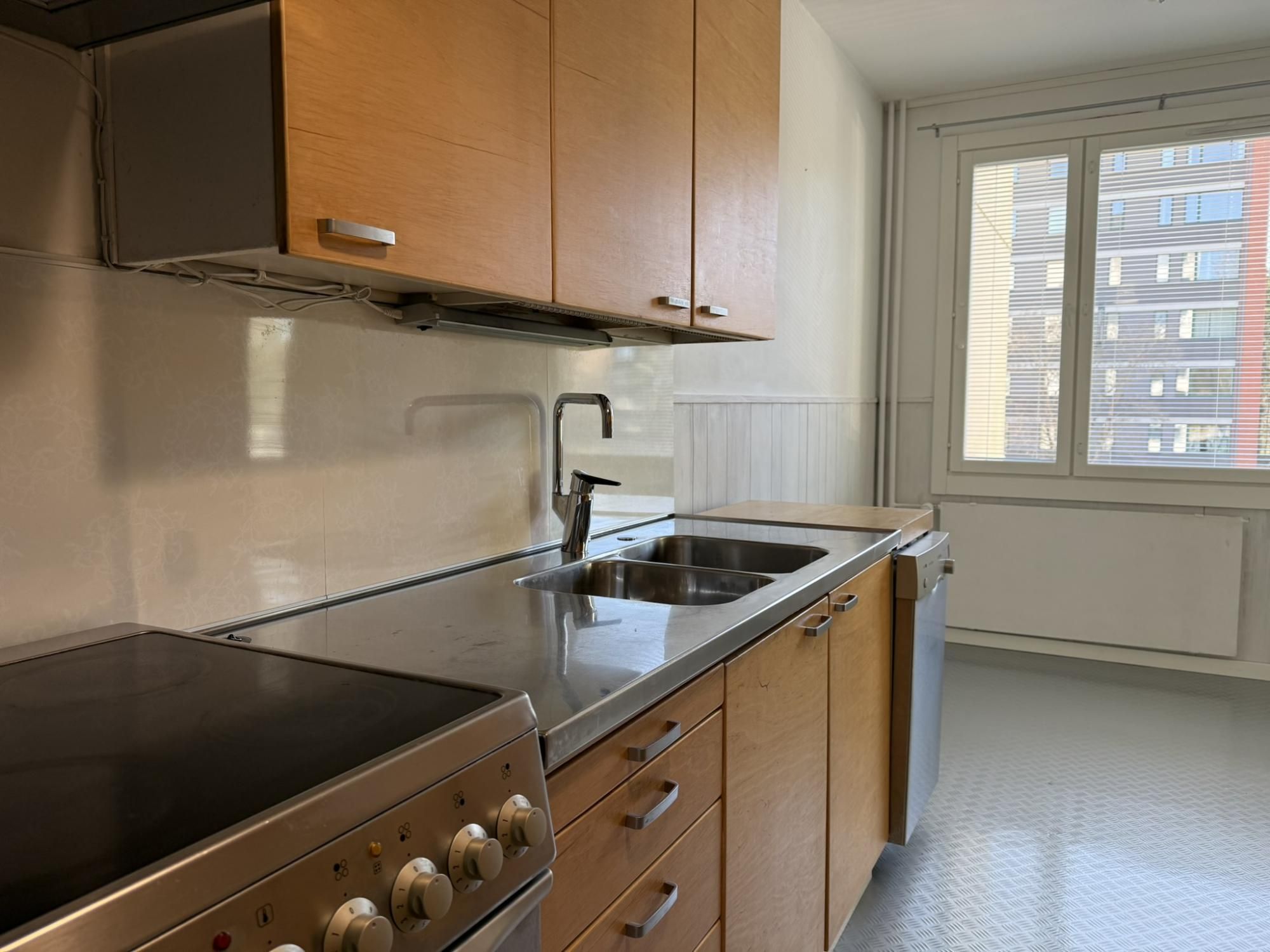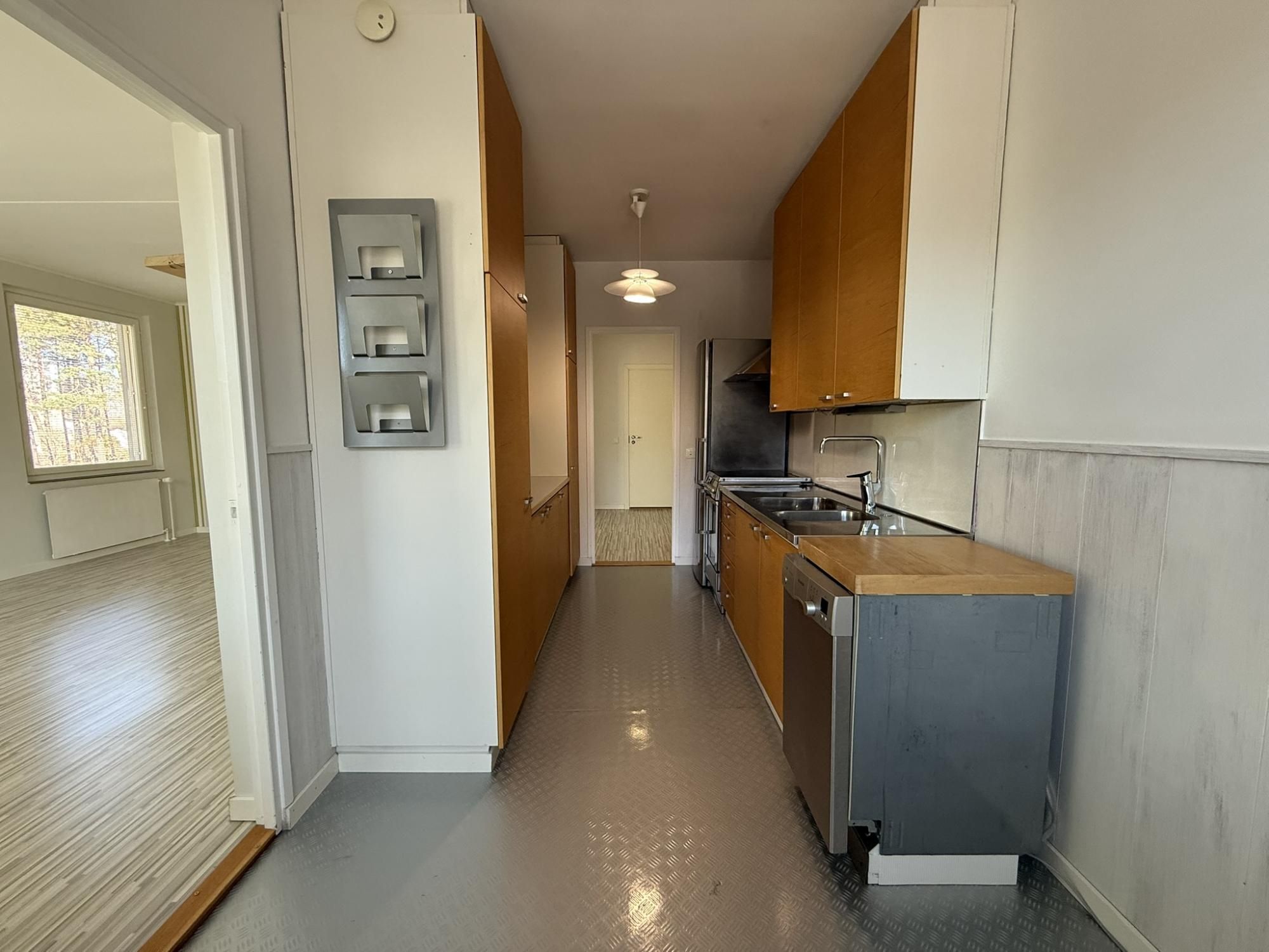 Keittiössä on valmiina jääkaappipakastin, liesi, liesituuletin sekä astianpesukone. Keittiöön saat myös ruokaryhmän. Kiinteää kaapitilaa on reilusti eteisessä ja makuuhuoneessa.