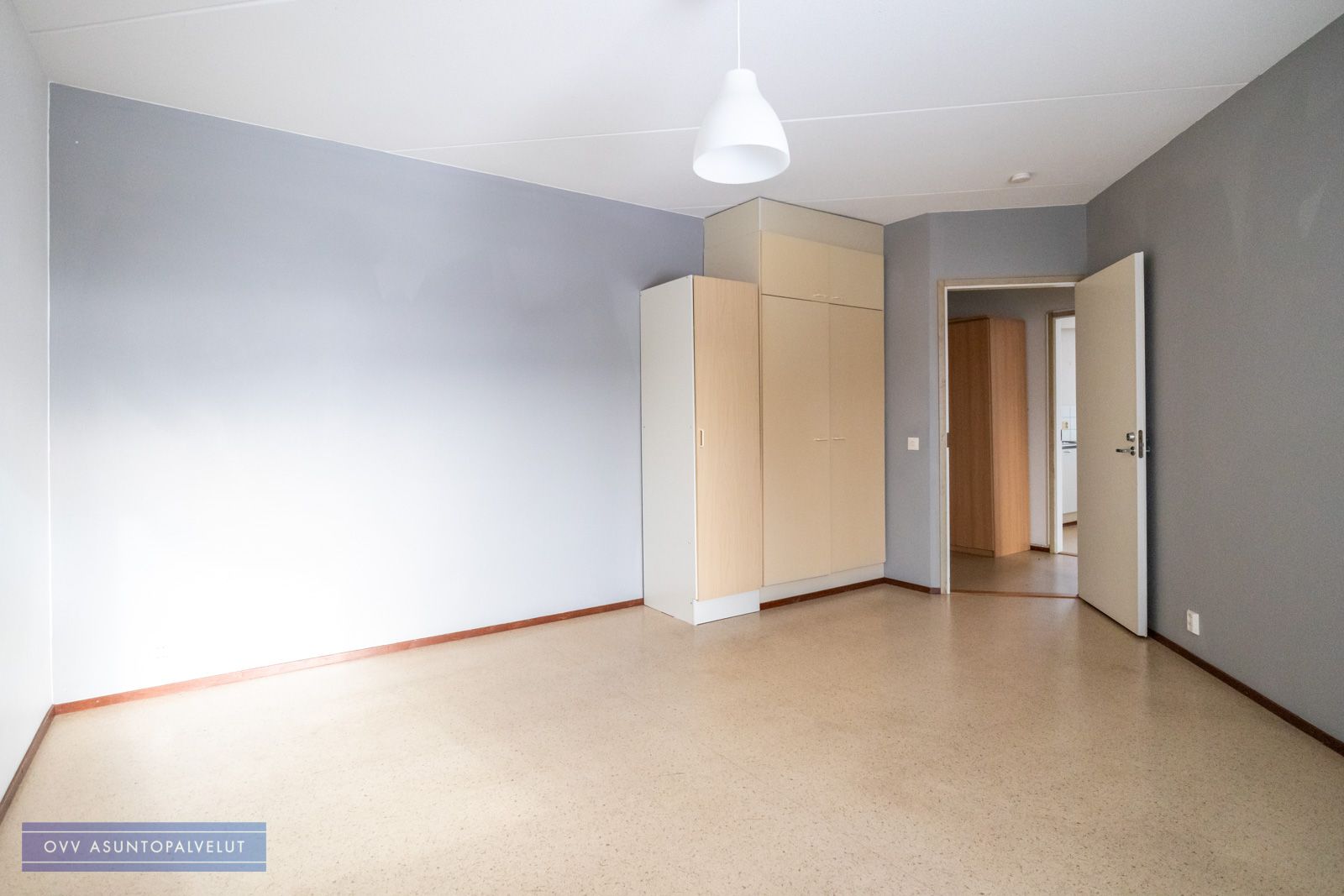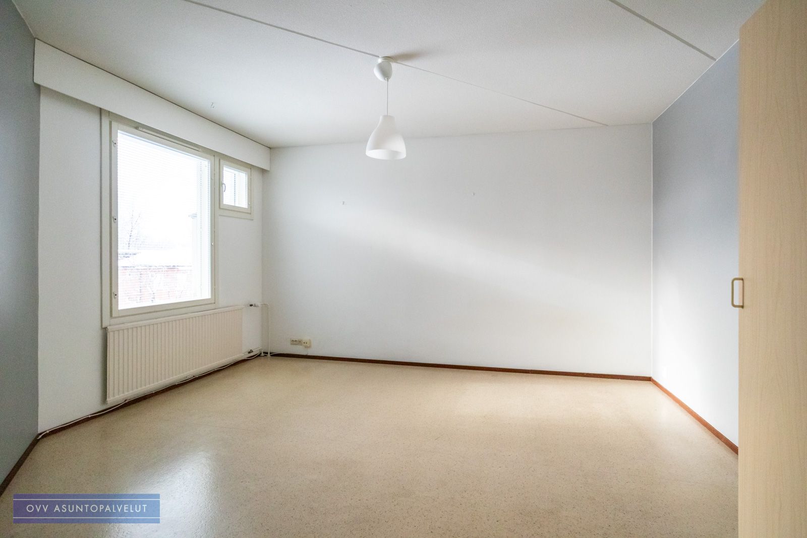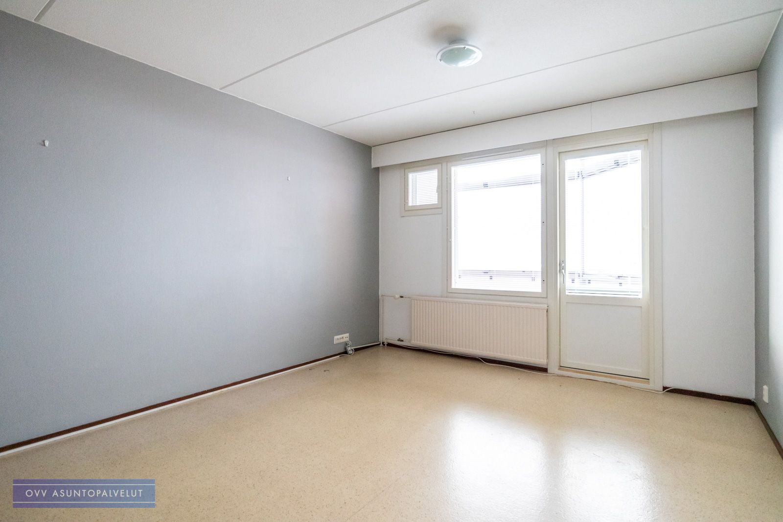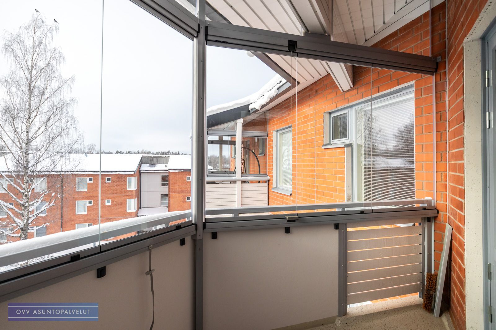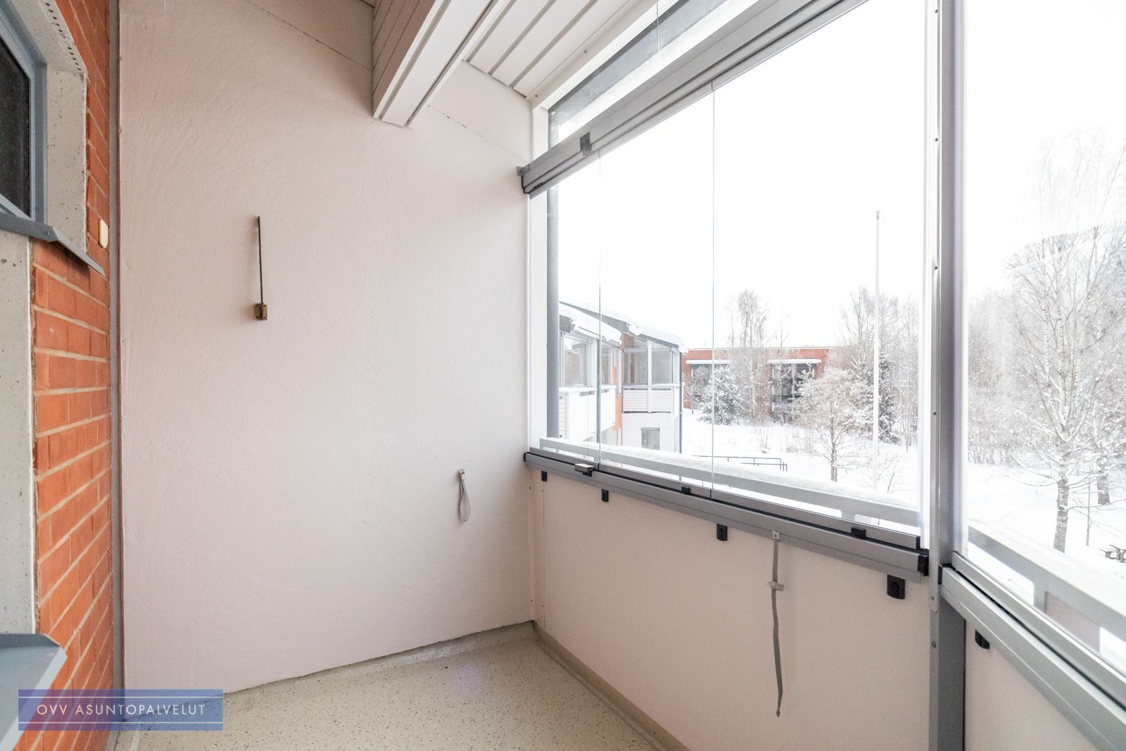 Asunnon pohjaratkaisu on erittäin selkeä. Jokainen huone on lukollisen oven takana, joten tarvittaessa asunnossa voisi olla jopa 3 makuuhuonetta sekä keittiö ja kylpyhuone. Yhdestä huoneesta käynti parvekkeelle, jonne juuri valmistuneessa julkisivuremontissa on lisätty lasitukset.