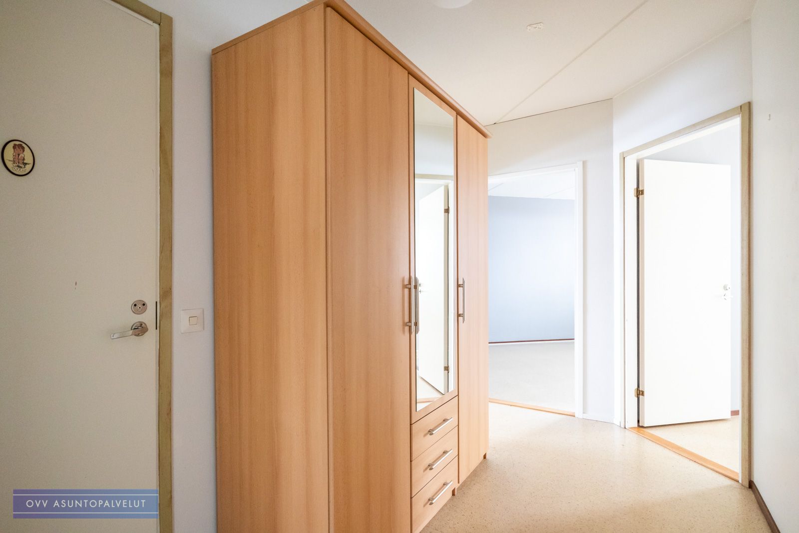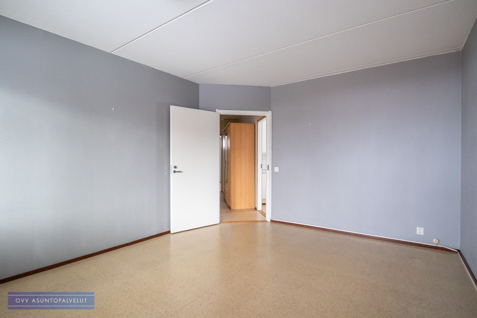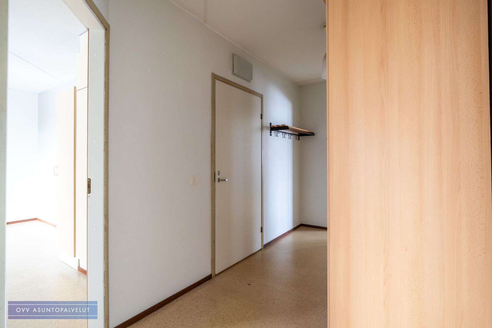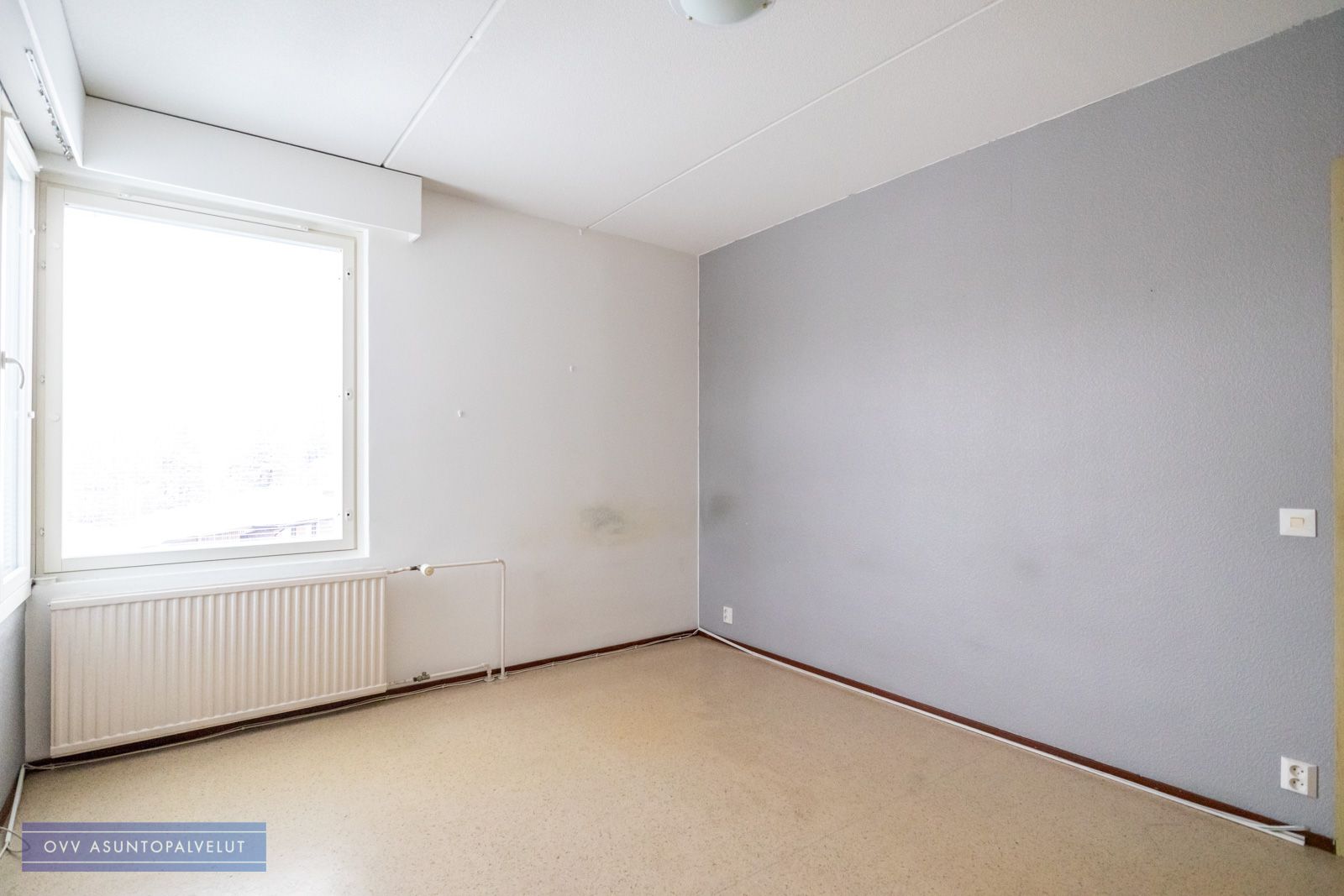 Asunnon pohjaratkaisu on erittäin selkeä. Jokainen huone on lukollisen oven takana, joten tarvittaessa asunnossa voisi olla jopa 3 makuuhuonetta sekä keittiö ja kylpyhuone. Yhdestä huoneesta käynti parvekkeelle, jonne juuri valmistuneessa julkisivuremontissa on lisätty lasitukset.