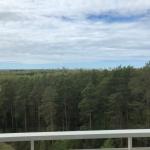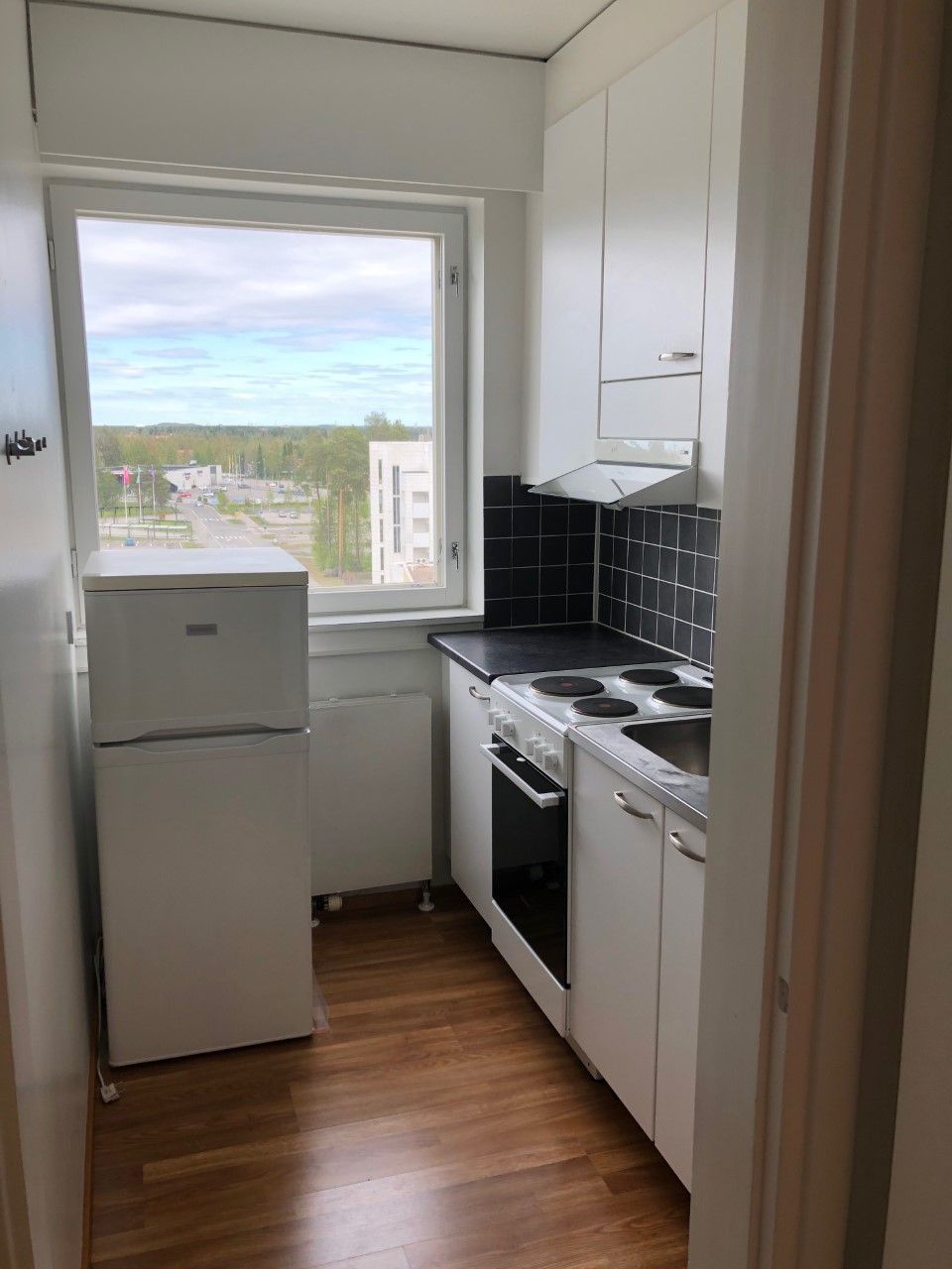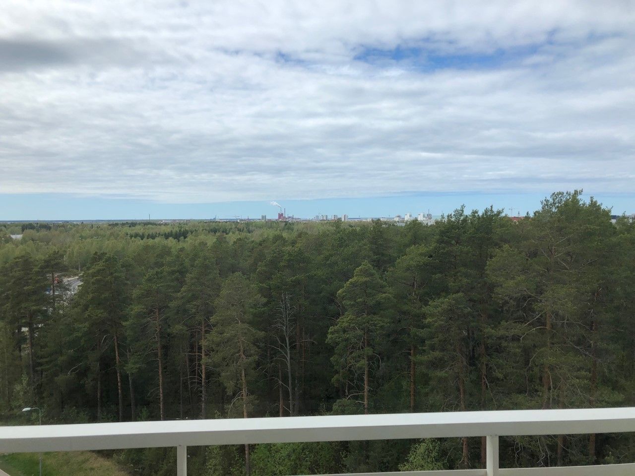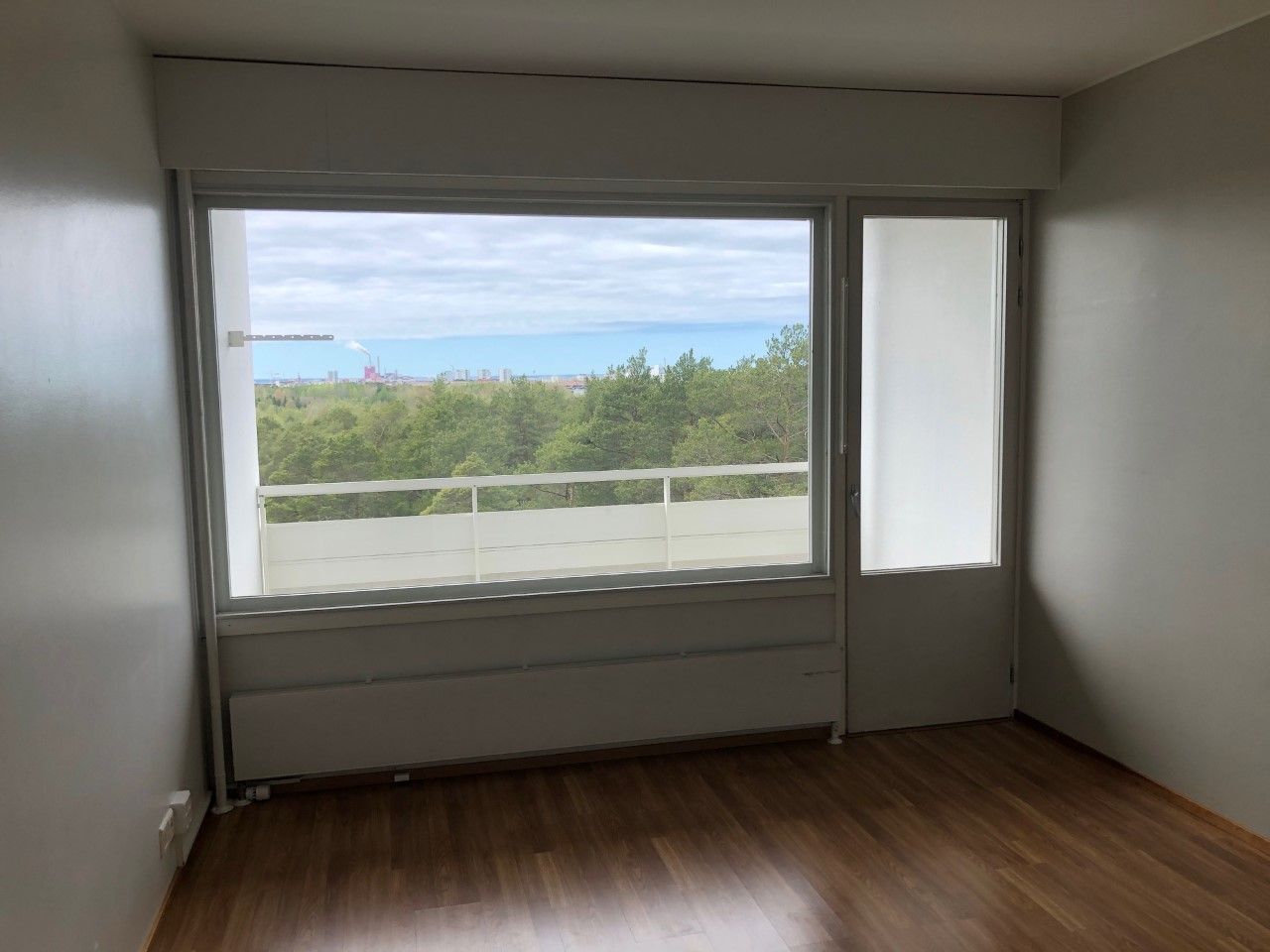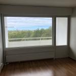 Valoisa yhdeksännen kerroksen kaksio jossa avarat näkymät Luoteeseen kaupungin yli merelle päin.