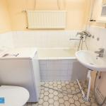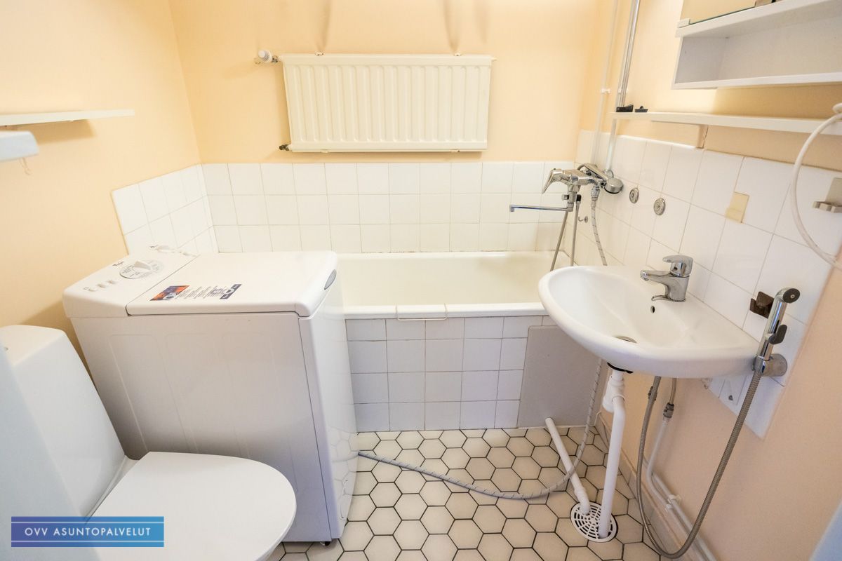 Kylpyhuoneessa amme ja valmiiksi pyykinpesukone asukkaan käytettäväksi, sillä taloyhtiössä ei erillistä pesutupaa.