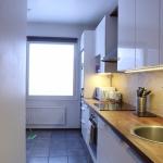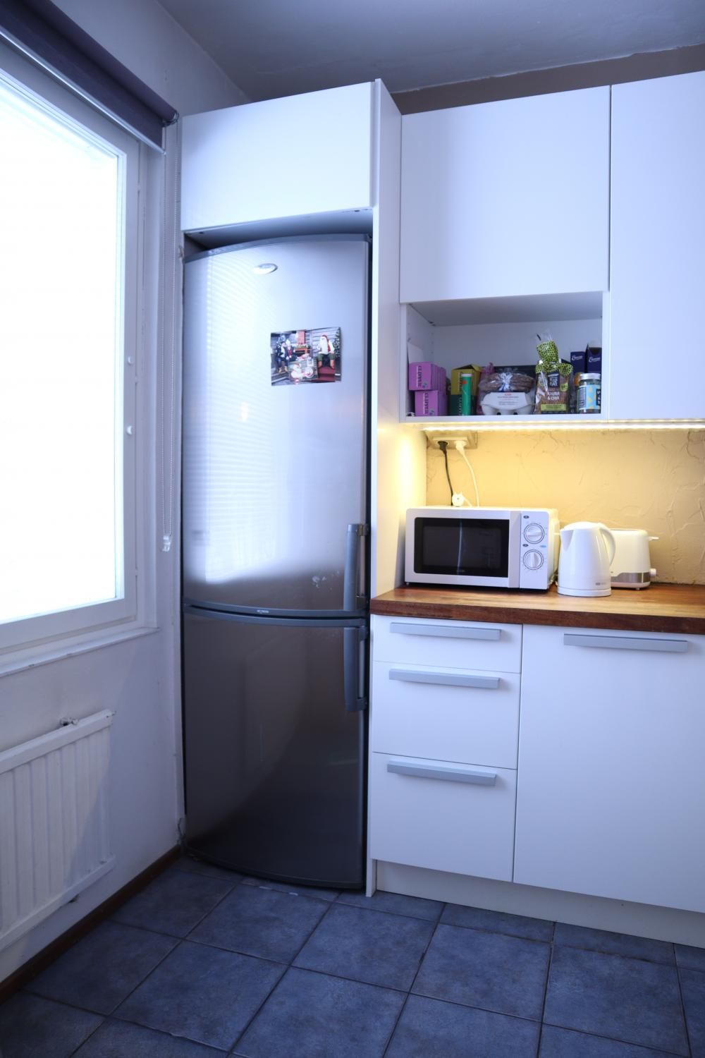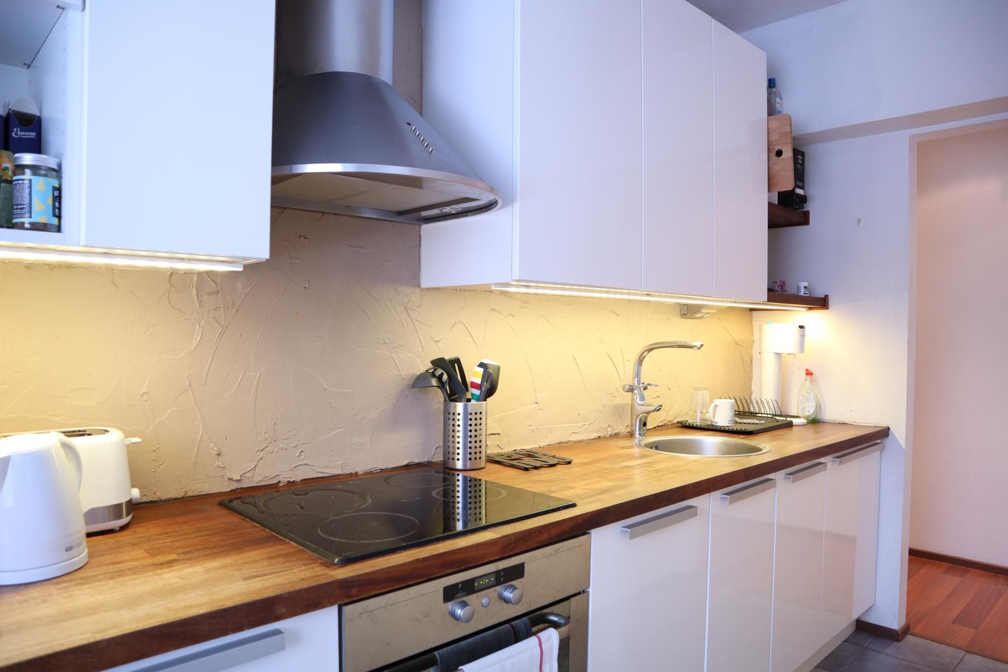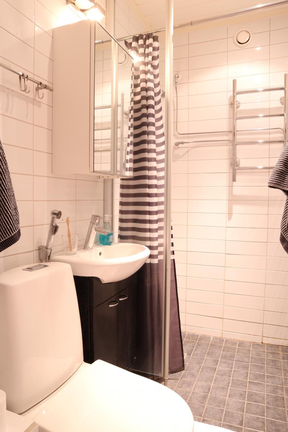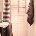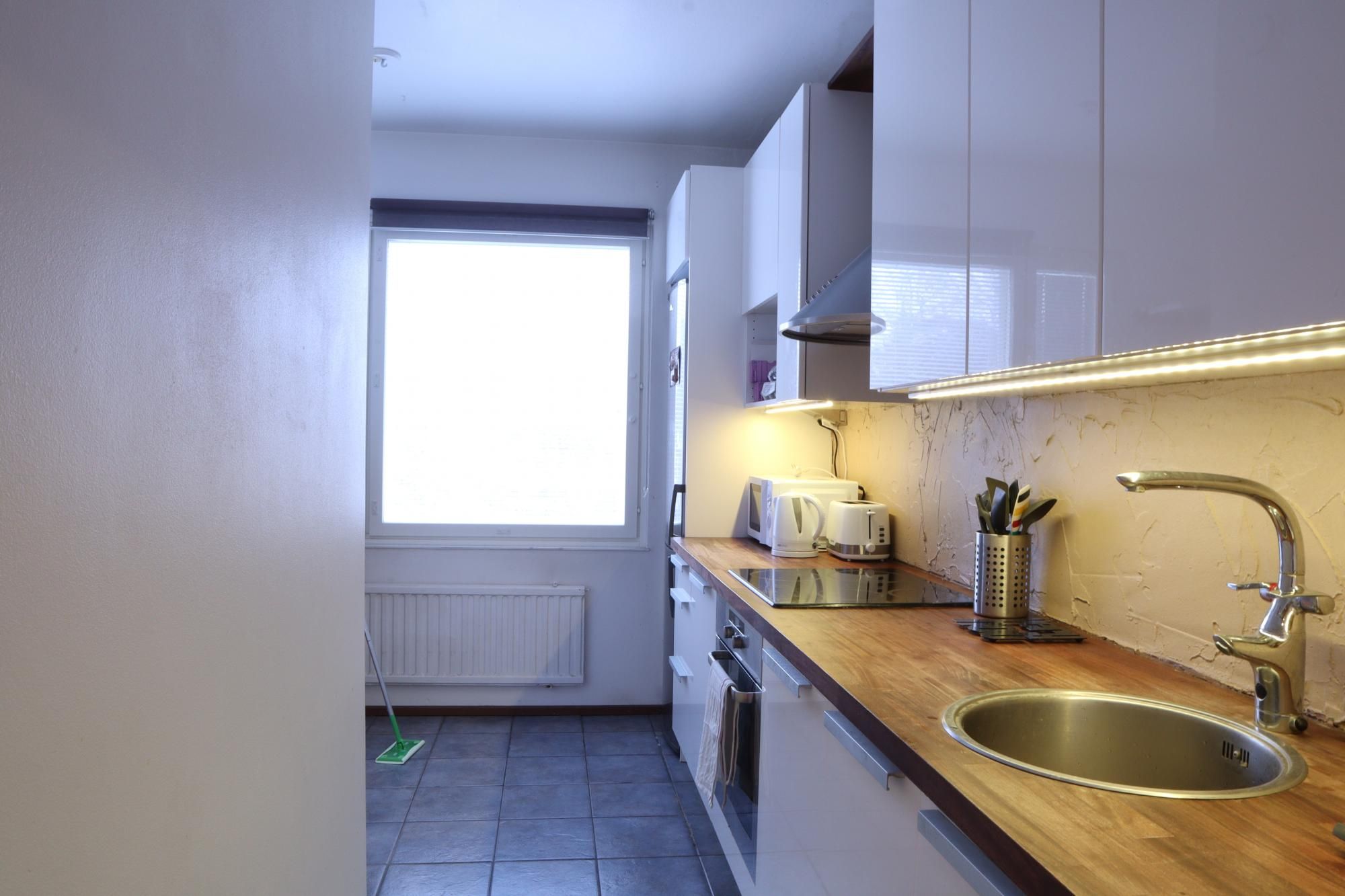 Eteisestä on suoraan käynti makuuhuoneeseen. Makuuhuoneessa on kiinteää kaappitilaa. Keittiö on hyvässä kunnossa ja persoonallisuutta luo välitilan betonitasoite. Keittiö on varusteltu kattavasti – astianpesukone sekä pyykinpesukone ovat valmiina. Ruokaryhmälle on oma tila keittiössä. Kylpyhuoneessa on tyylikkään sävyiset laatat ja myös pyyhekuivain on valmiina.