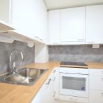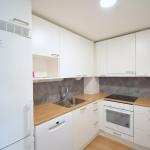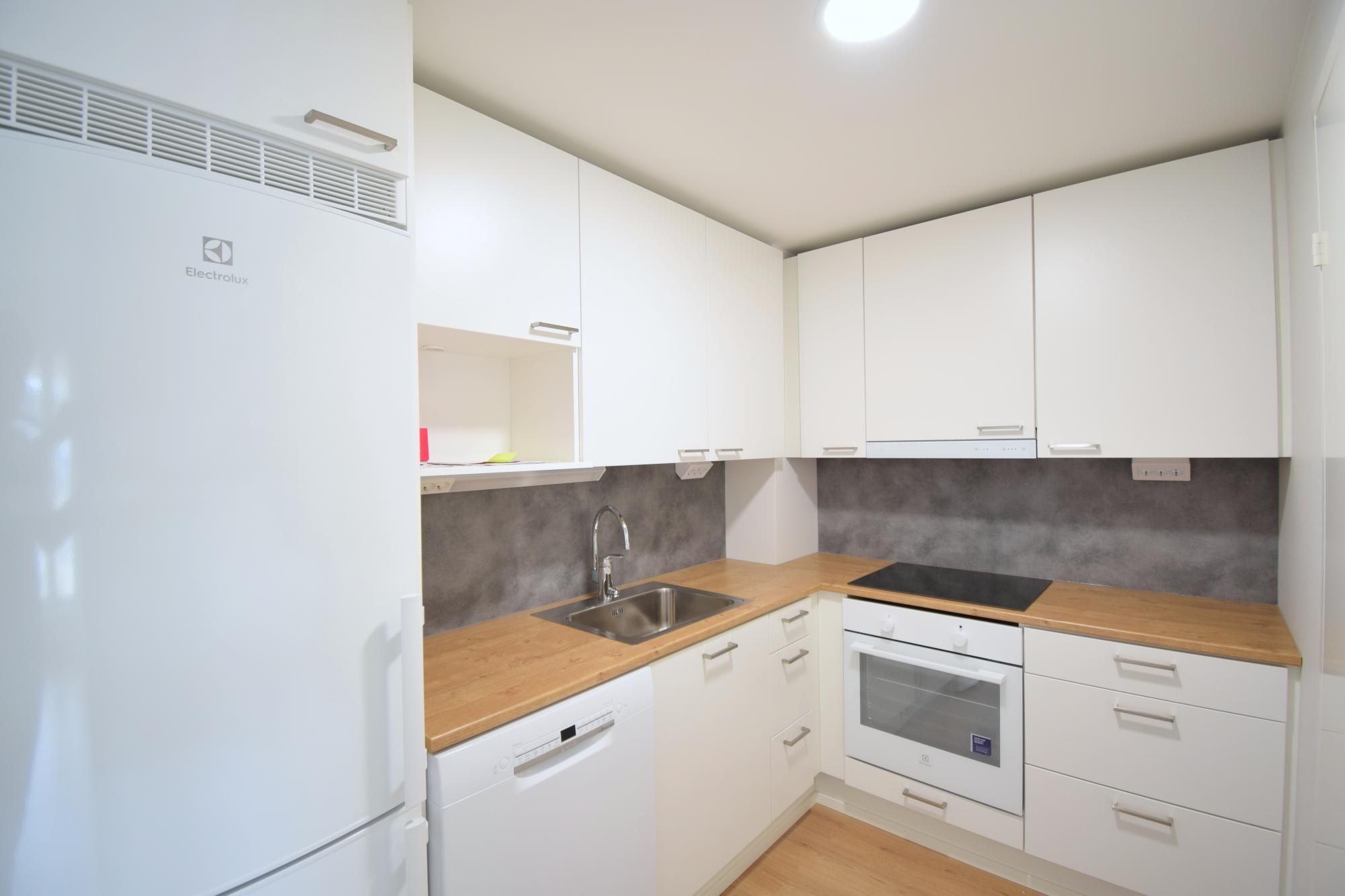 Asunnon eteisessä on käytännöllinen syvennys runsaalla kaappitilalla. Tyylikäs ja moderni keittokomero on varustettu laadukkailla kodinkoneilla: jääkaappipakastin, astianpesukone, erillisuuni, induktioliesitaso sekä liesituuletin tekevät arjesta sujuvaa.