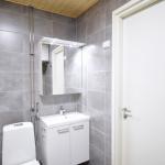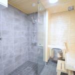 Kylpyosasto on viimeistelty tyylikkäillä harmaan sävyisillä laatoilla. Tilasta löytyy paikka pesutornille, lasiseinällä erotettu suihkutila sekä oma sauna modernilla lasiseinällä.