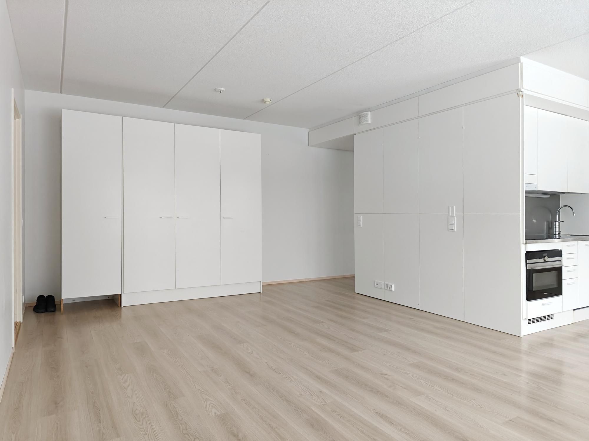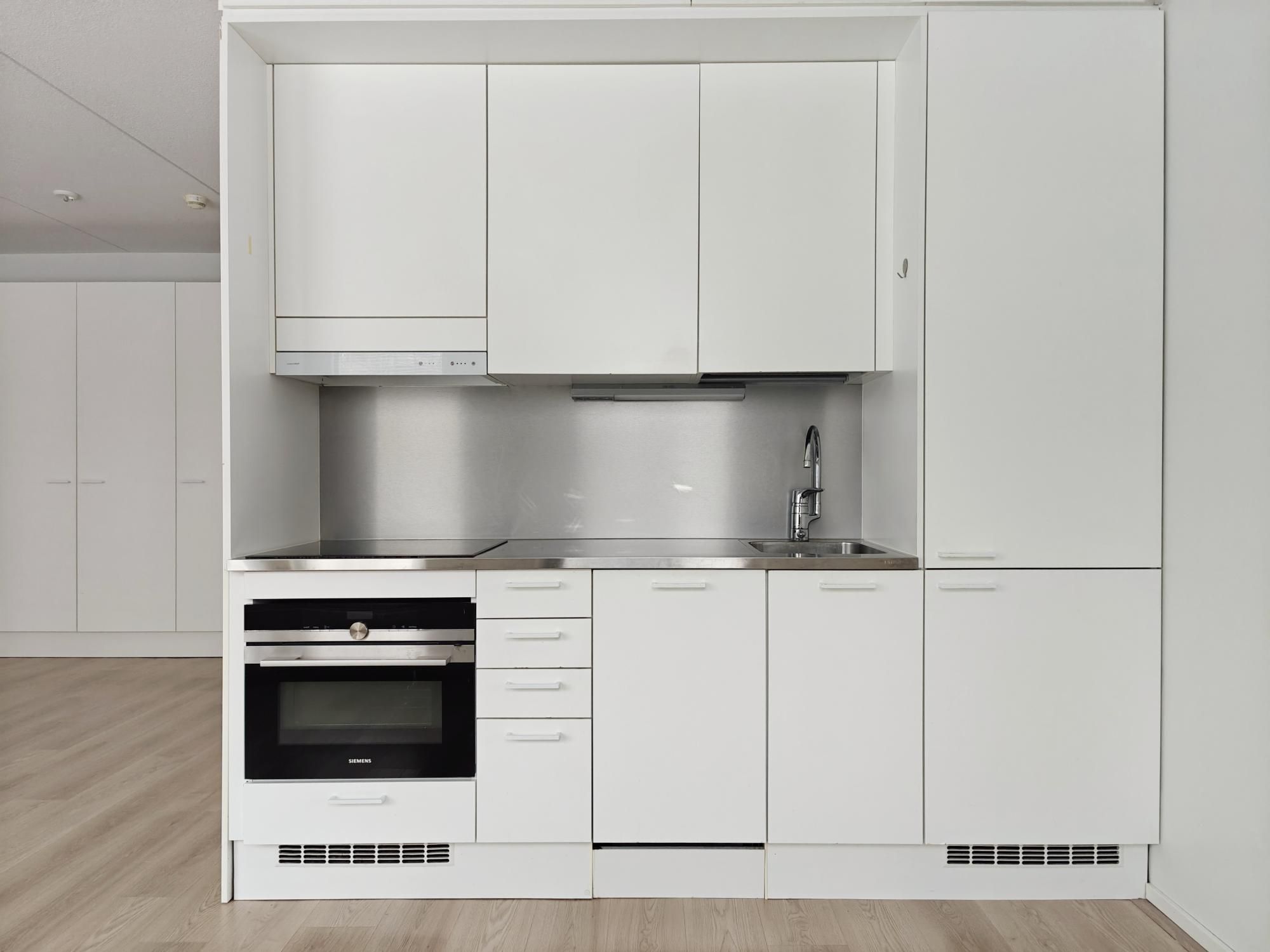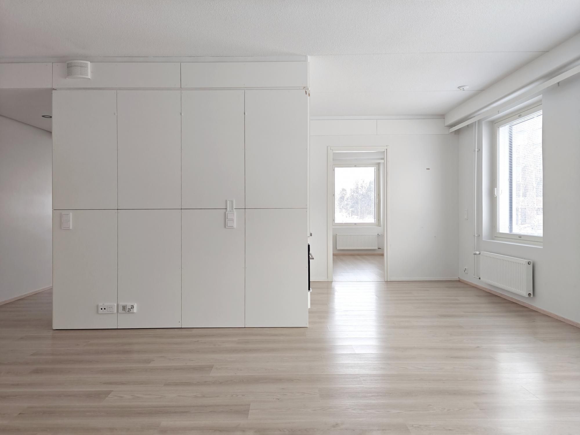 Avokeittiössä tiskikone vuokralaisen käytössä, jääkaappipakastinyhdistelmä. Seinät maalattu valkoiseksi, lattiat laminaattia. Laatoitetussa kylpyhuoneessa erillinen tila pesukoneelle ja vaikka tornillekin.