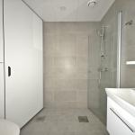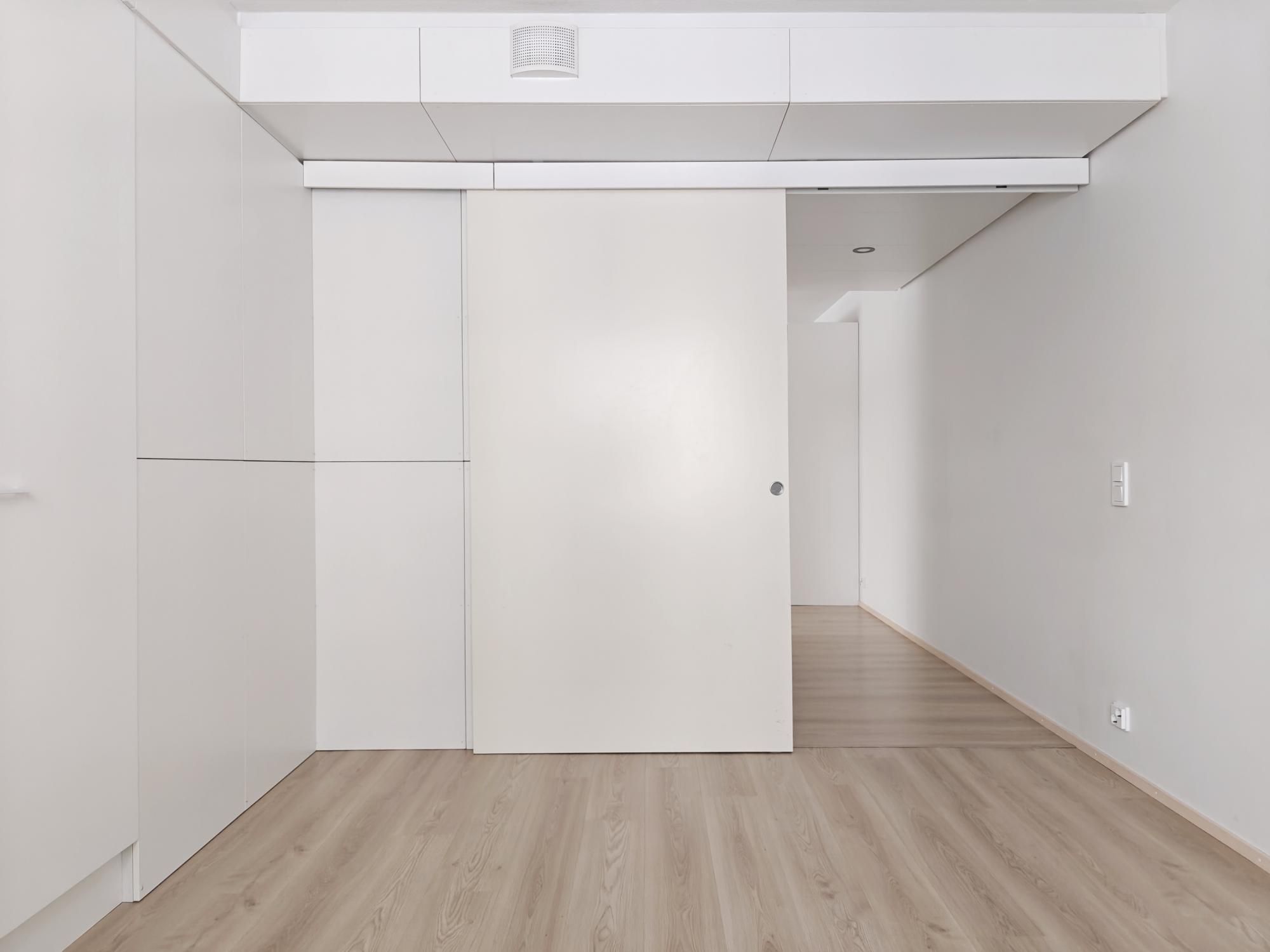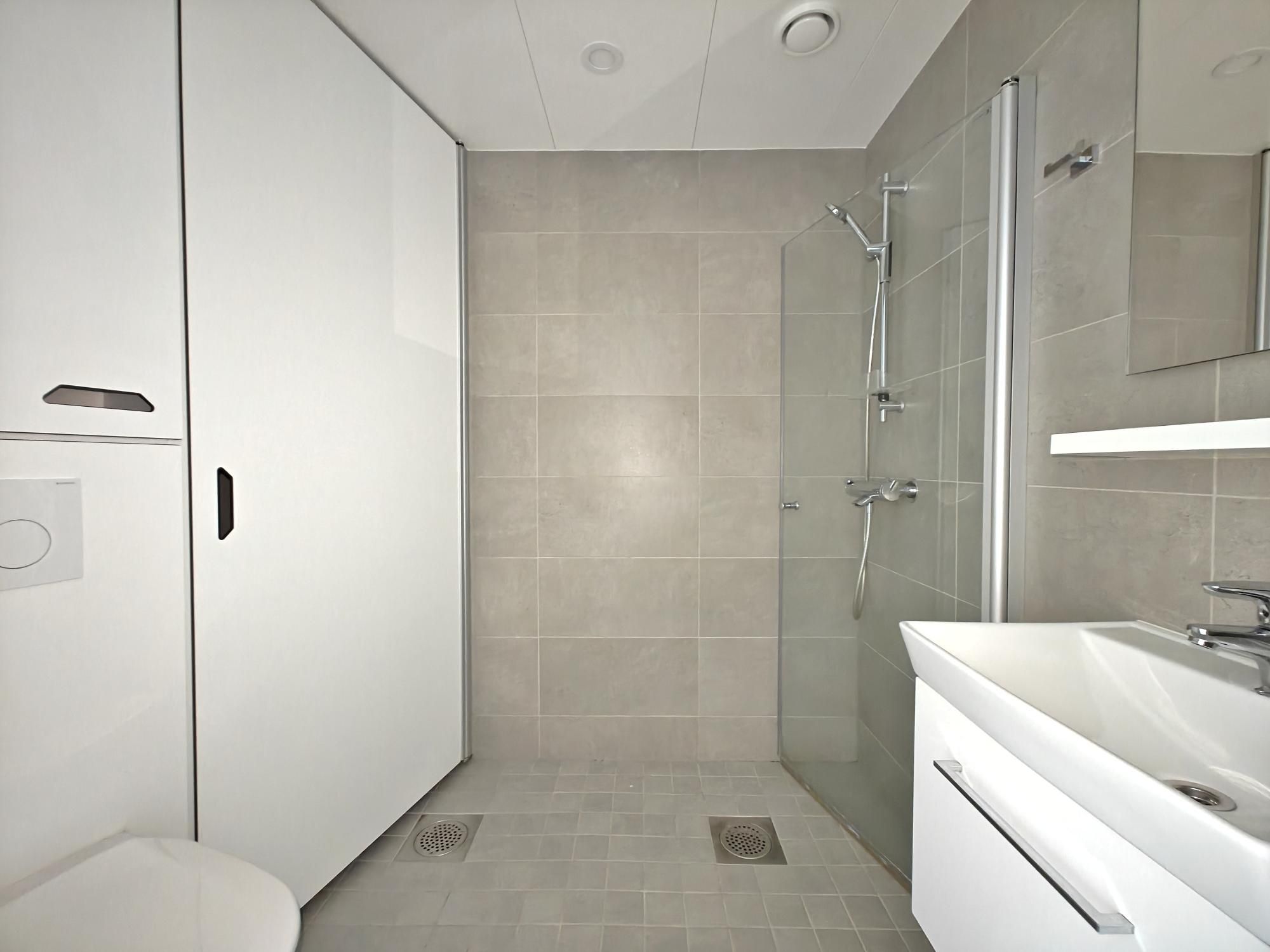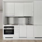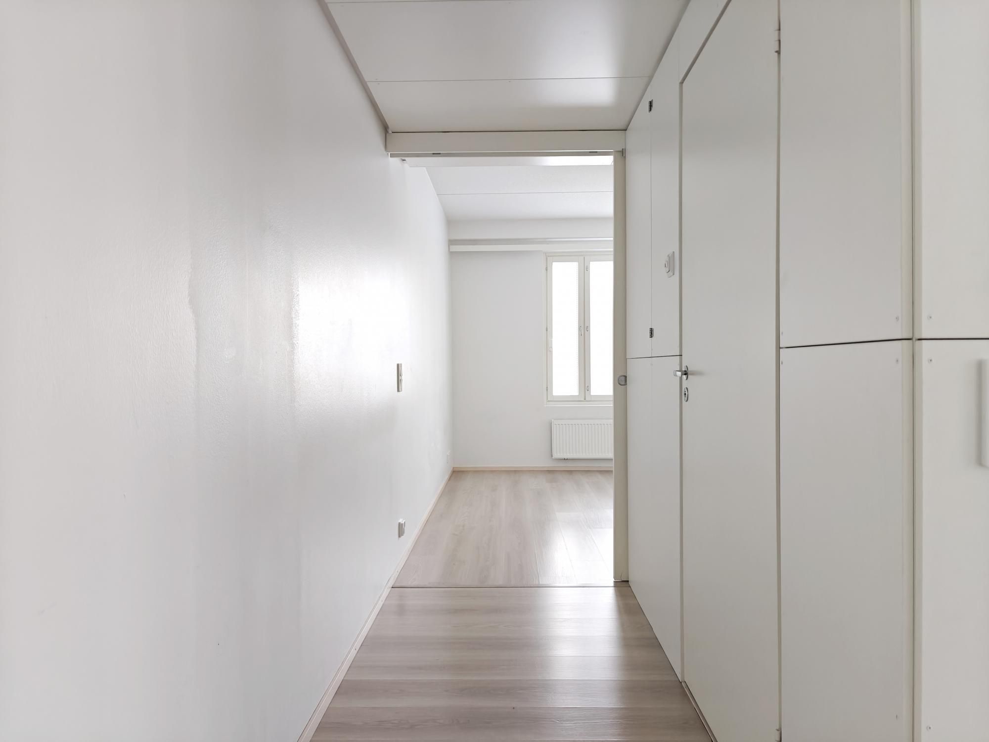 Avokeittiössä tiskikone vuokralaisen käytössä, jääkaappipakastinyhdistelmä. Seinät maalattu valkoiseksi, lattiat laminaattia. Laatoitetussa kylpyhuoneessa erillinen tila pesukoneelle ja vaikka tornillekin.