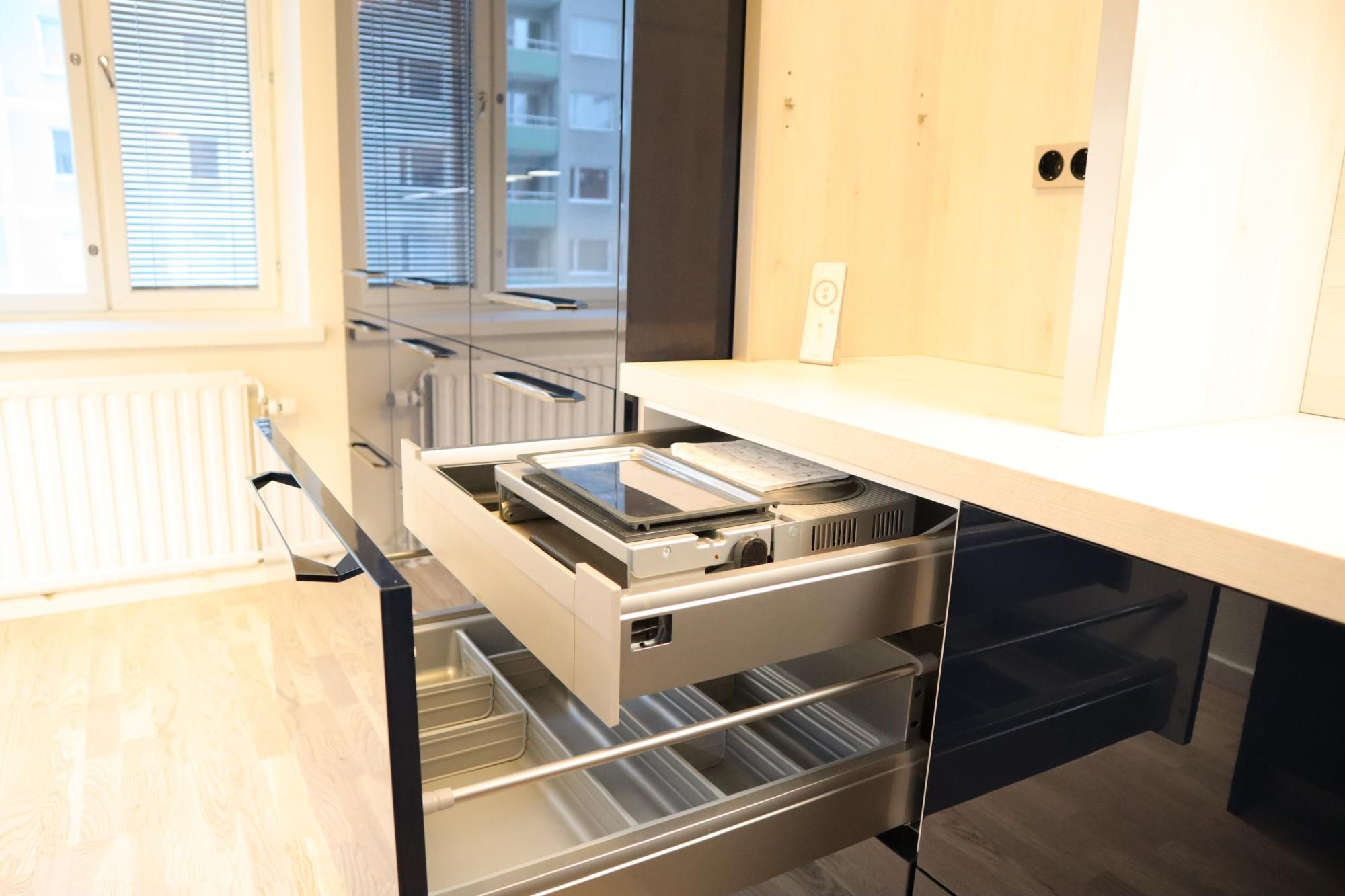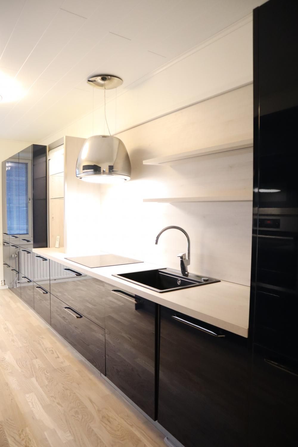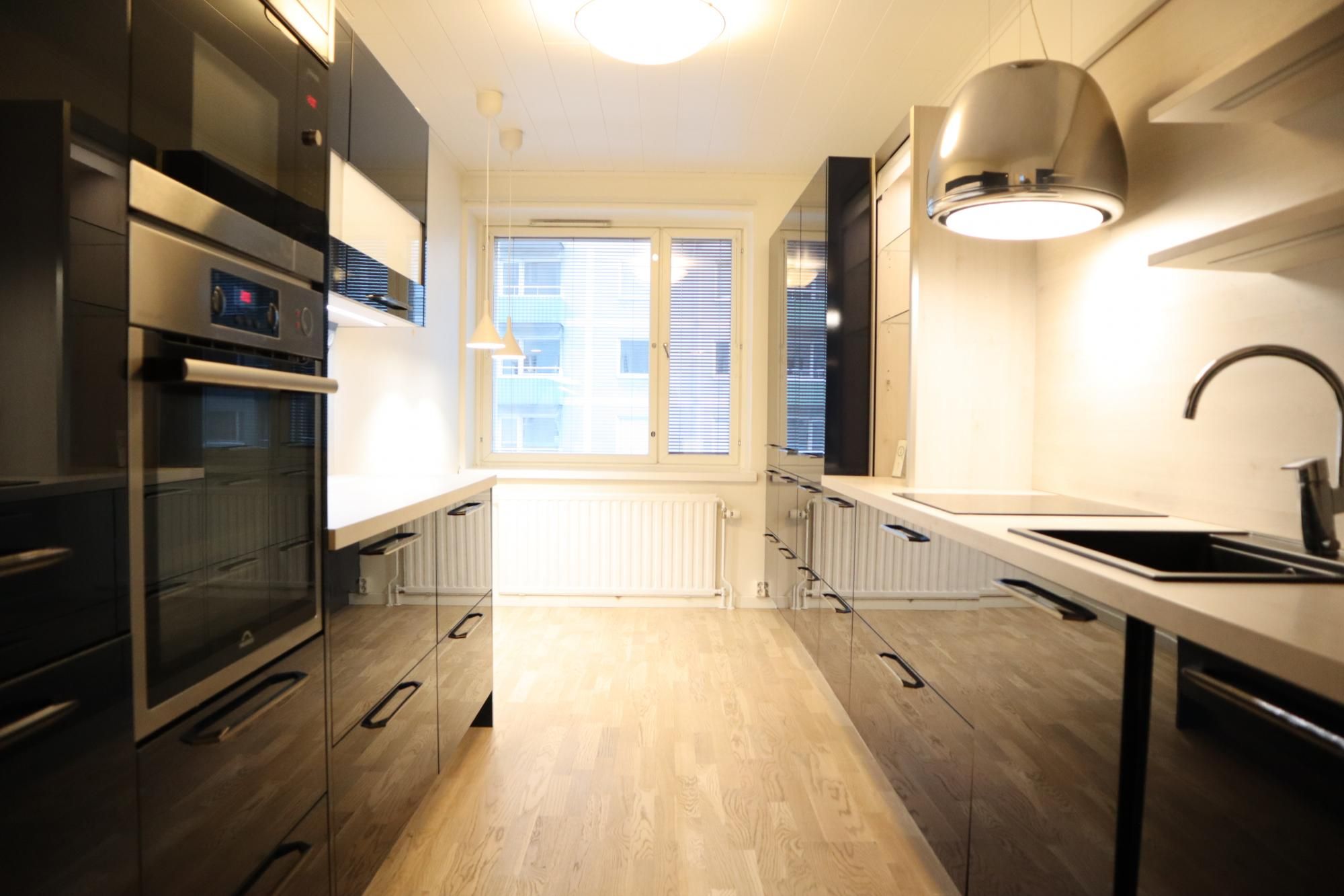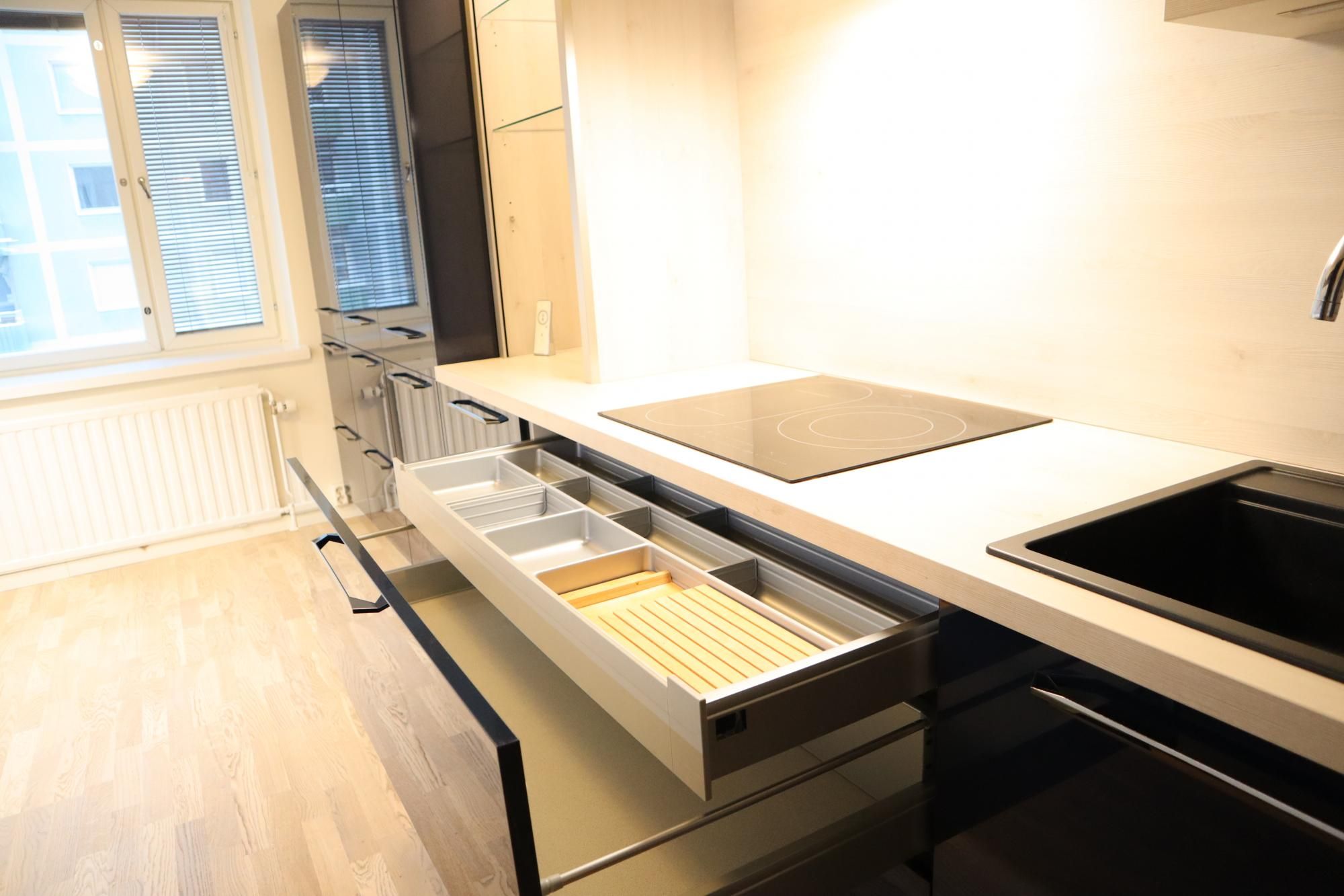 Keittiö on moderni ja suunniteltu viimeisen päälle. Vetolaatikoita on valtavan paljon. Valmiina varustuksessa on mm. integroidut astianpesukone ja jääkaappipakastin, induktioliesi, upea liesituuletin, sekä siivutuskone. Keittiöön mahtuu pieni ruokaryhmä ja varastossa on valmiina odottamassa keittiön tyyliin sopiva puolikuun mallinen pöytä. Keittiön valaistus on säädettävä.