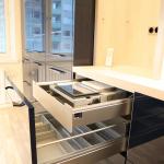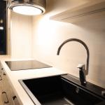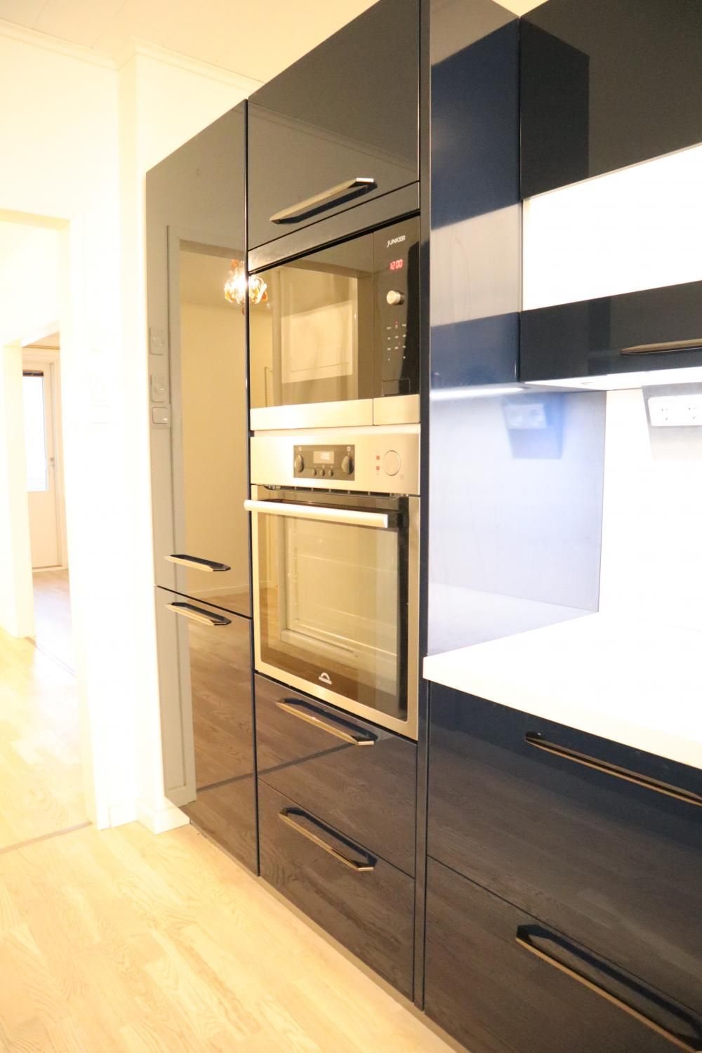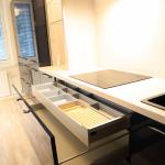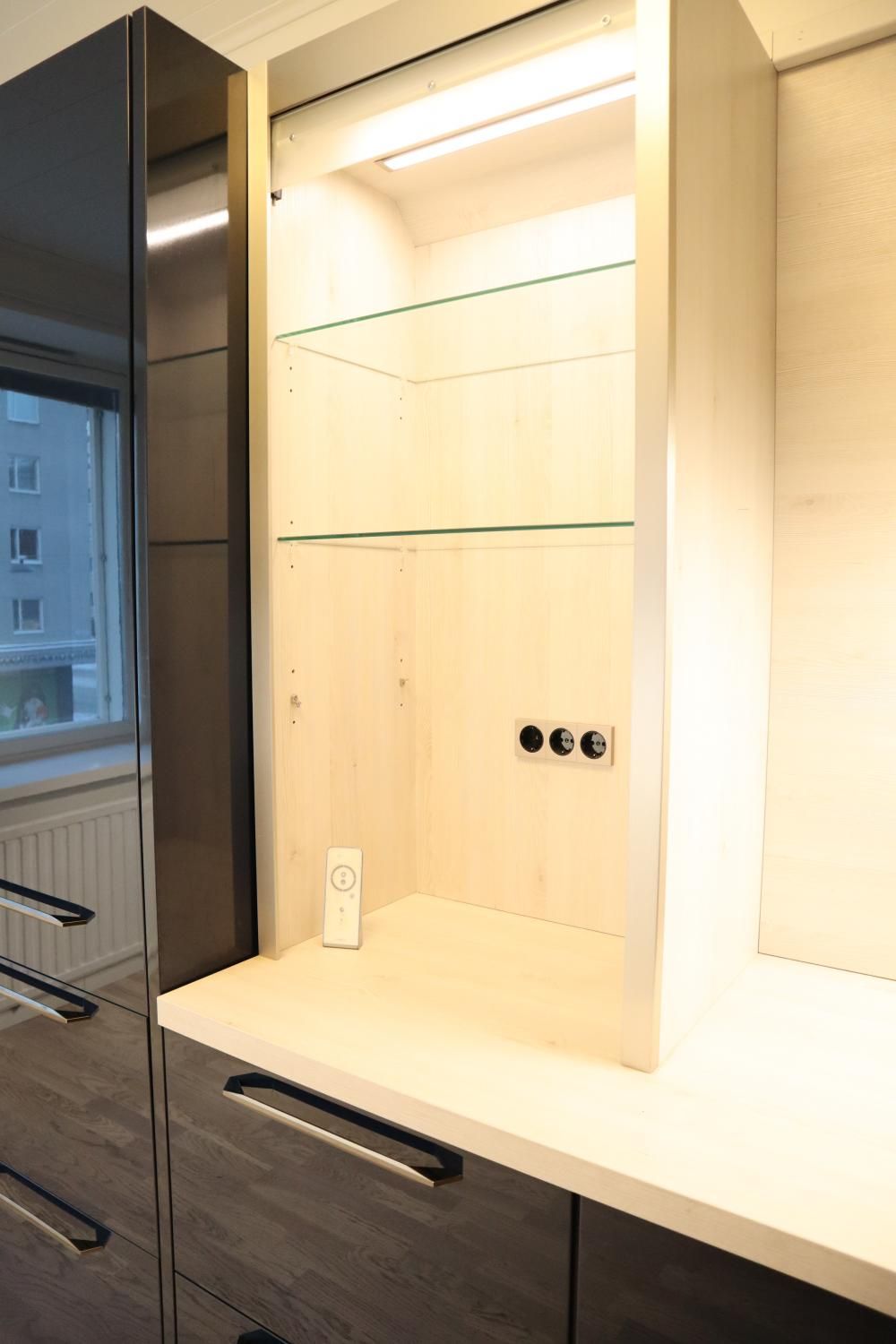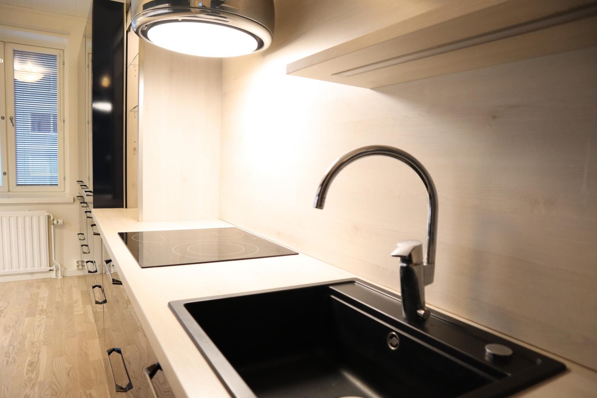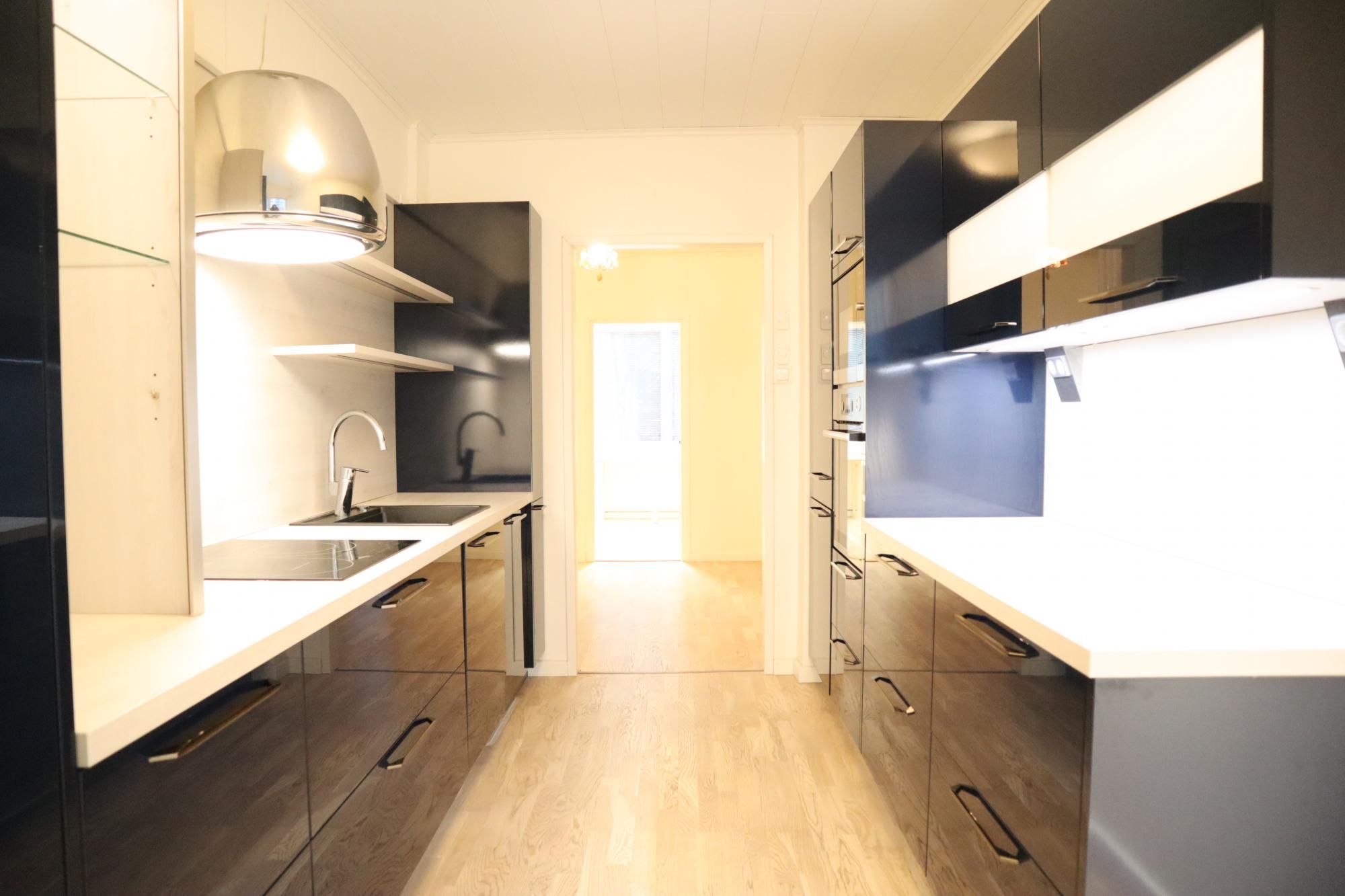 Keittiö on moderni ja suunniteltu viimeisen päälle. Vetolaatikoita on valtavan paljon. Valmiina varustuksessa on mm. integroidut astianpesukone ja jääkaappipakastin, induktioliesi, upea liesituuletin, sekä siivutuskone. Keittiöön mahtuu pieni ruokaryhmä ja varastossa on valmiina odottamassa keittiön tyyliin sopiva puolikuun mallinen pöytä. Keittiön valaistus on säädettävä.