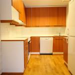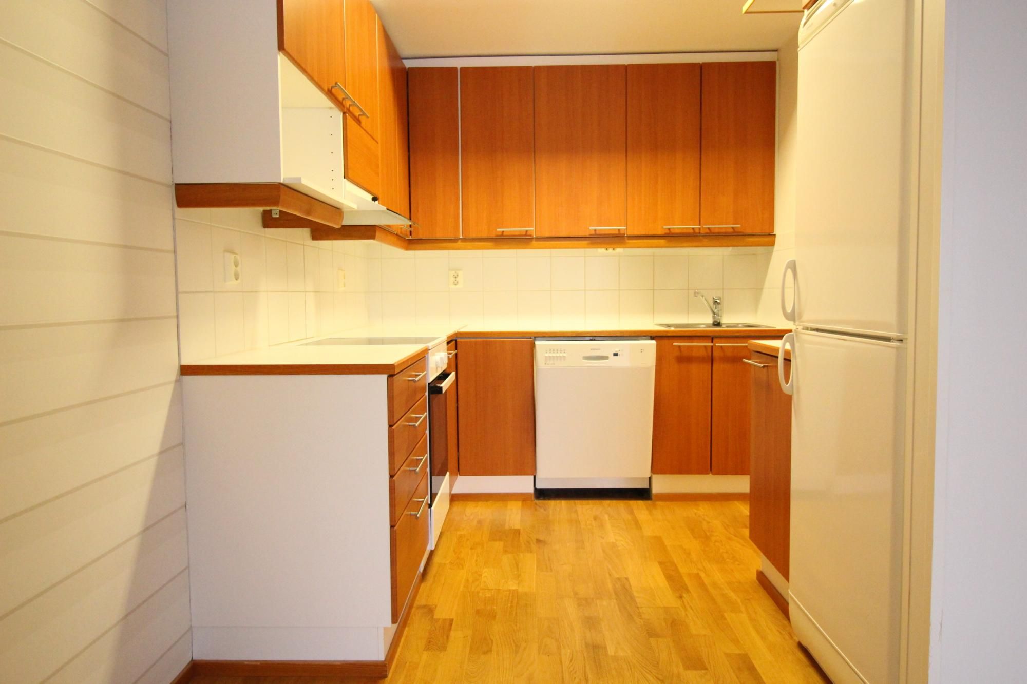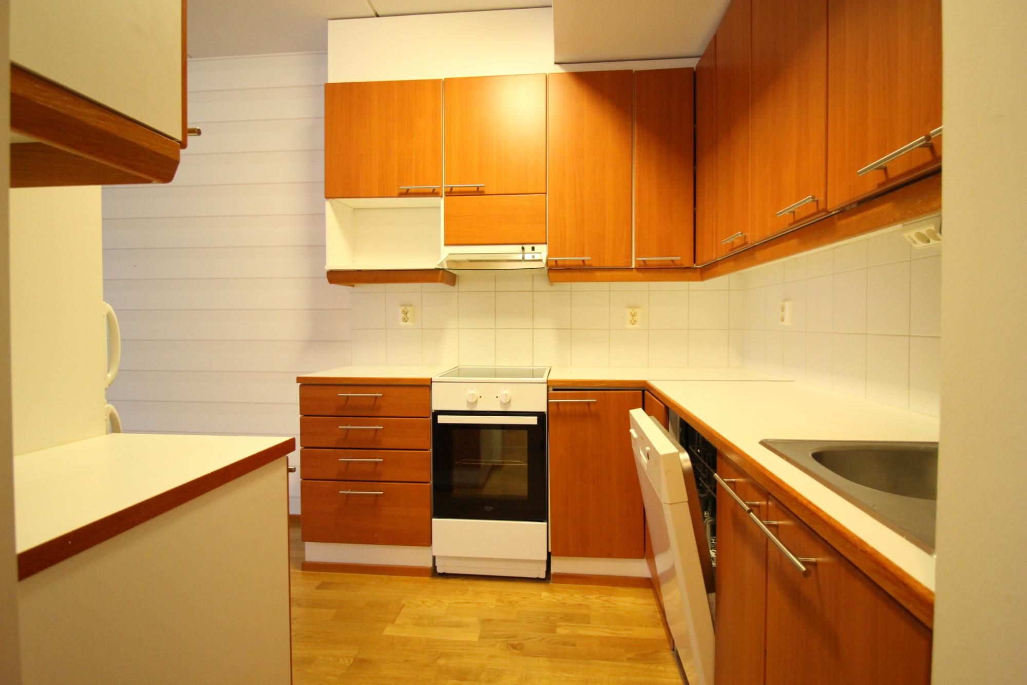 Keittiössä jää/pakastinkaappi, liesi, liesituuletin ja astianpesukone.