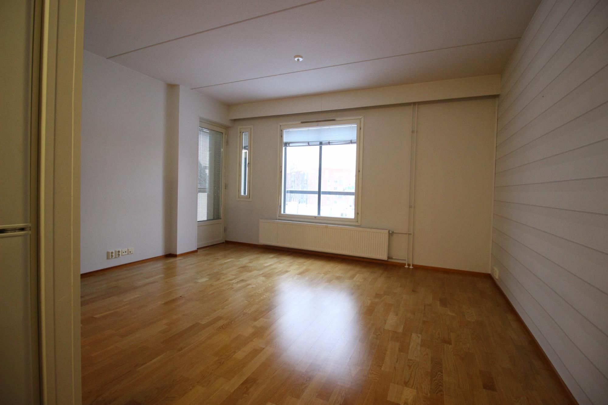 Parkettilattiat, seinät maalipinoin, ikkunoissa sälekaihtimet.