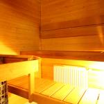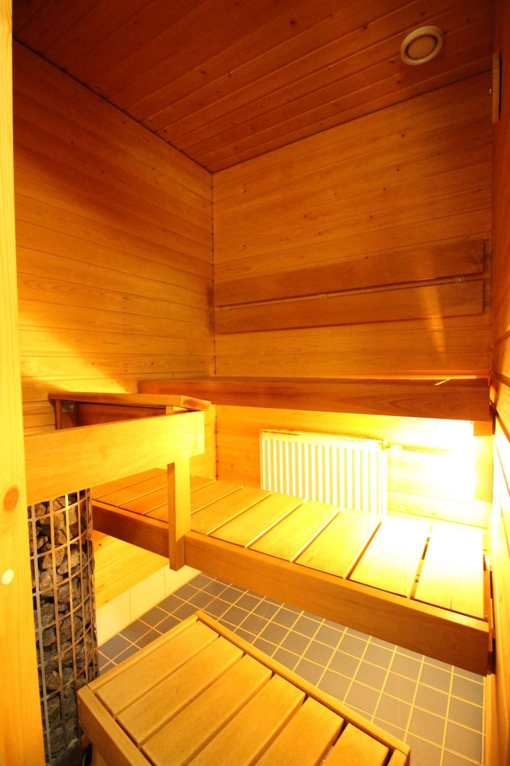 Oma sauna ja lasitettu parveke.