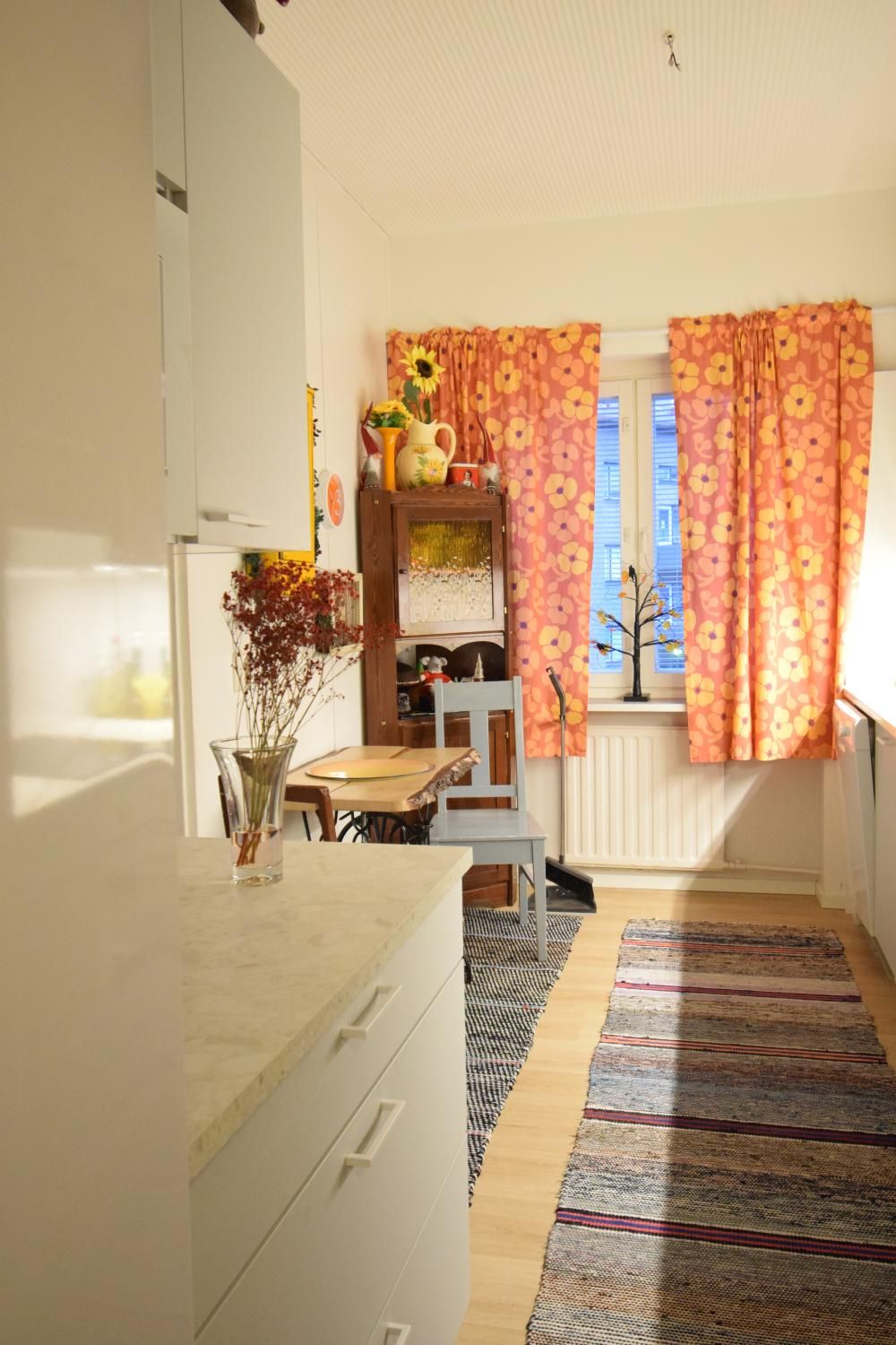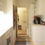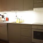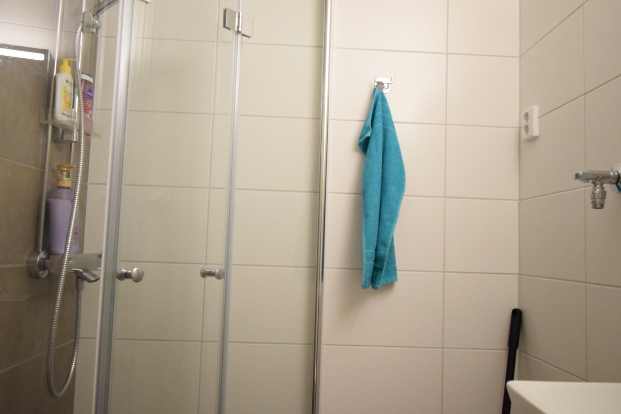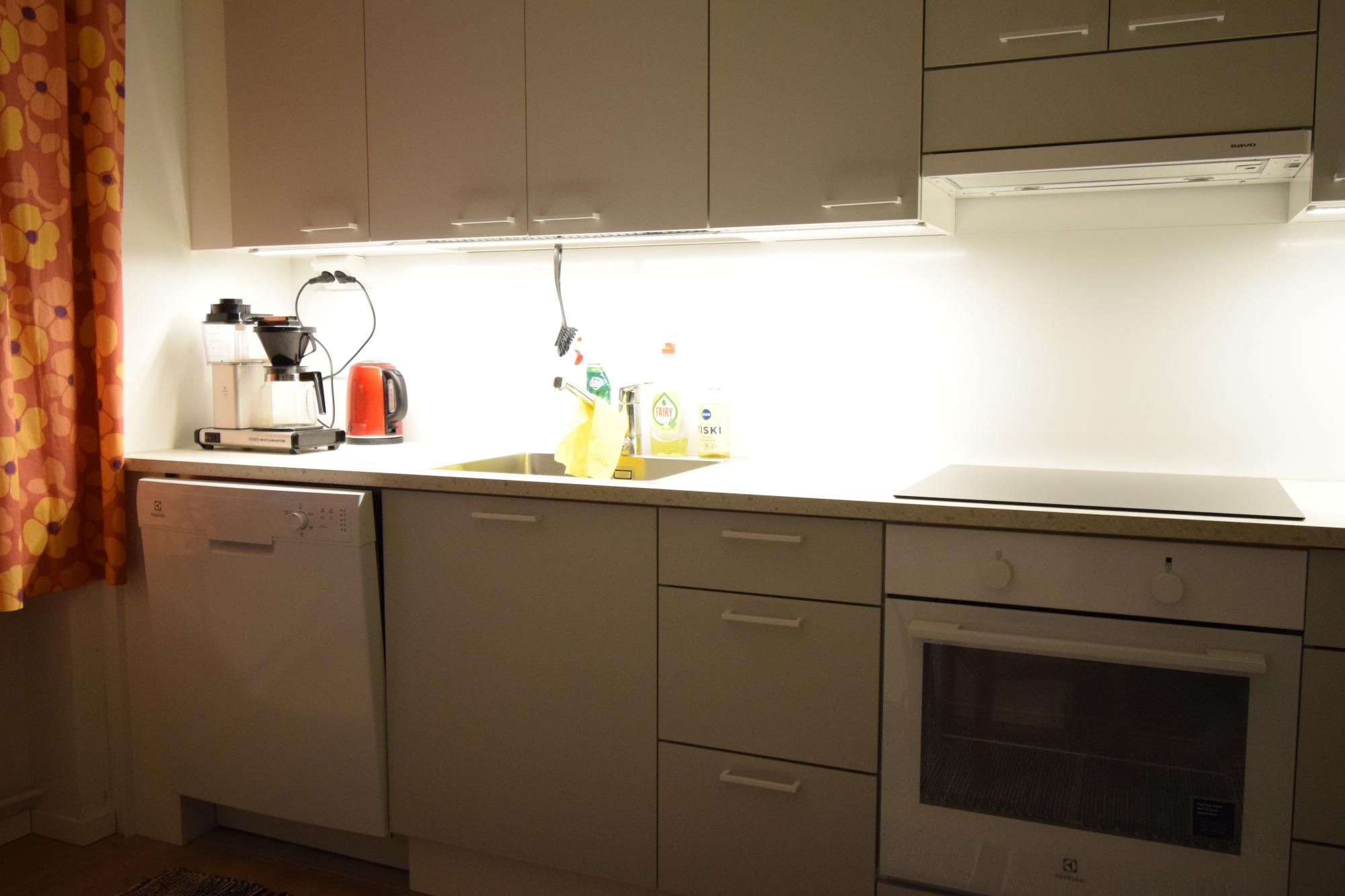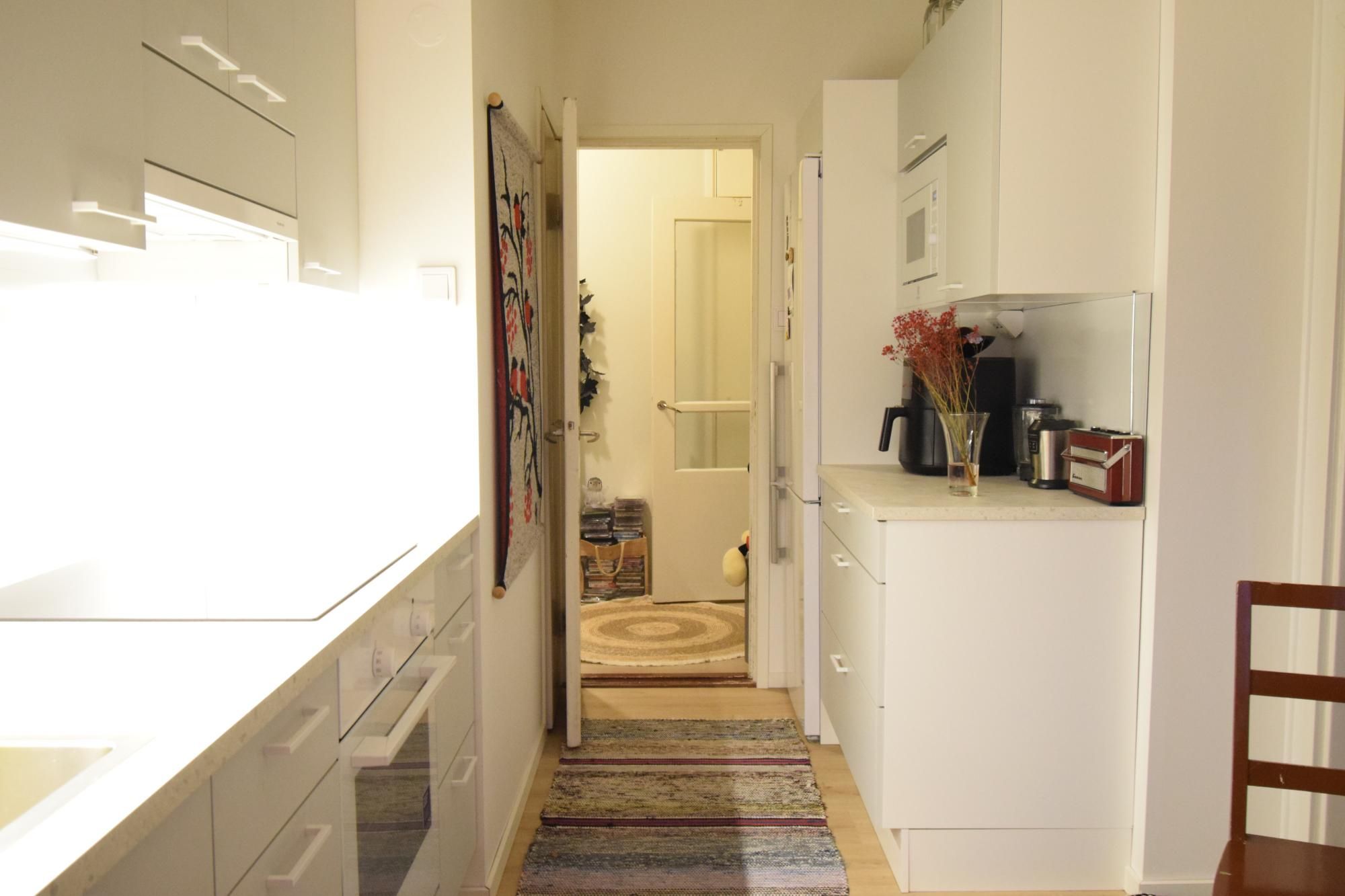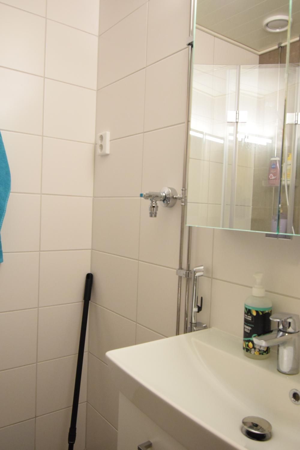 Asunnon vaalea värimaailma luo raikkaan ja viihtyisän kokonaisuuden. Keittiössä on modernit kaapistot, runsaasti säilytystilaa sekä varustuksena jääkaappi-pakastin, liesi ja liesituuletin. Kaakeloidussa kylpyhuoneessa on paikka pesukoneelle. Keittiö ja kylpyhuone on remontoitu putkiremontin yhteydessä.