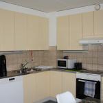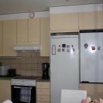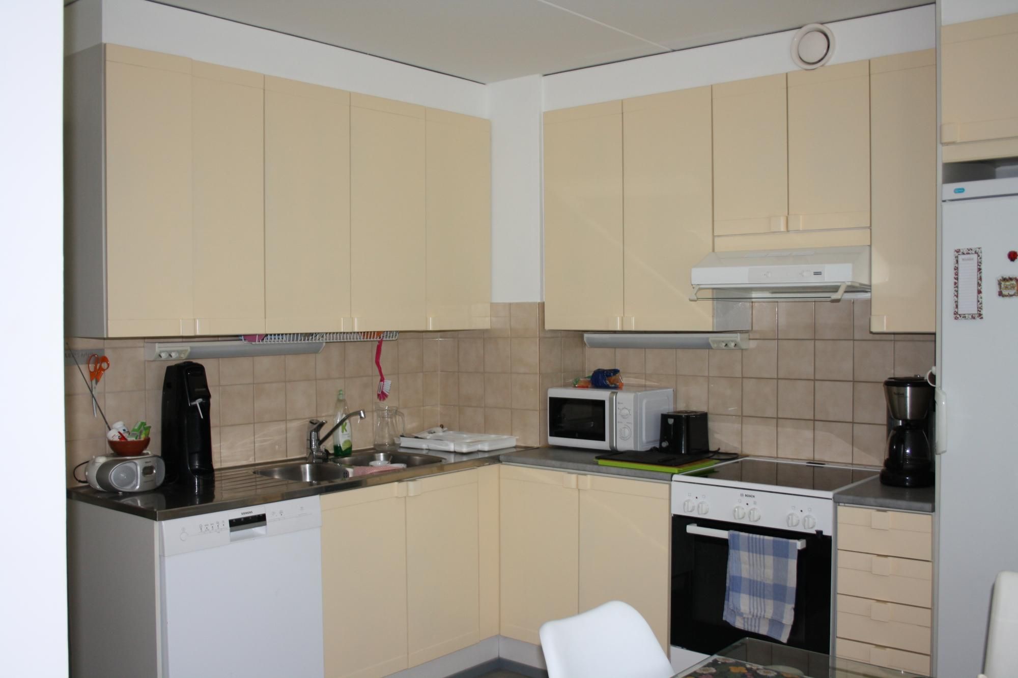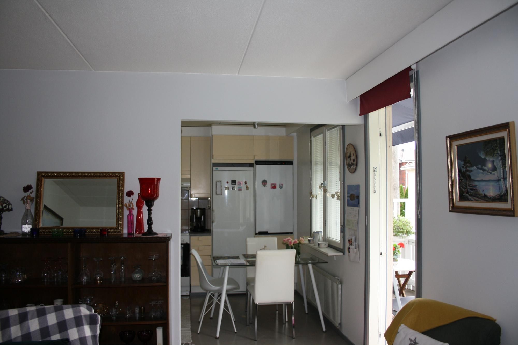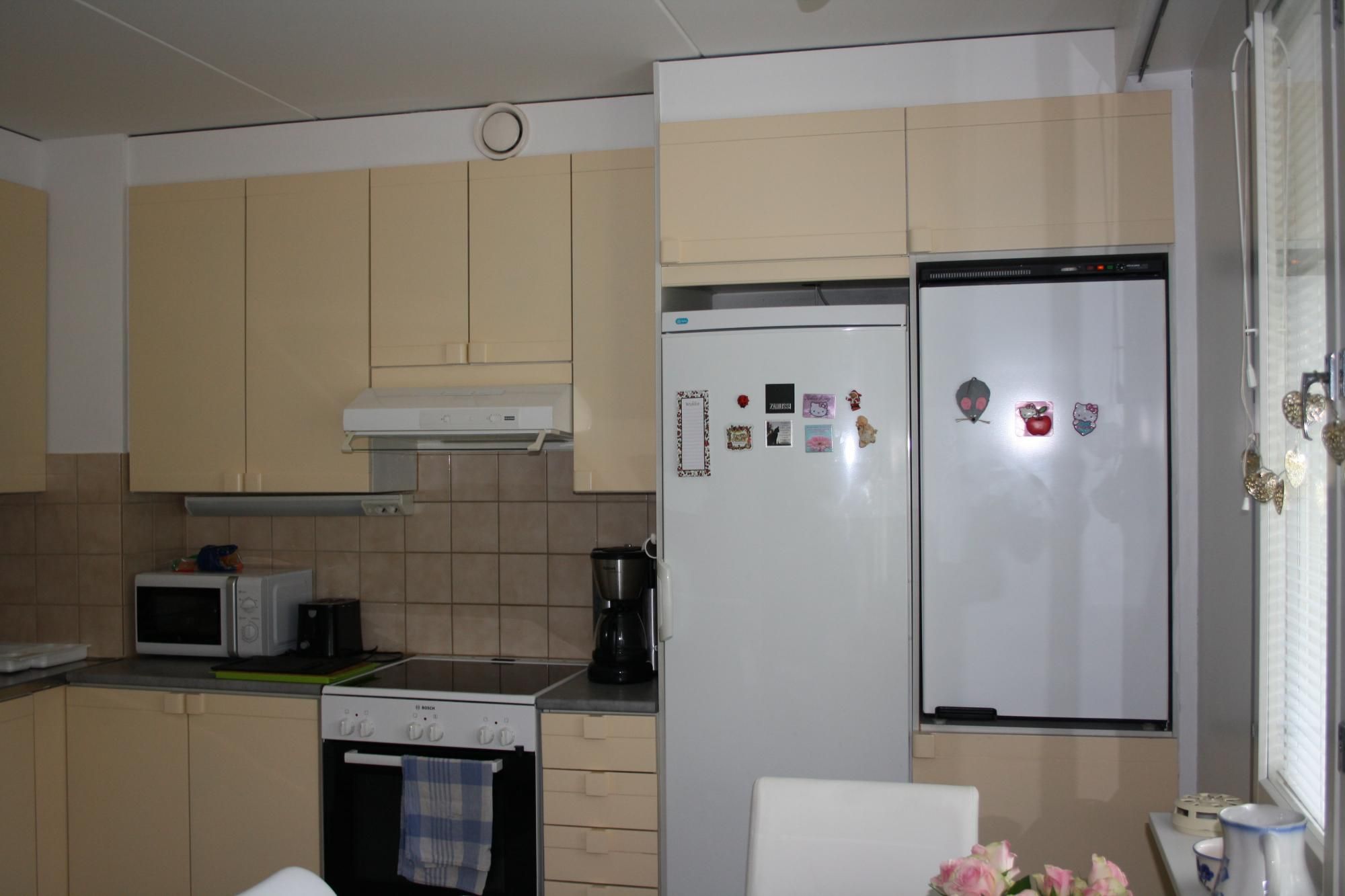 Asunnossa kauniit värit ja toimiva pohjaratkaisu. Keittiön varustukseen kuuluu astianpesukone, tilava jääkaappi ja erillinen pakastin ja keraaminen liesi.