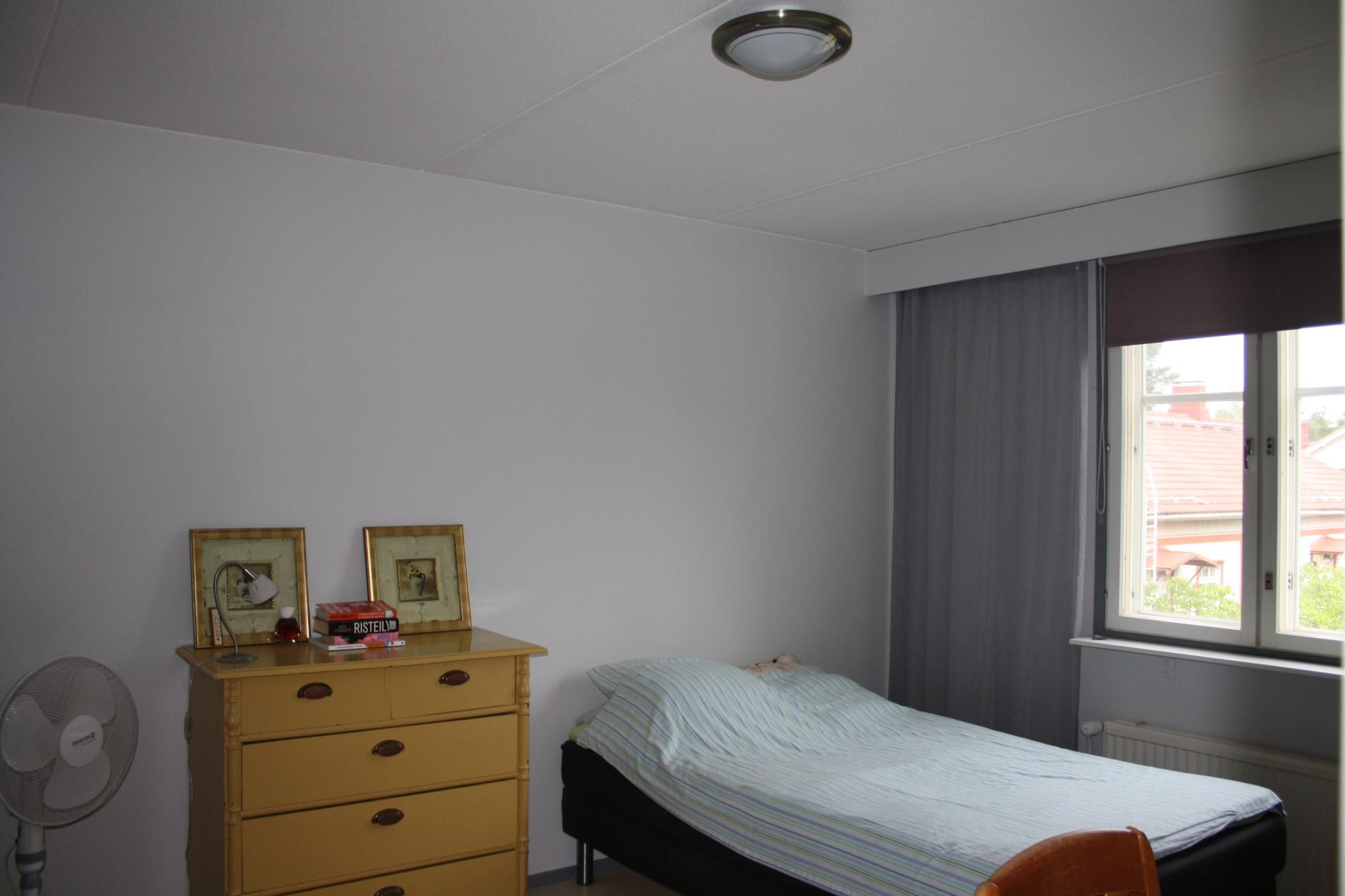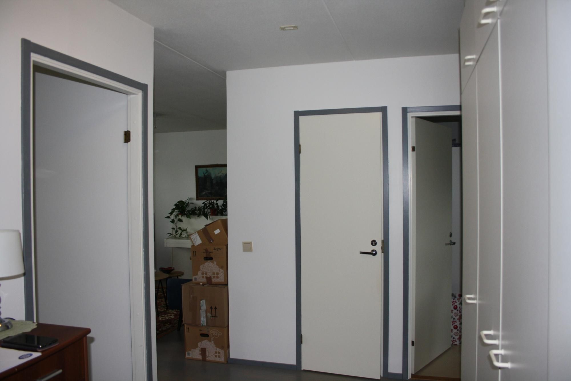 Tilava, ikkunallinen vaatehuone ja kaapistot makuuhuoneessa ja eteisessä.
