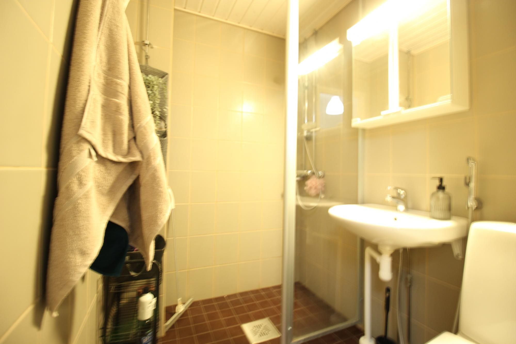 Kylpyhuoneessa pyykinpesukoneliitäntä. Taloyhtiössä pyykkitupa ja kuivaushuone.