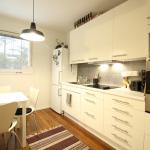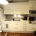 Tyylikkäässä keittiössä jää-/pakastinkaappi, keraaminen liesi, liesituuletin ja kiertoilmauuni.