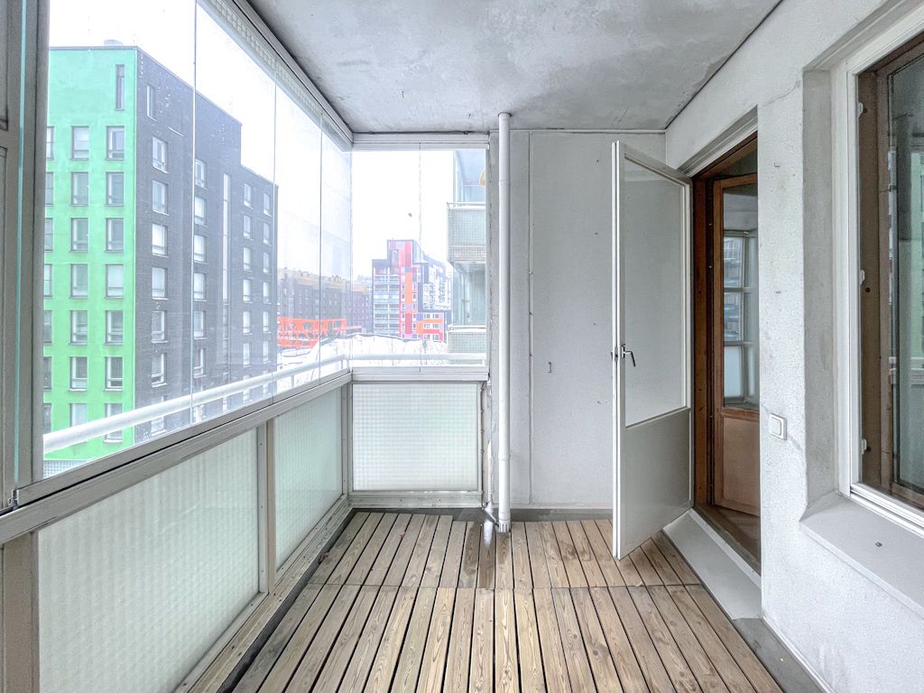Tilava 1h + tupakeittiö (käytännössä pieni kaksio) lasitetulla parvekkeella Ruoholahden kanavan läheisyydessä. Tämä asunto soveltuu pyörätuolia tai muita apuvälineitä käyttävälle henkilölle.
