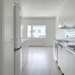 Siisti ja valoisa koti Hermannissa. Keittiössä pyörillä liikuteltava apupöytä ja paikka astianpesukoneelle. Kylpyhuoneessa pyykinpesukoneliitäntä.