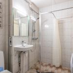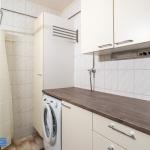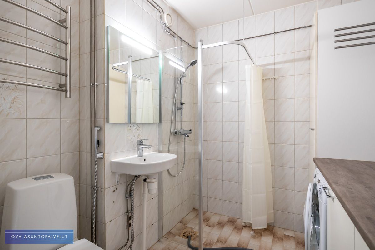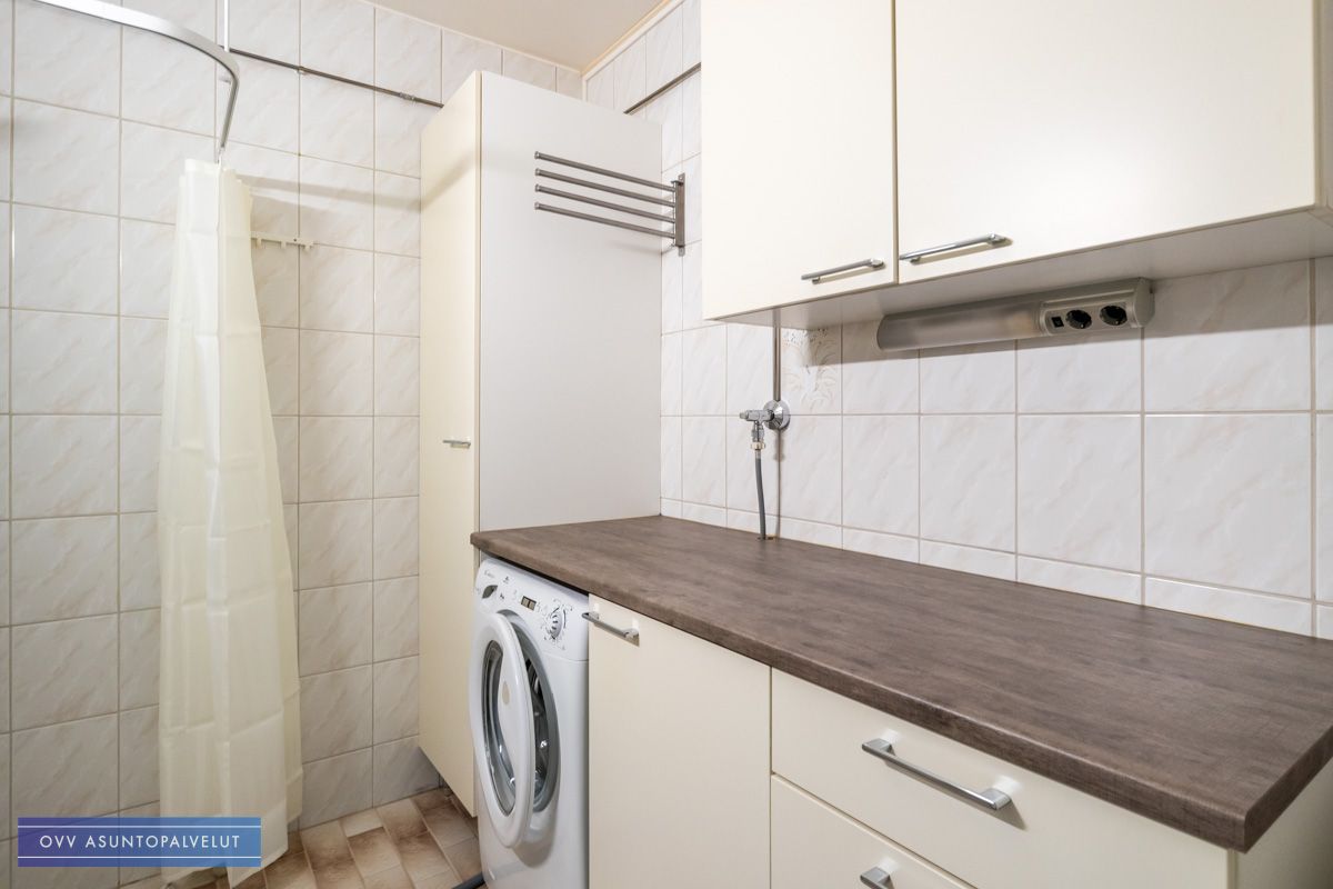 Kylpyhuone on erittäin tilava ja se toimii samalla kodinhoitohuoneena, sillä sinne on lisätty paljon säilytystilaa ja valmiiksi pyykinpesukone (kone uusittu kuvien ottamisen jälkeen).
