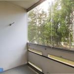 Olohuoneesta käynti lasitetulle parvekkeelle, josta näkymä talon metsäiselle takapihalle.