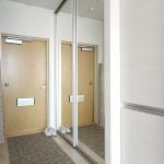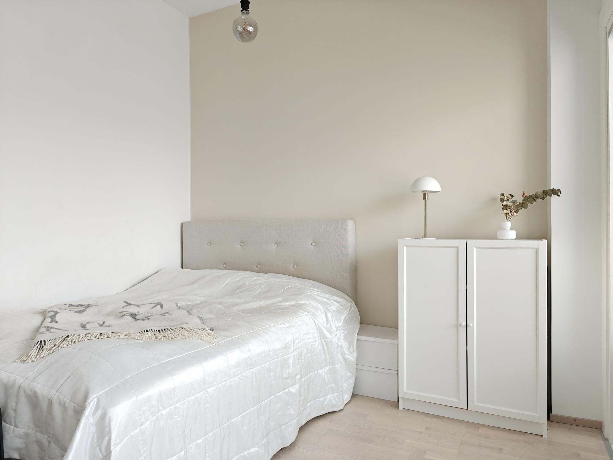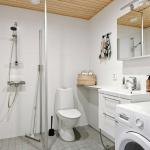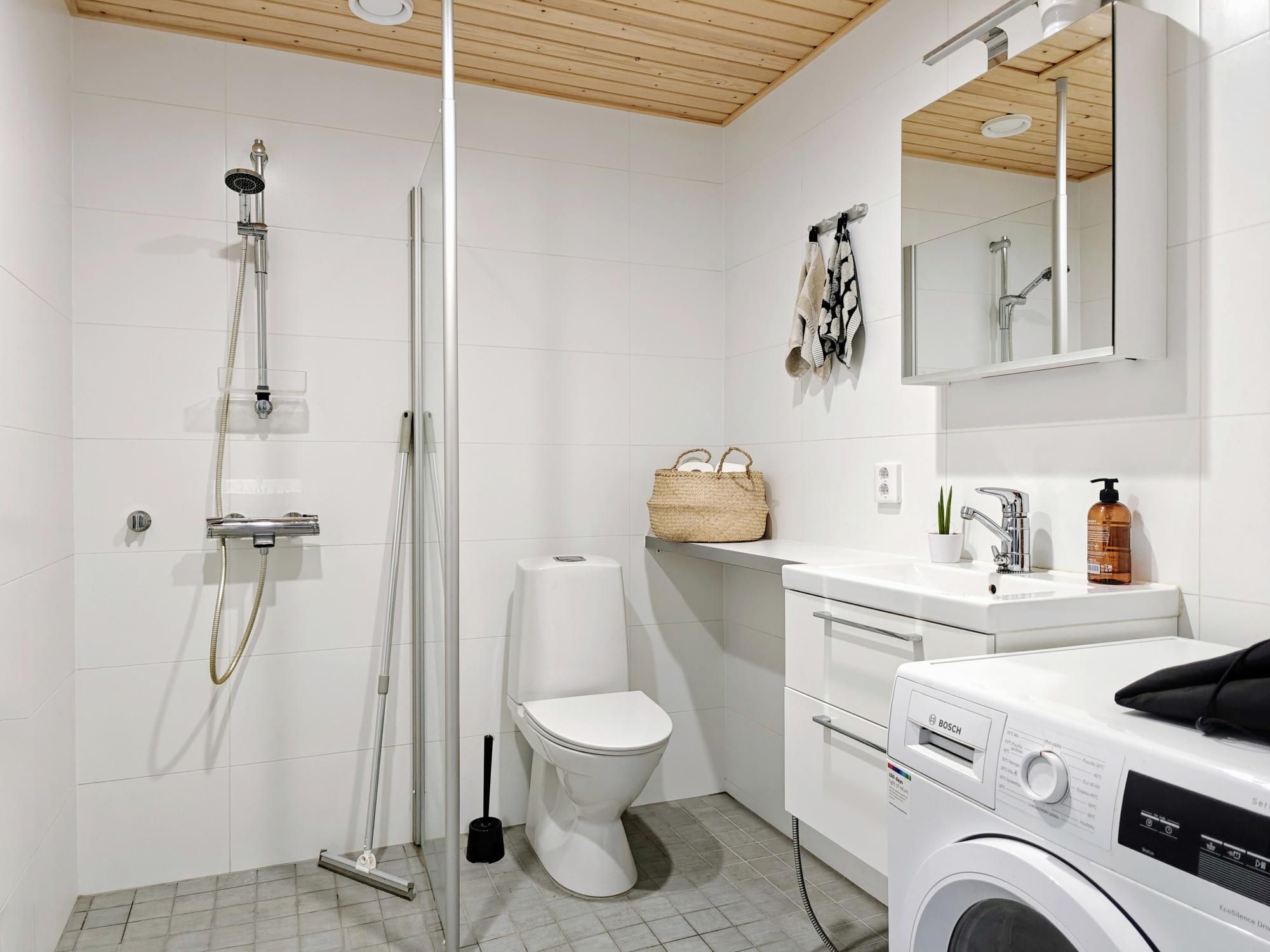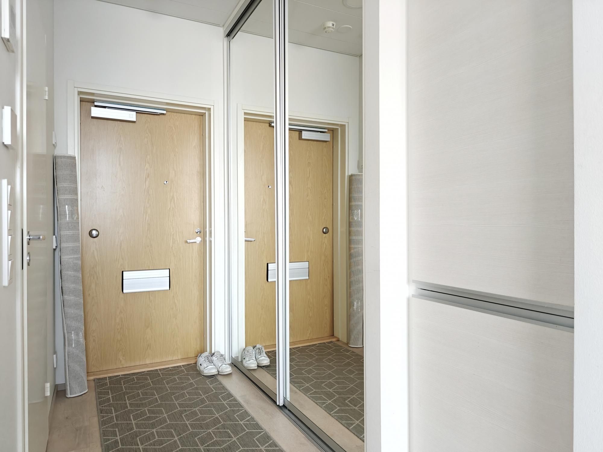Eteisessä ja makuuhuoneessa mukavasti kiinteätä säilytystilaa. Tilavassa kylpyhuoneessa myös tila ja liitäntä isommallekin pyykinpesukoneelle.