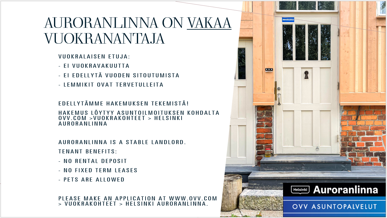 Please submit application at www.ovv.com > vuokrakohteet > Helsinki Auroranlinna or straight link from Oikotie and Vuokraovi.