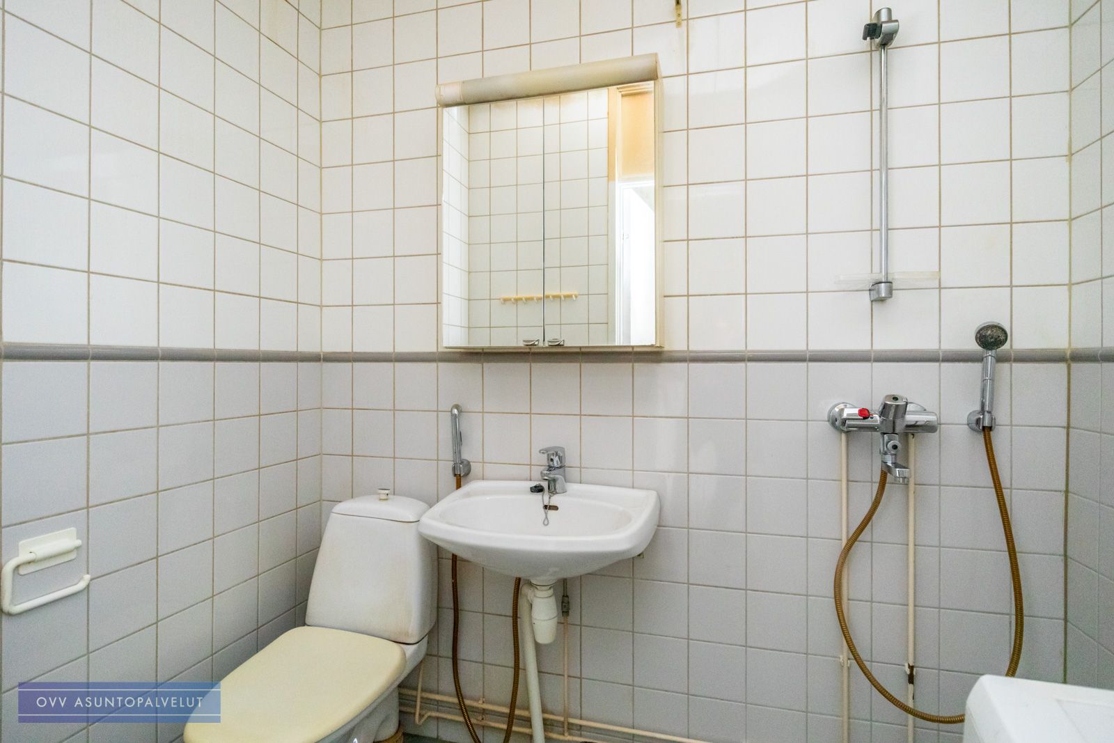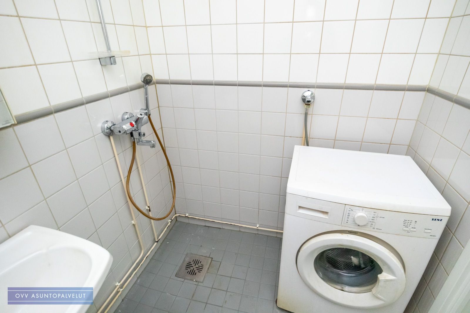Kylpyhuone kauttaaltaan laatoitettu ja sieltä löytyy paikka ja liitännät pyykinpesukoneelle.