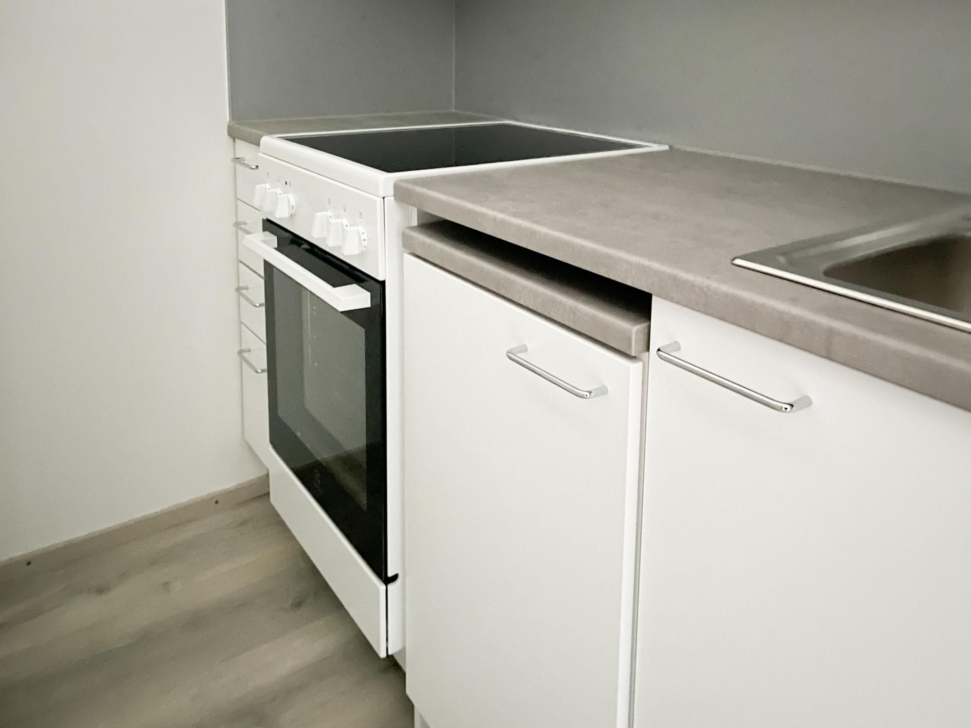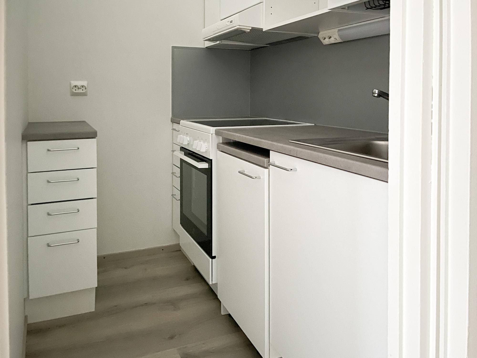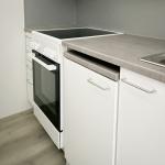 Keittiössä paikka kapealle astianpesukoneelle ja pyykinpesukoneliitäntä löytyy kylpyhuoneesta.