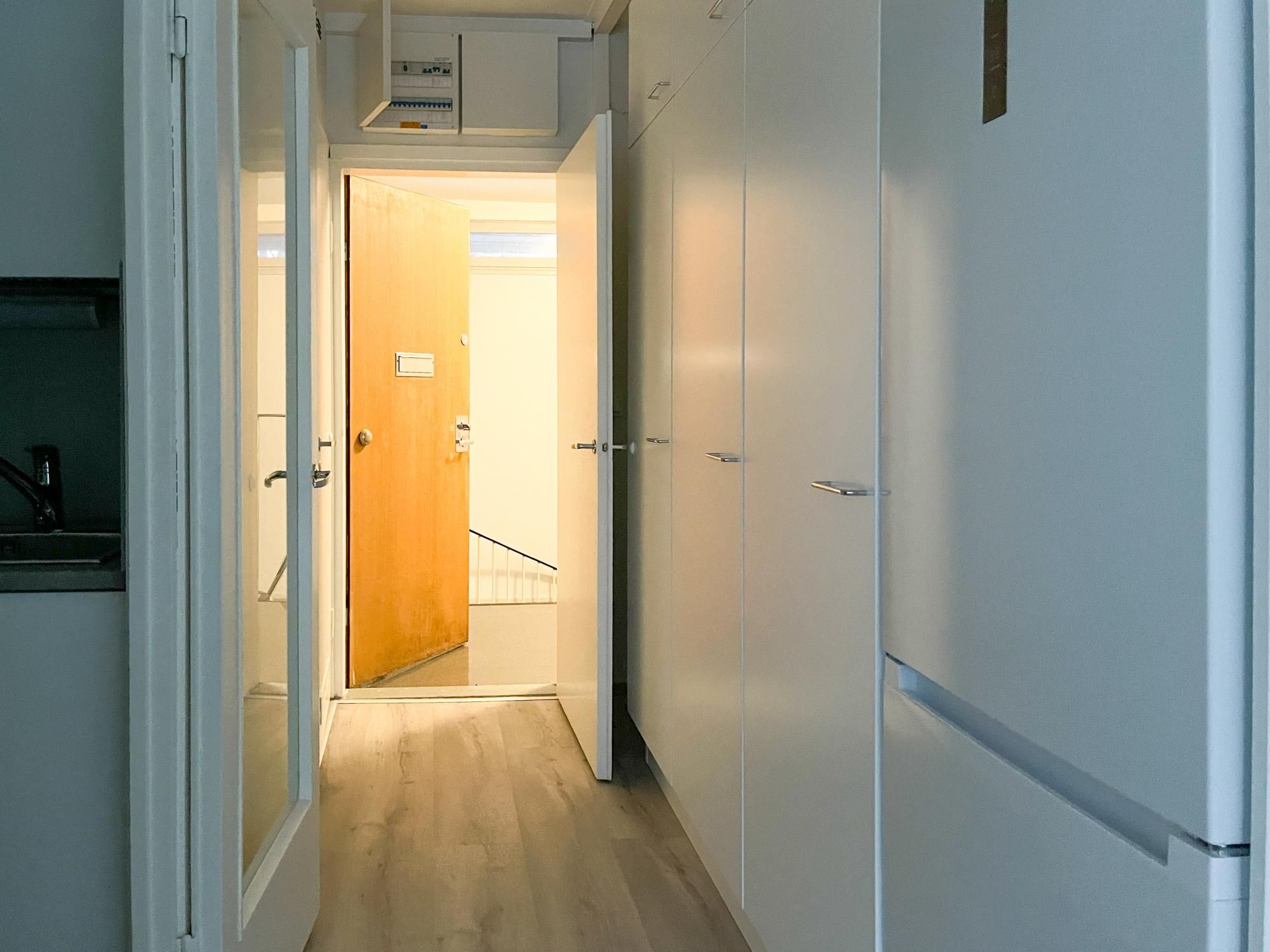 Ylimmän kerroksen kauniisti vaalein sävyin remontoitu kompakti koti.