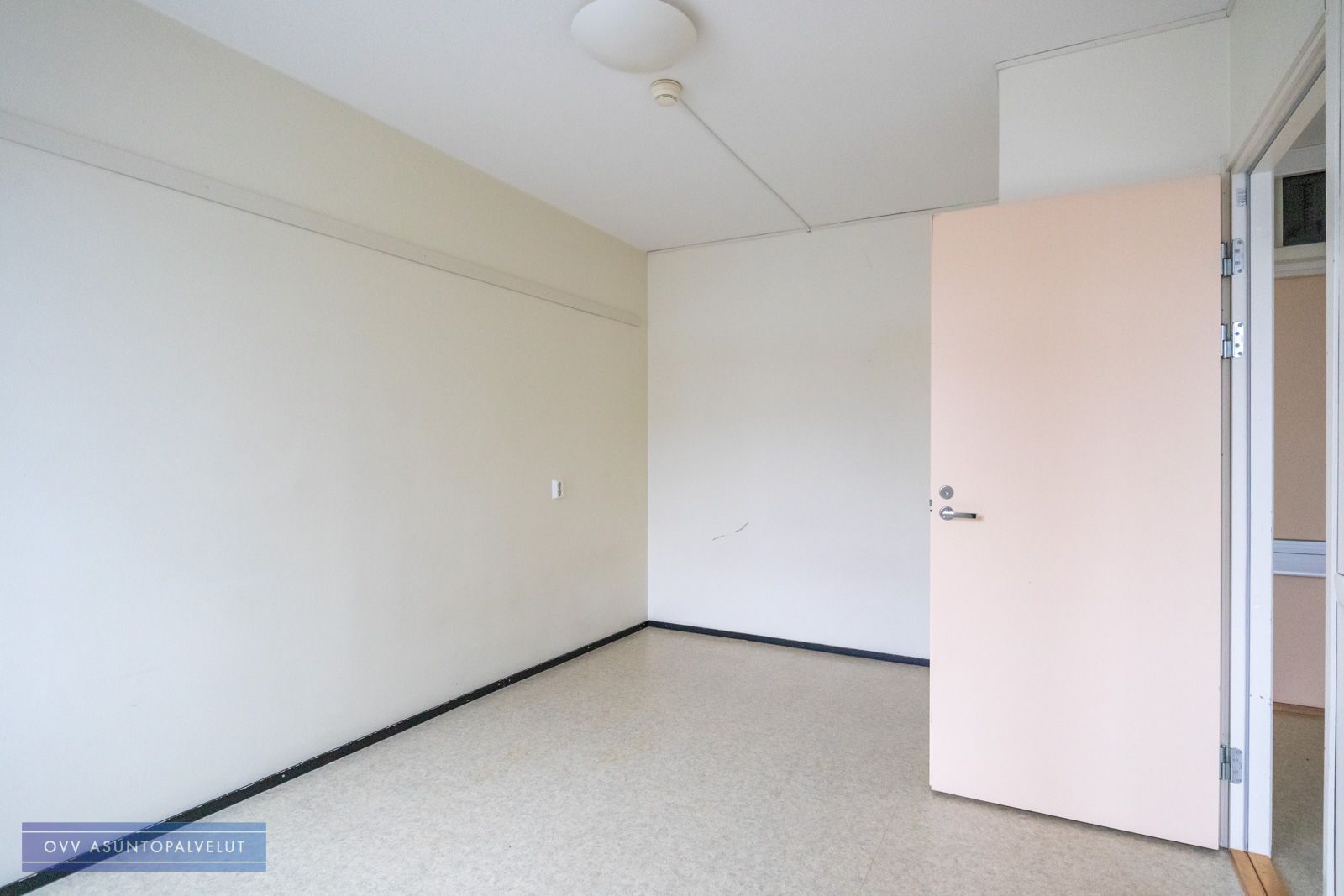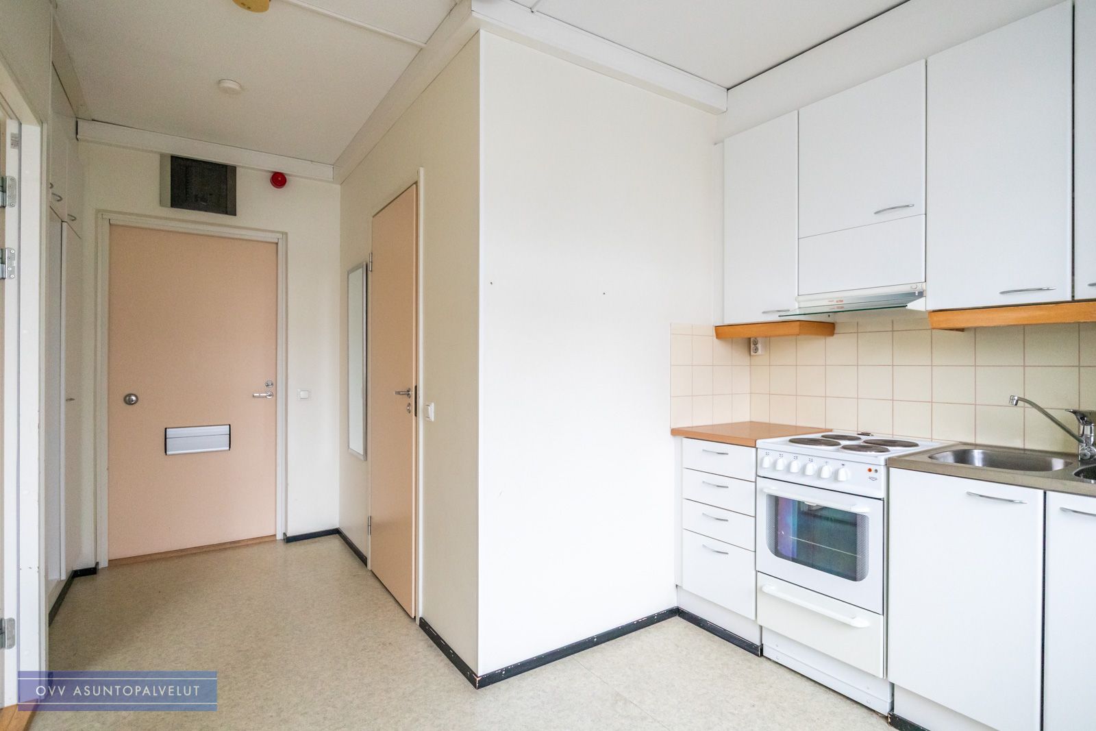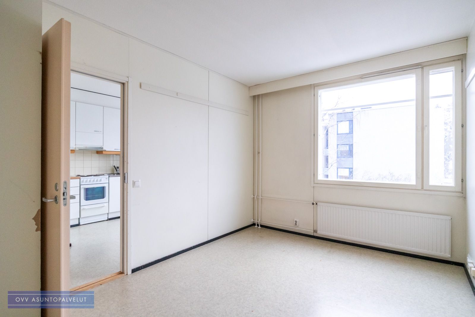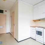 Asunnossa on hyvä pohjaratkaisu, jossa keittiö ja eteistila ovat yhtä tilaa ja oven takana on toinen huone, joka toimii olohuoneena sekä makuuhuoneena.