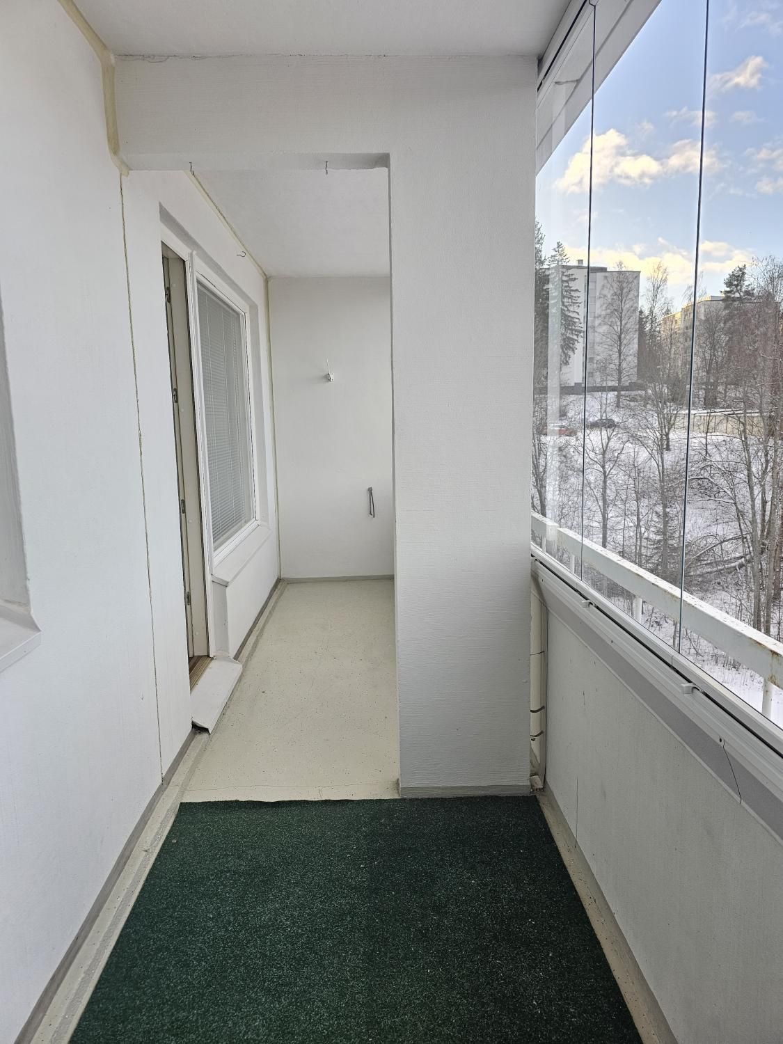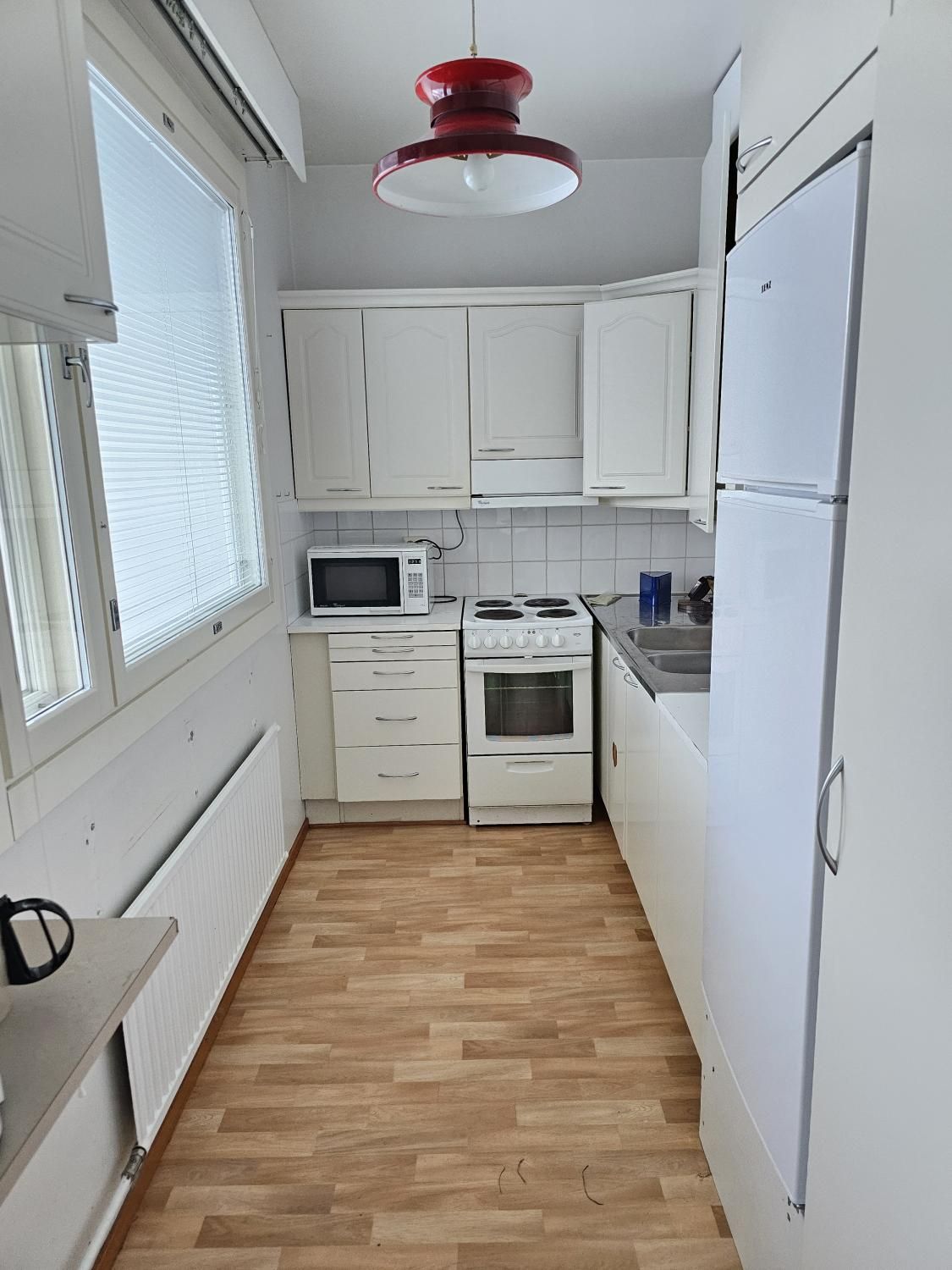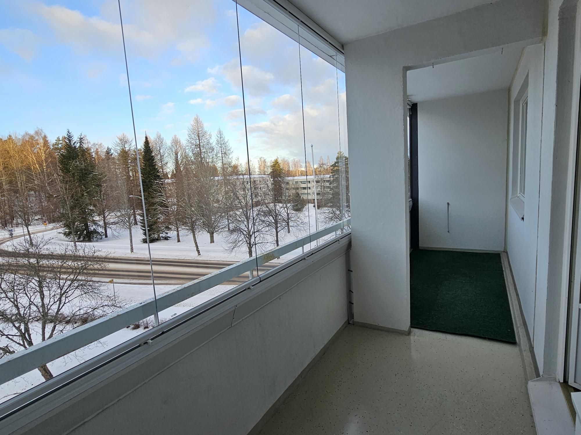 Asunnossa ikkunallinen keittokomero, laatoitettu kh pesukonevalmiudella sekä lasitettu huoneiston levyinen parveke.