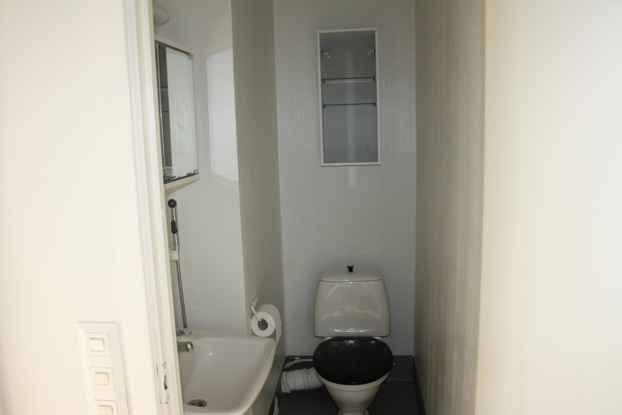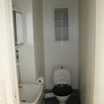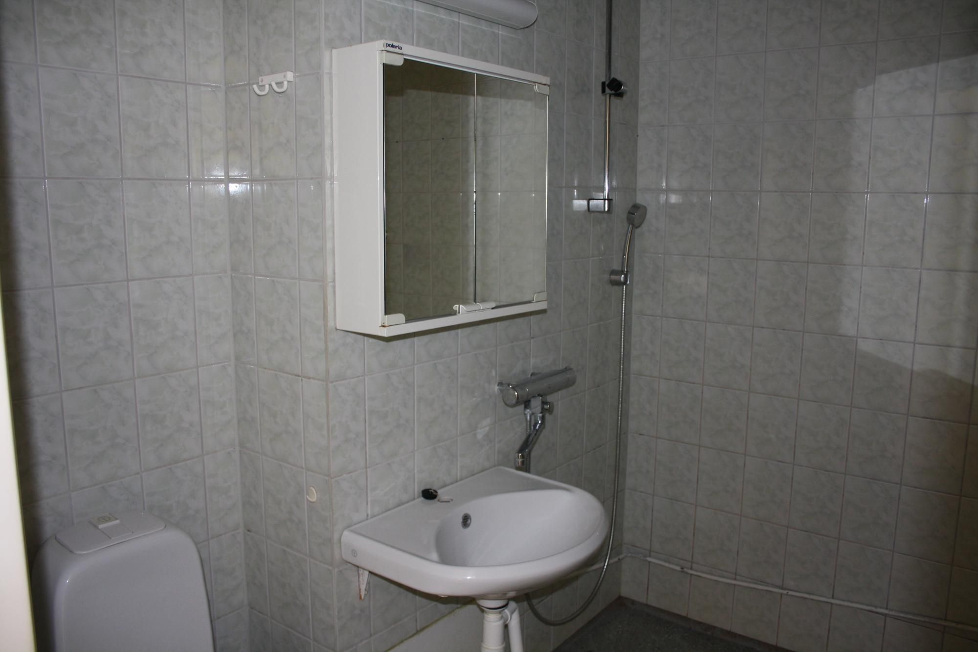 Tilava kylpyhuone, pyykinpesukone mahtuu sinne hyvin.