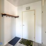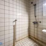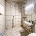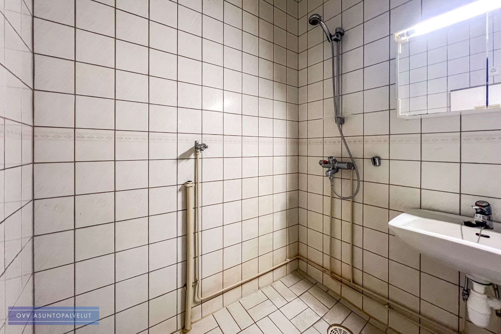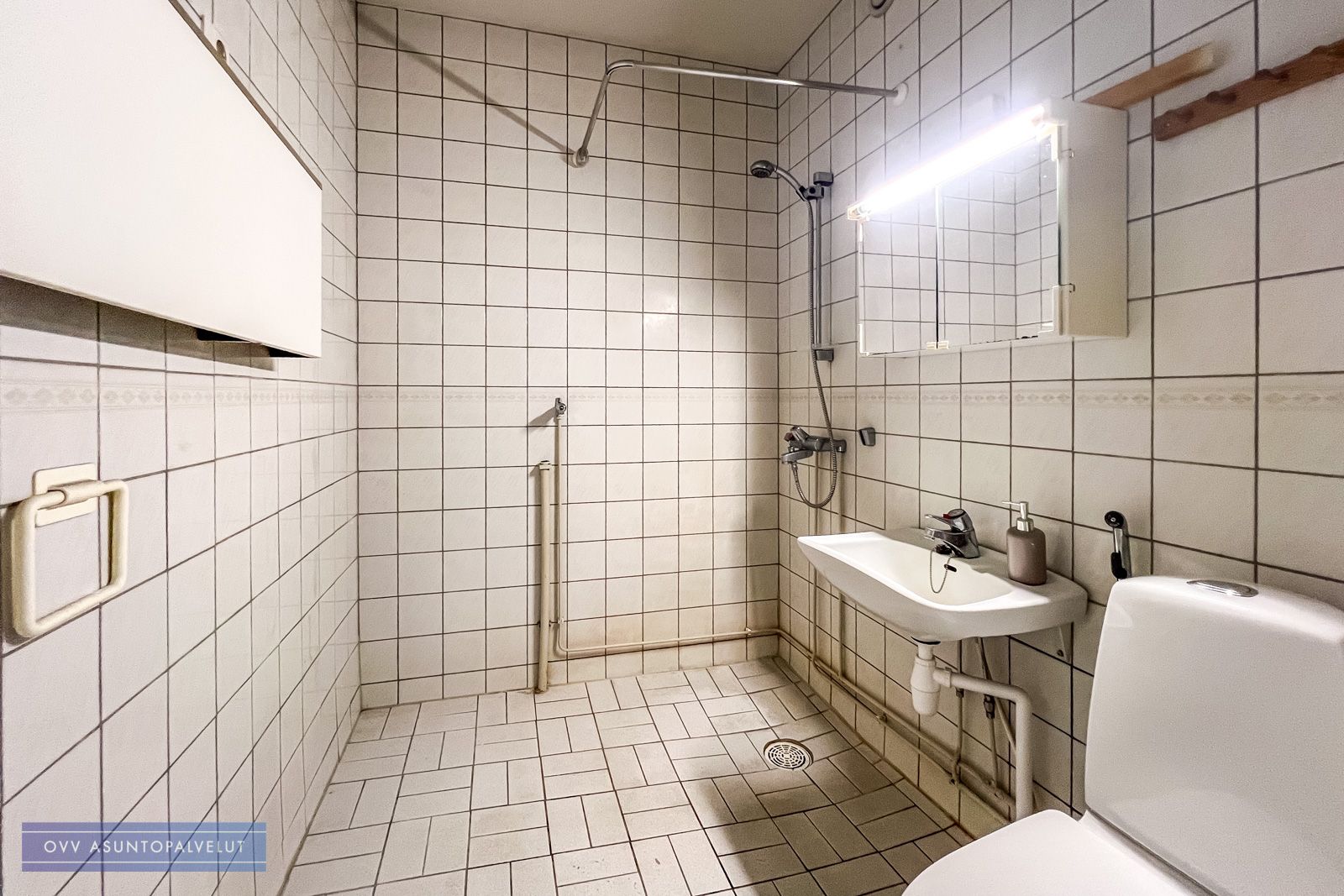 Kylpyhuone on kauttaaltaan laatoitettu, ja sieltä löytyy liitännät pyykinpesukoneelle.