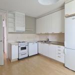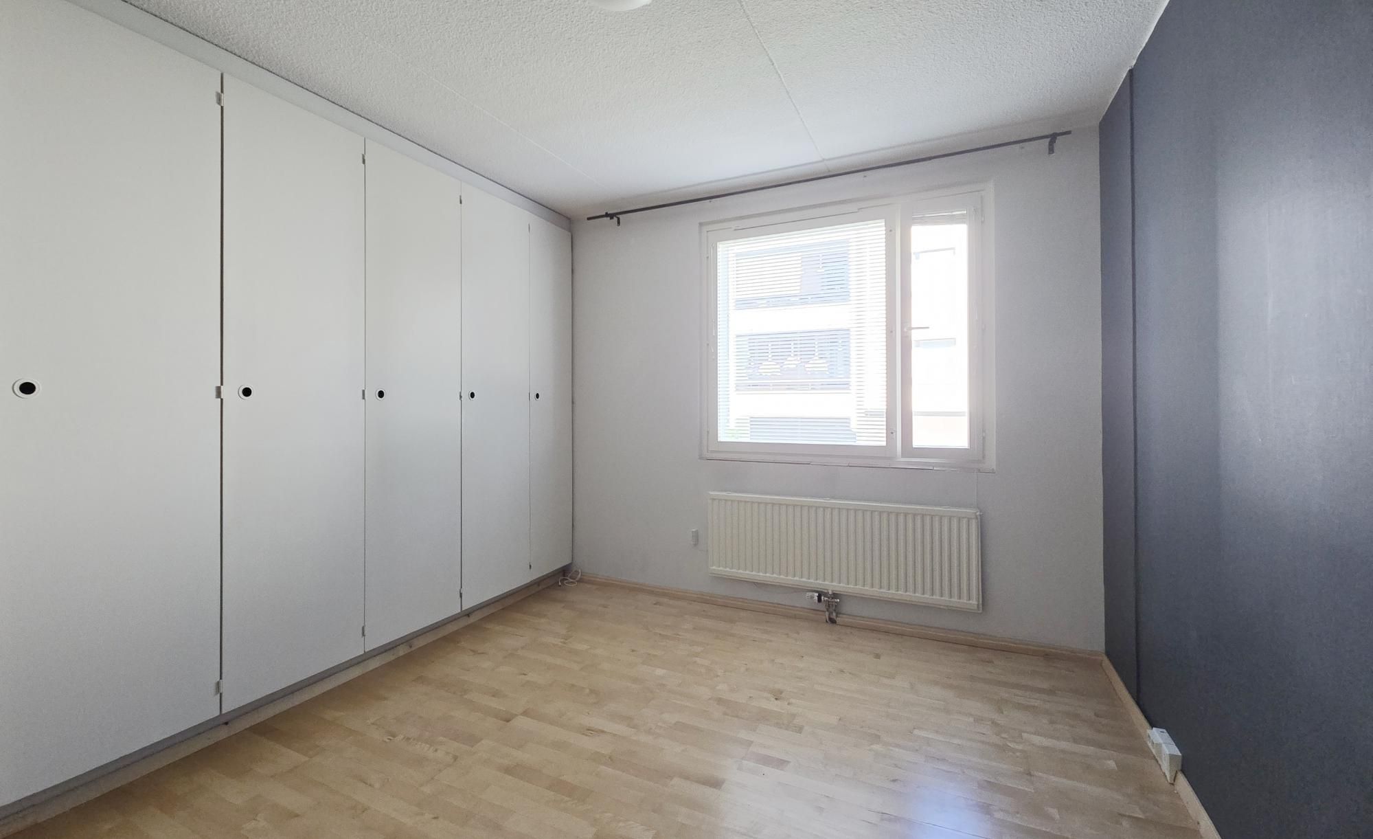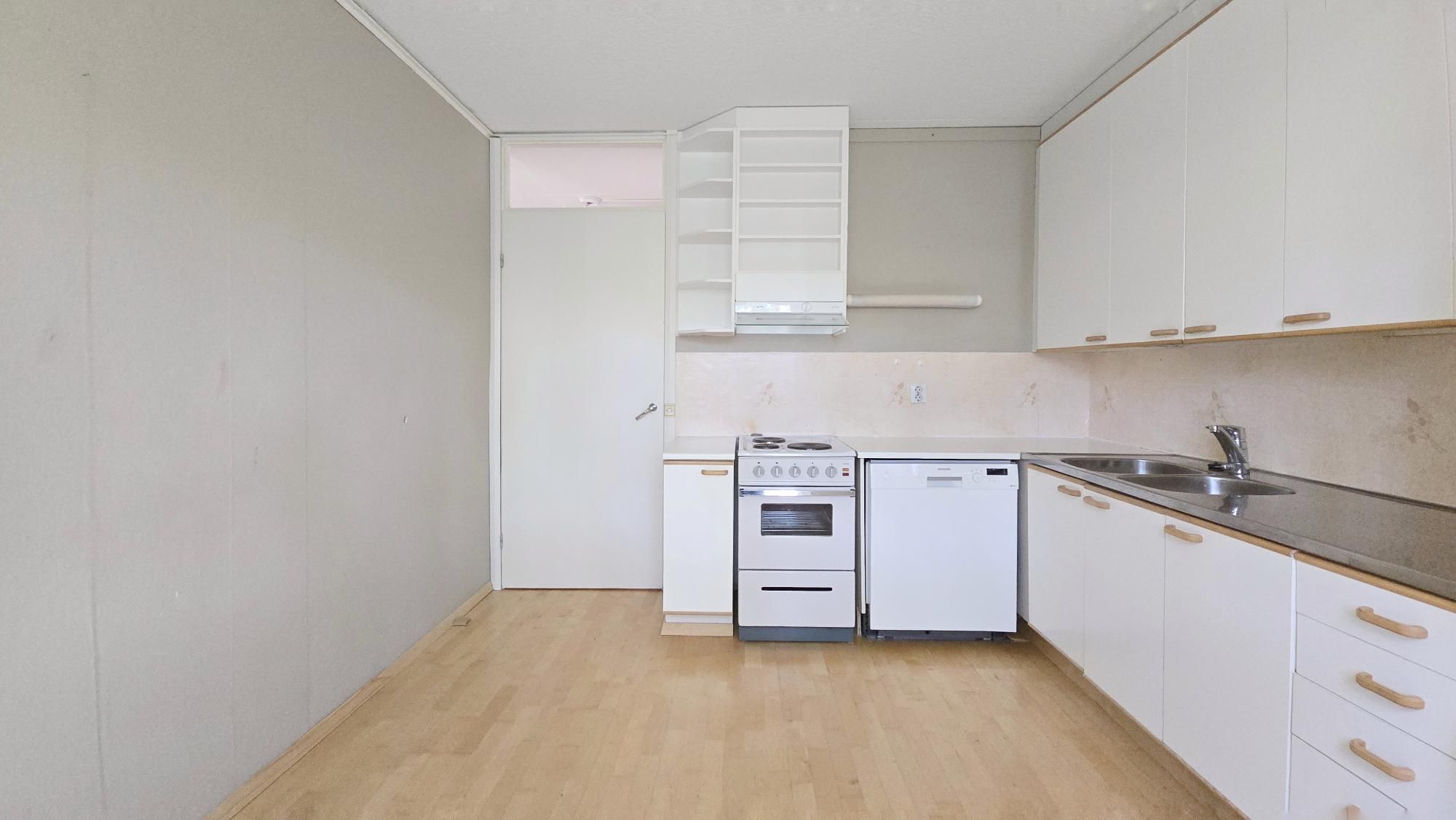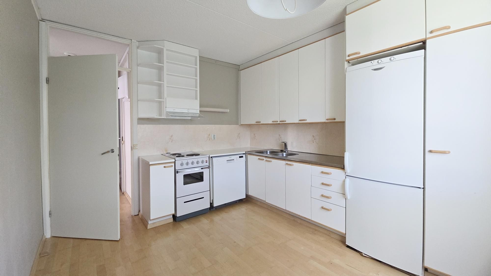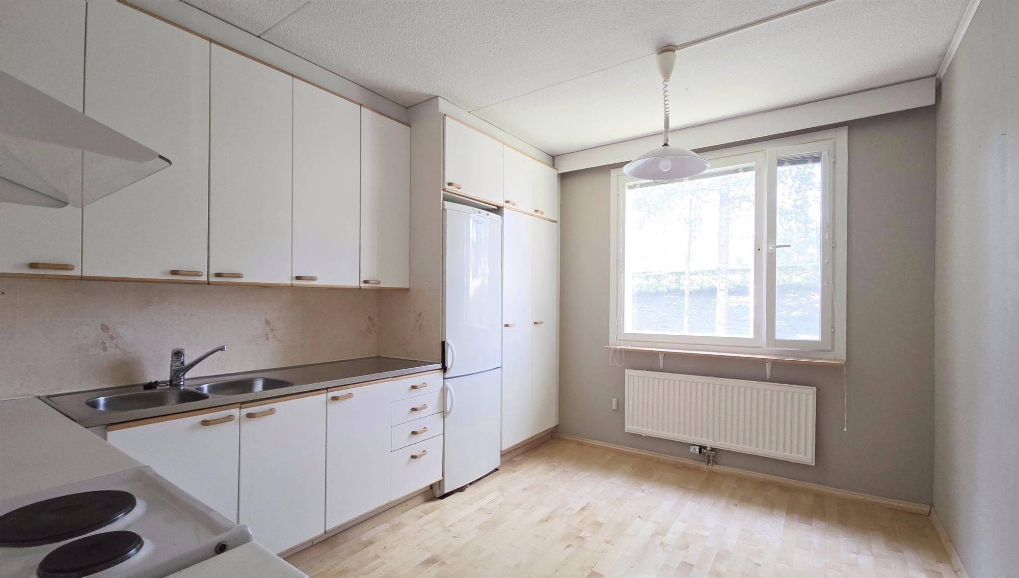 Tilavat huoneet. Iso makuuhuone, minne saa sopimaan hyvin suuremmankin sängyn sekä esim. työpisteen, runsaasti säilytystilaa. Erilliseen keittiöön sopii hyvän kokoinen ruokapöytä. Keittiössä astianpesukone valmiina, jääkaappi pakastin uusitaan (kuvissa vanha).