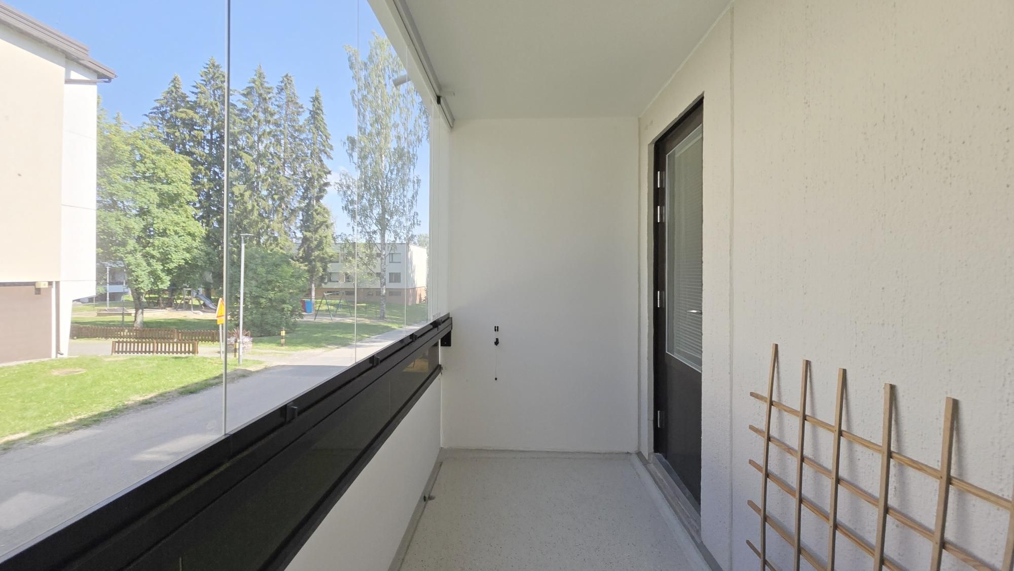 Lasitettu parveke. Ikkunoissa sälekaihtimet.