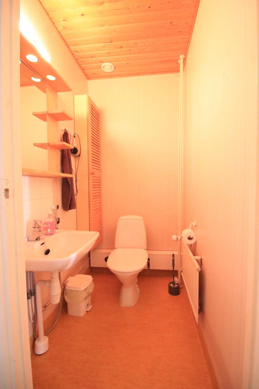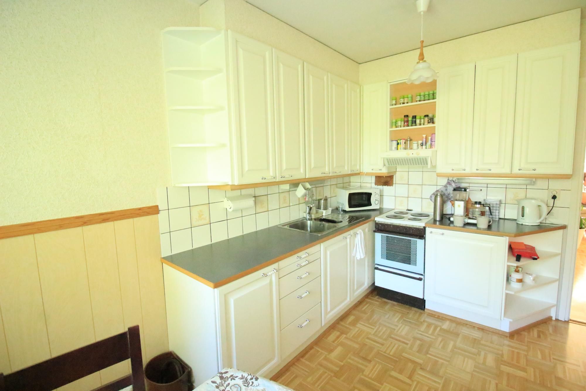 Keittiössä jää/pakastinkaappi, liesi, liesituuletin ja astianpesukoneliitäntä.
