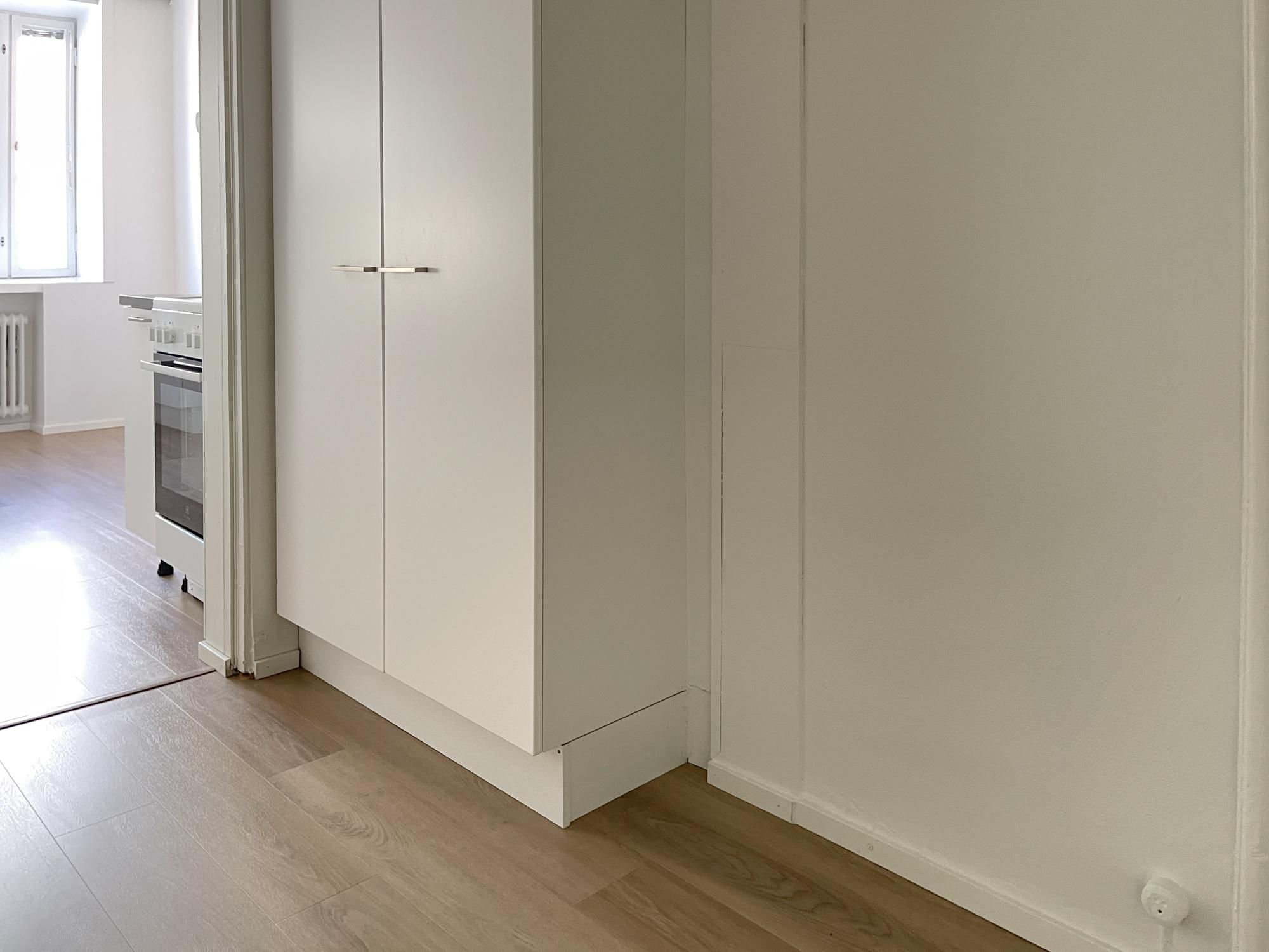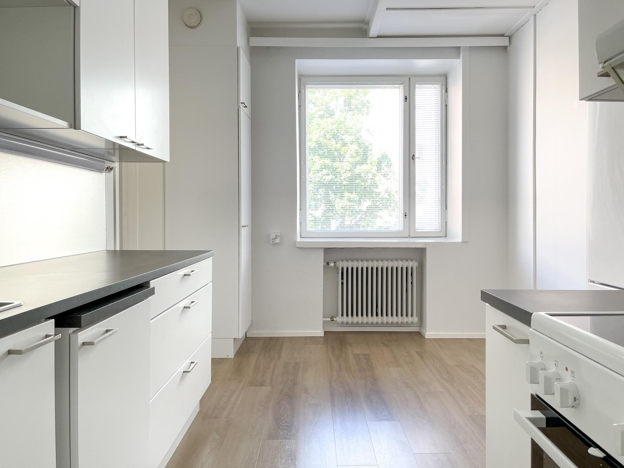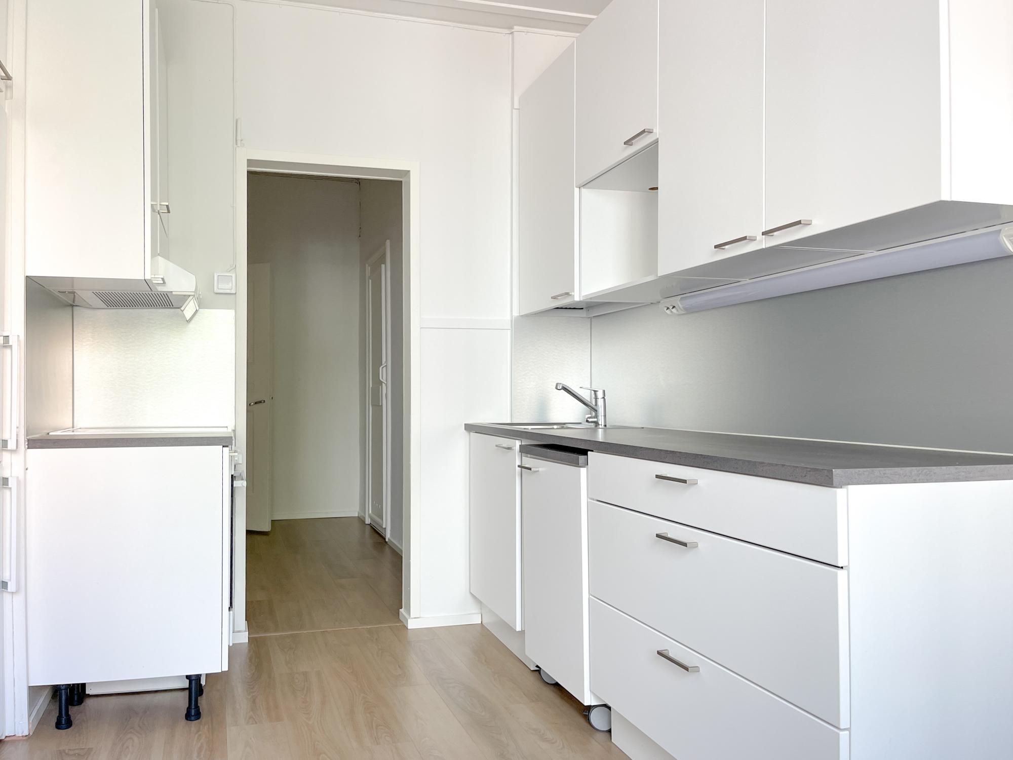 Neljännen kerroksen valoisa ja siisti koti. Keittiöön mahtuu ruokaryhmä ja asuinshuoneen alkovi tuo mukavasti lisätilaa. Keittiö on remontoitu kauniisti vaalein sävyin ja siellä on valmis paikka astianpesukoneelle.