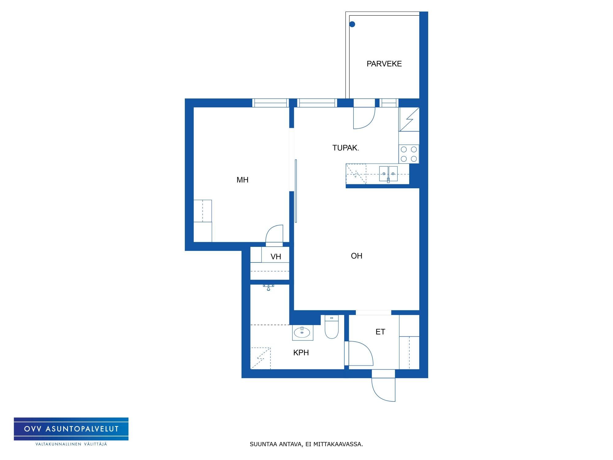Asunto heti vapaa. Asunto vastaa pohjaratkaisultaan kaksiota, ollen kuitenkin virallisesti 1h + tupakeittiö.