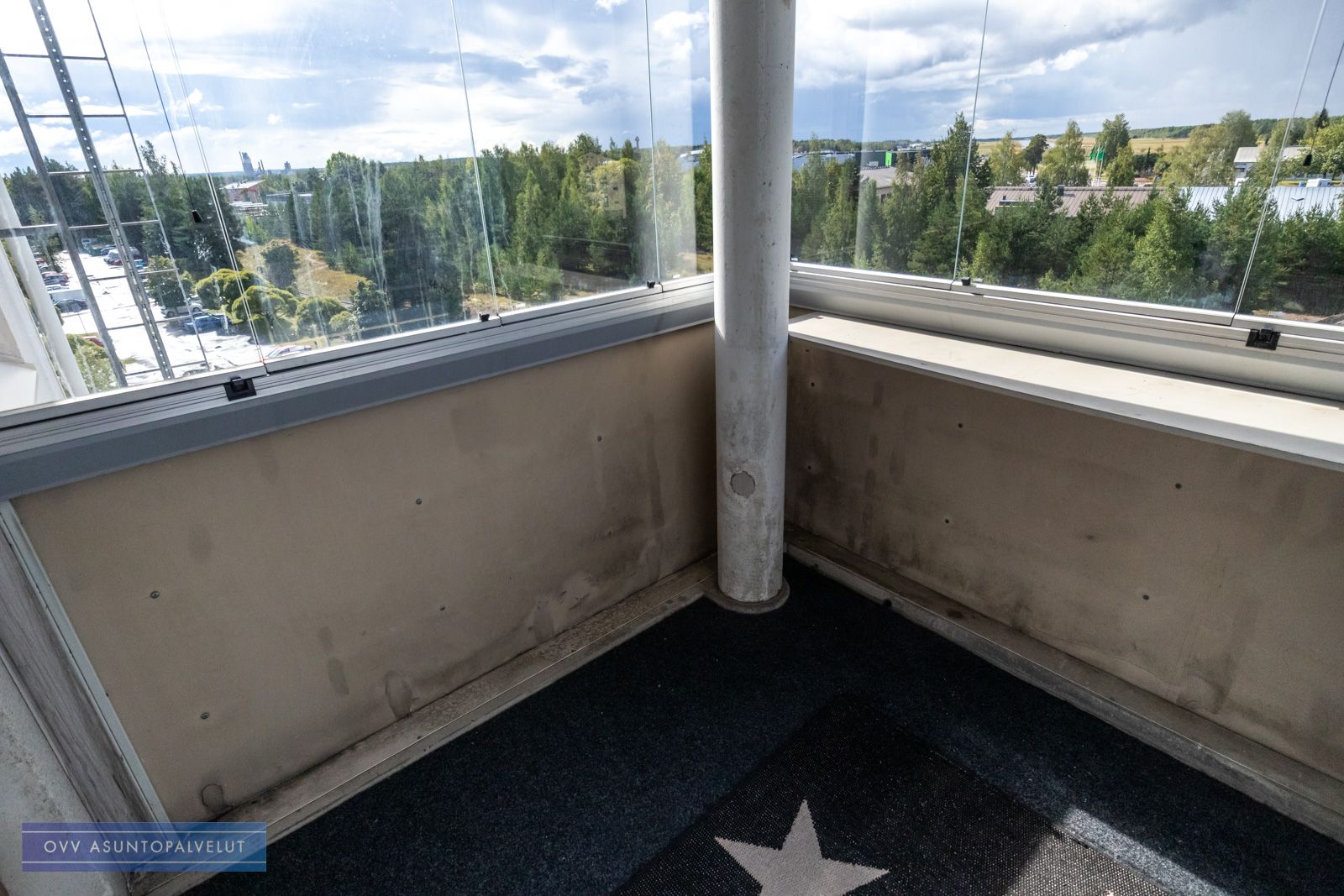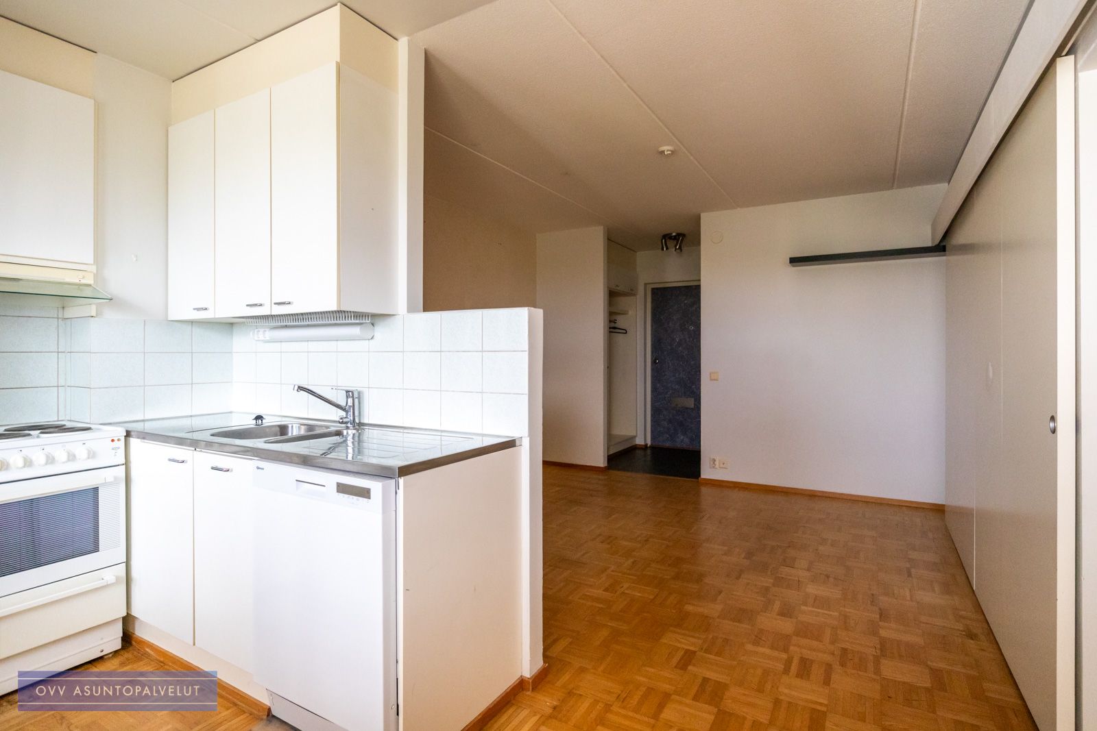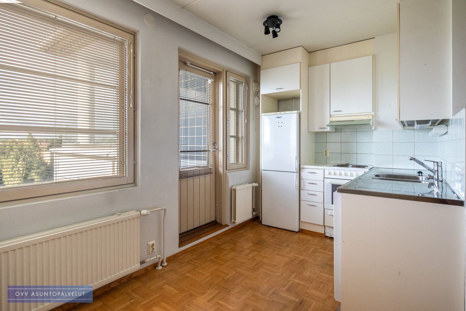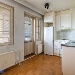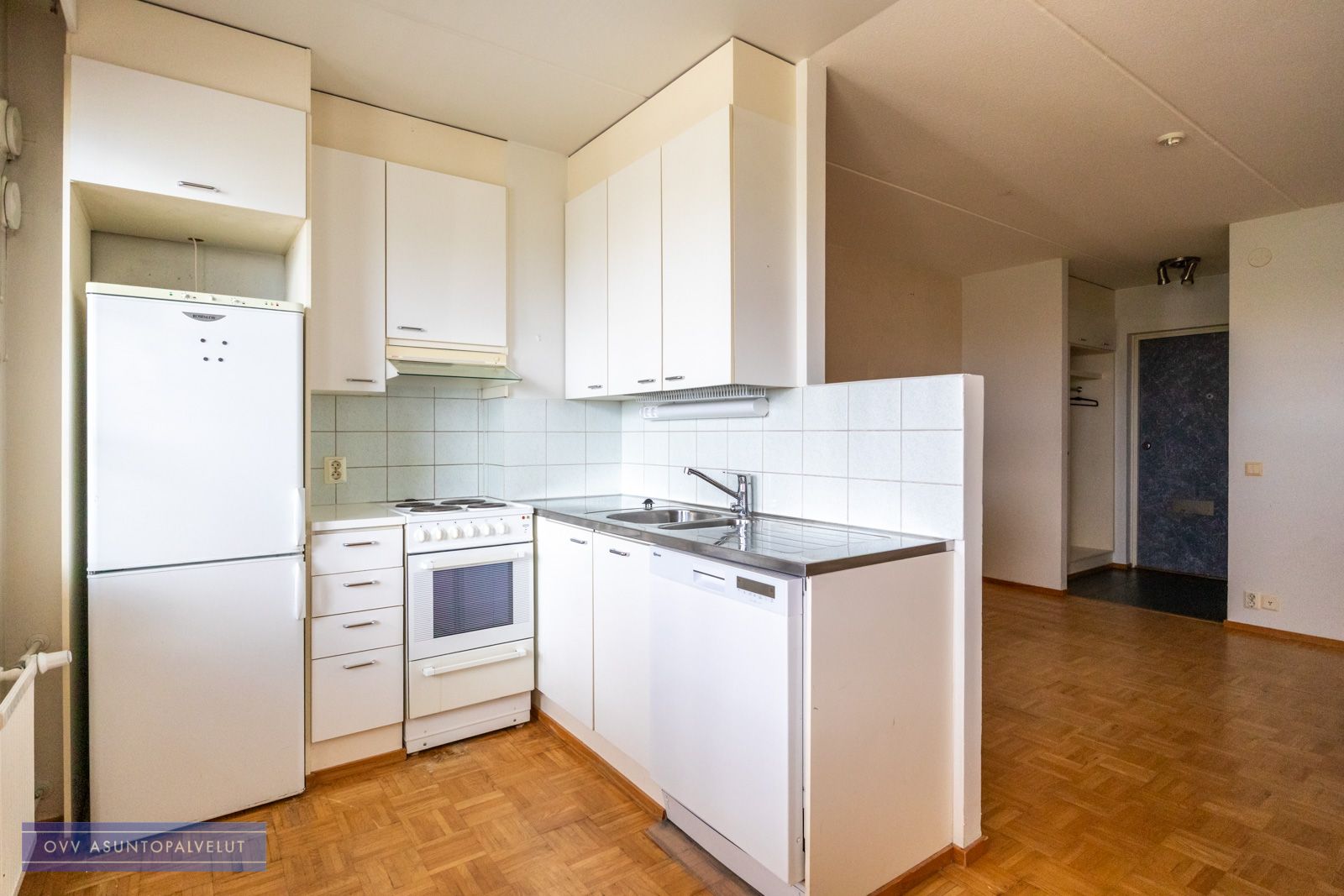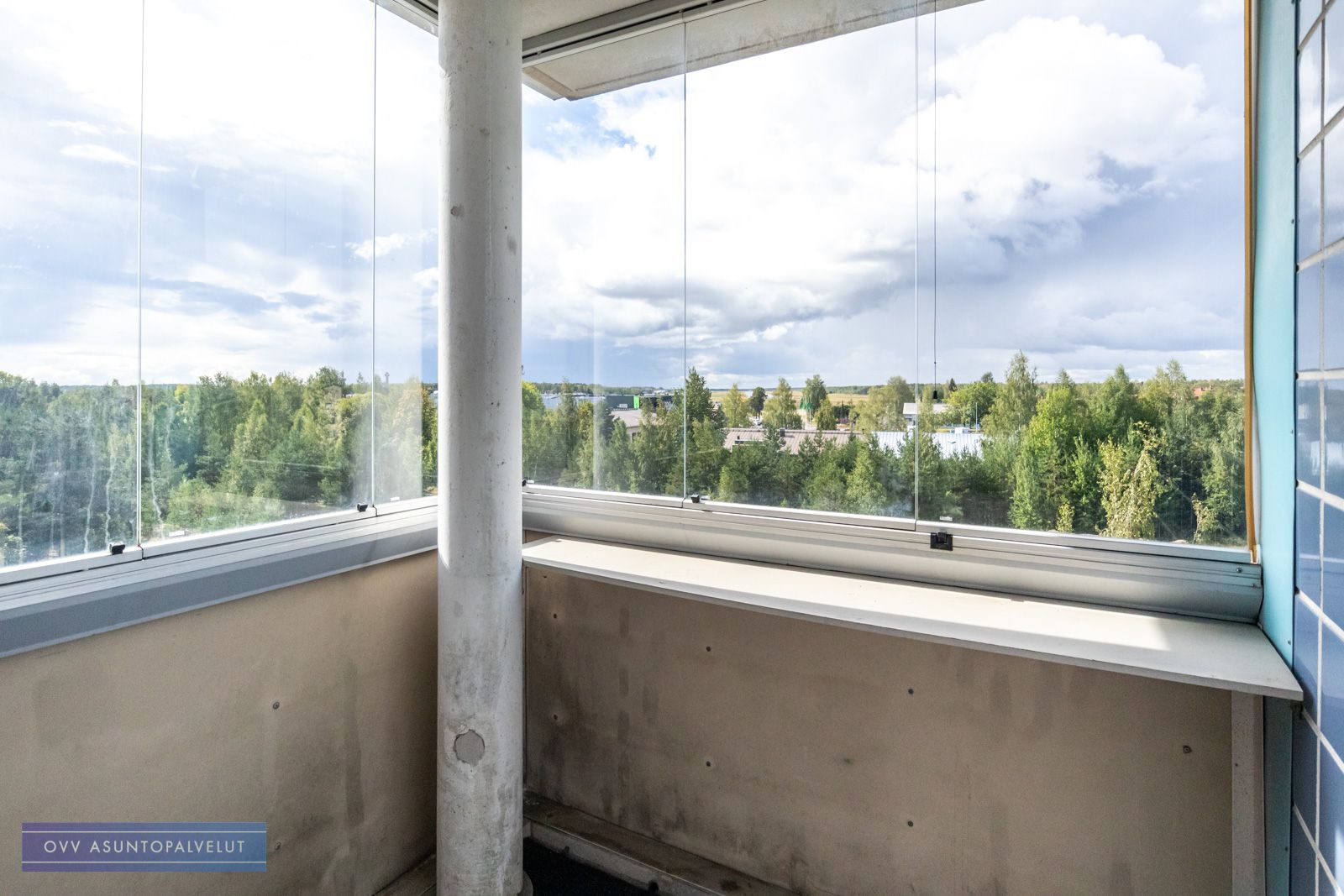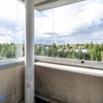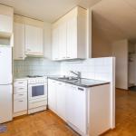 Asuntoon tultaessa eteisen yhteydessä on tilava kylpyhuone, jossa paikka ja liitännät pyykinpesukoneelle. Olohuone avautuu keittonurkkaukseen. Keittiön puolella hyvin kaappi ja laskutilaa sekä käynti lasitetulle parvekkeelle, jossa oma rauha puiden yllä. Keittiöstä löytyy valmiiksi astianpesukone.