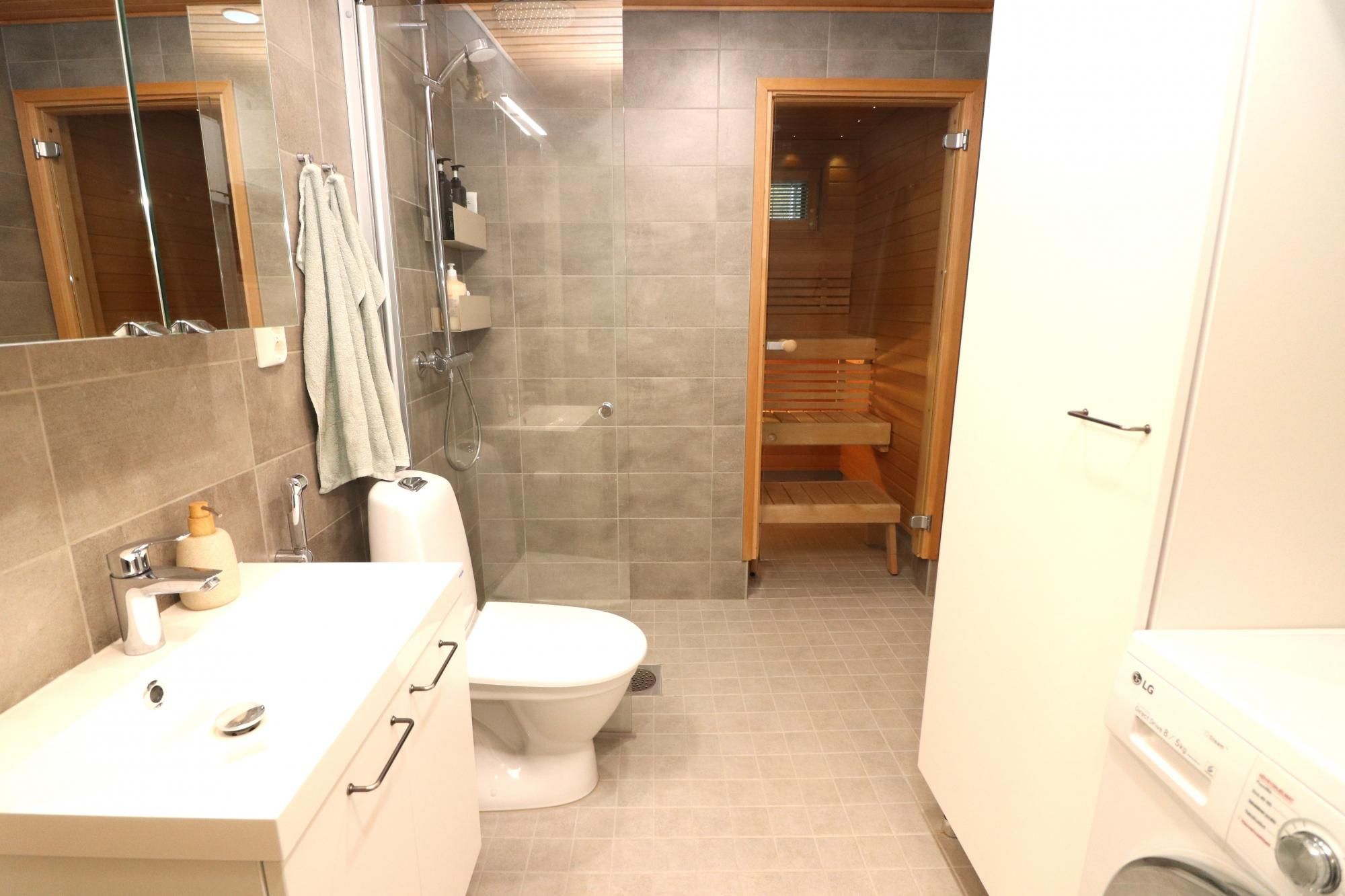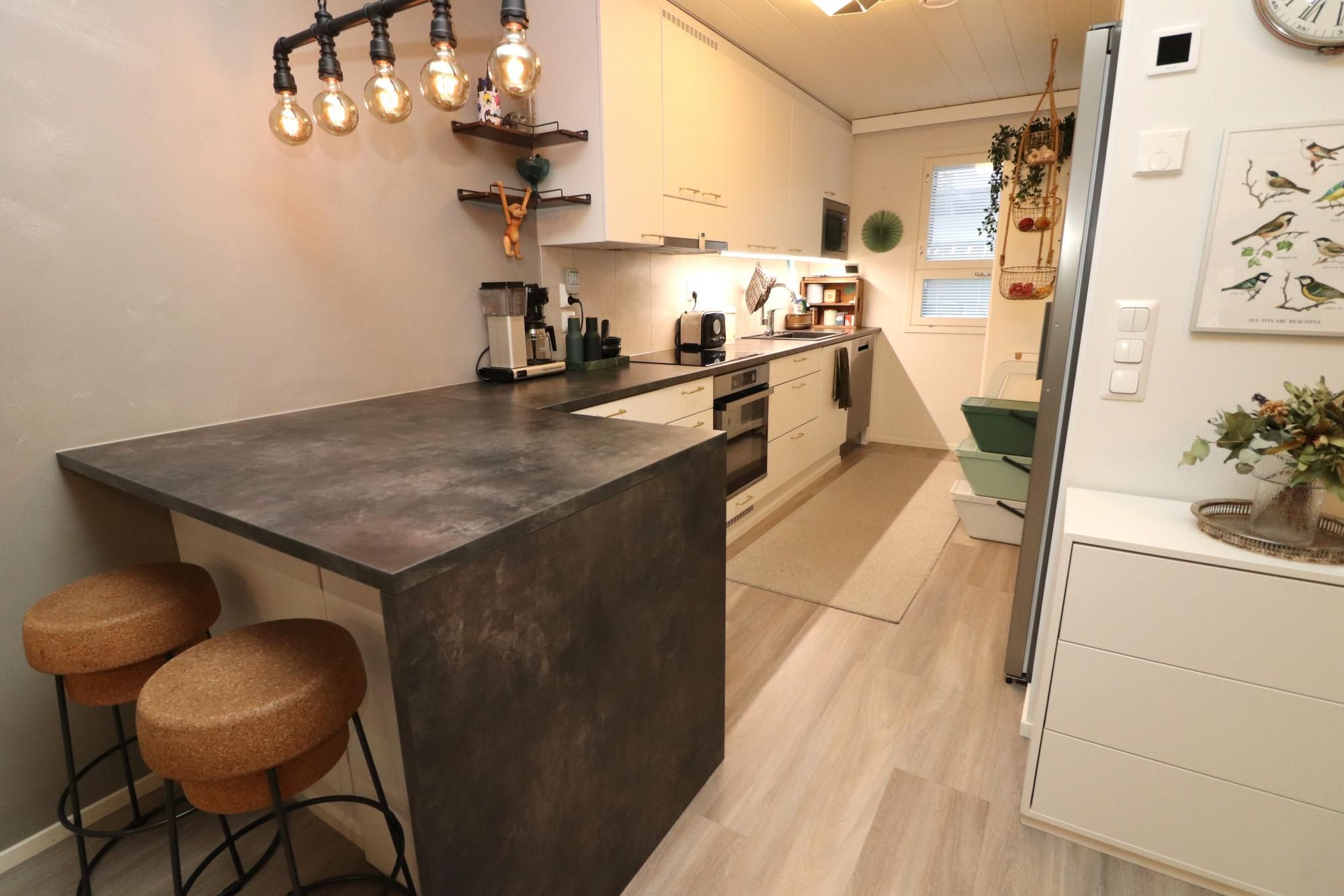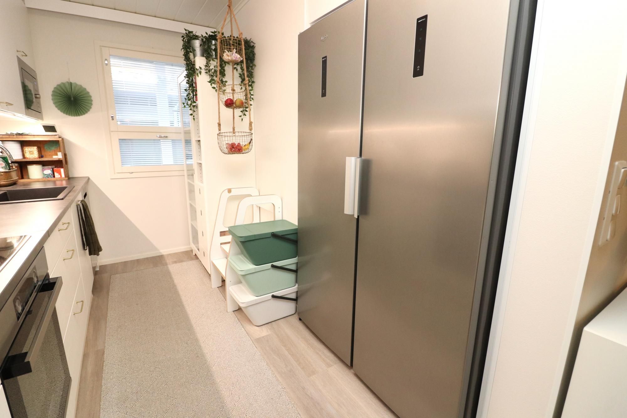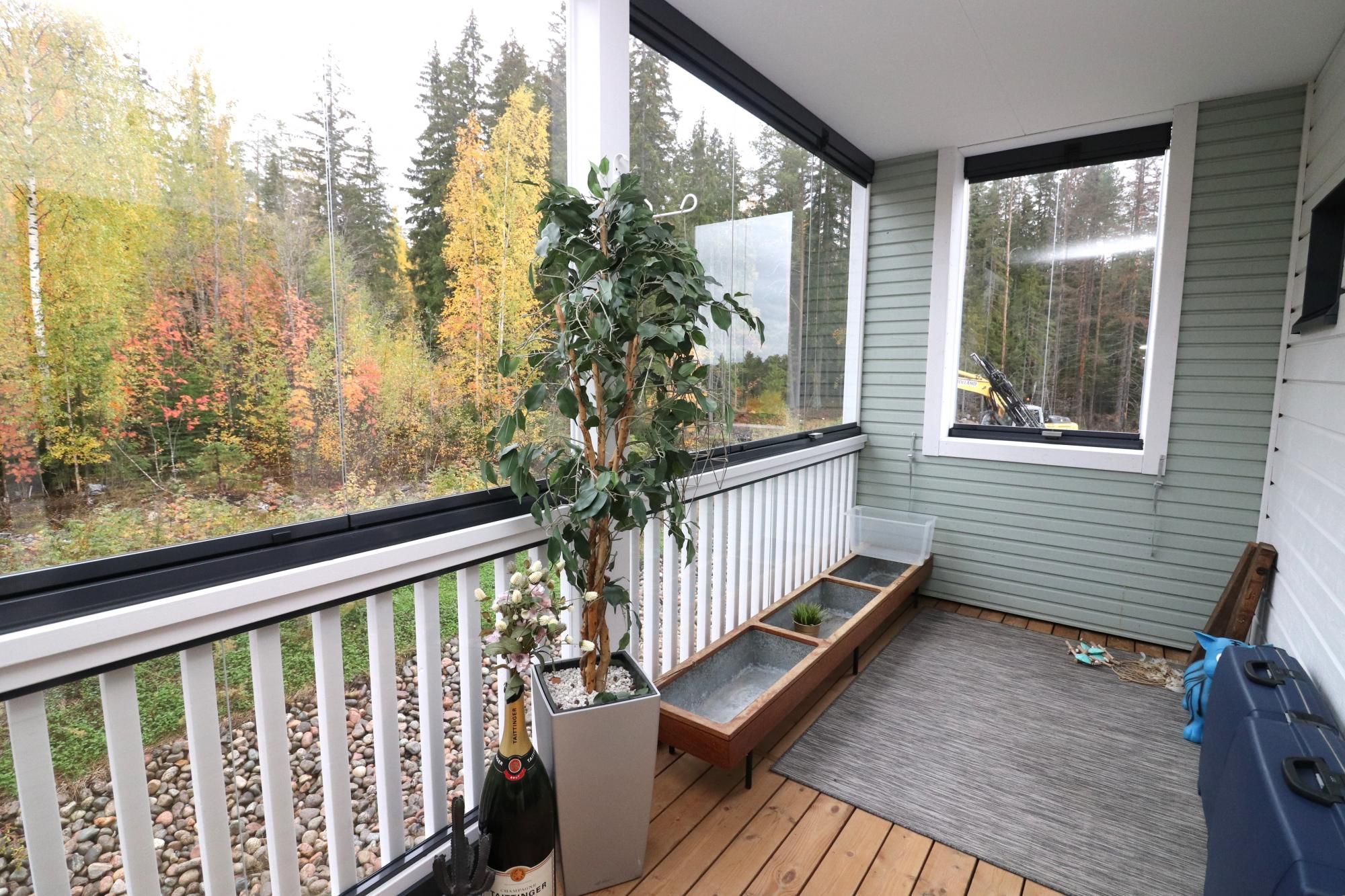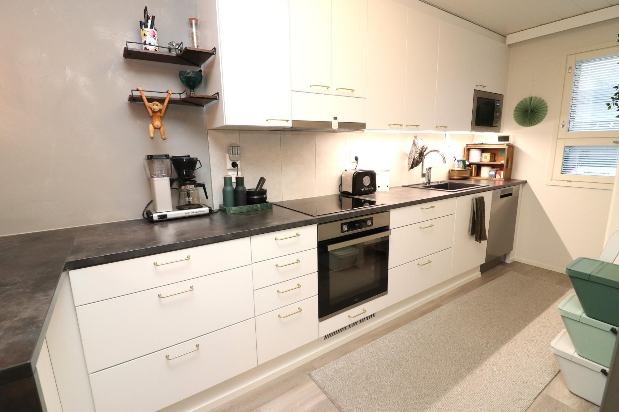 Keittiössä modernit kalusteet ja kauniit väriyhdistelmät. Arkea helpottaa täysikokoiset jääkaappi ja pakastin. Valoisasta olohuoneesta on käynti terassille ja suojaisalle pihalle. Yläkerran kahdesta makuuhuoneesta näkymä Kallavedelle. Nykyaikaisessa kylpyhuoneessa paikka pyykinpesukoneelle, wc-istuin sekä ikkunallinen sauna. Lisämukavuutta asuntoon tuo ilmalämpöpumppu. Säilytystilaa on makuuhuoneissa, eteisessä sekä asunnolle kuuluu varasto. Autokatsopaikka saatavilla (20 €/kk) ja siinä on sähköauton latausmahdollisuus. Autokatsopaikka sijaitsee näppärästi suoraan oven edessä.