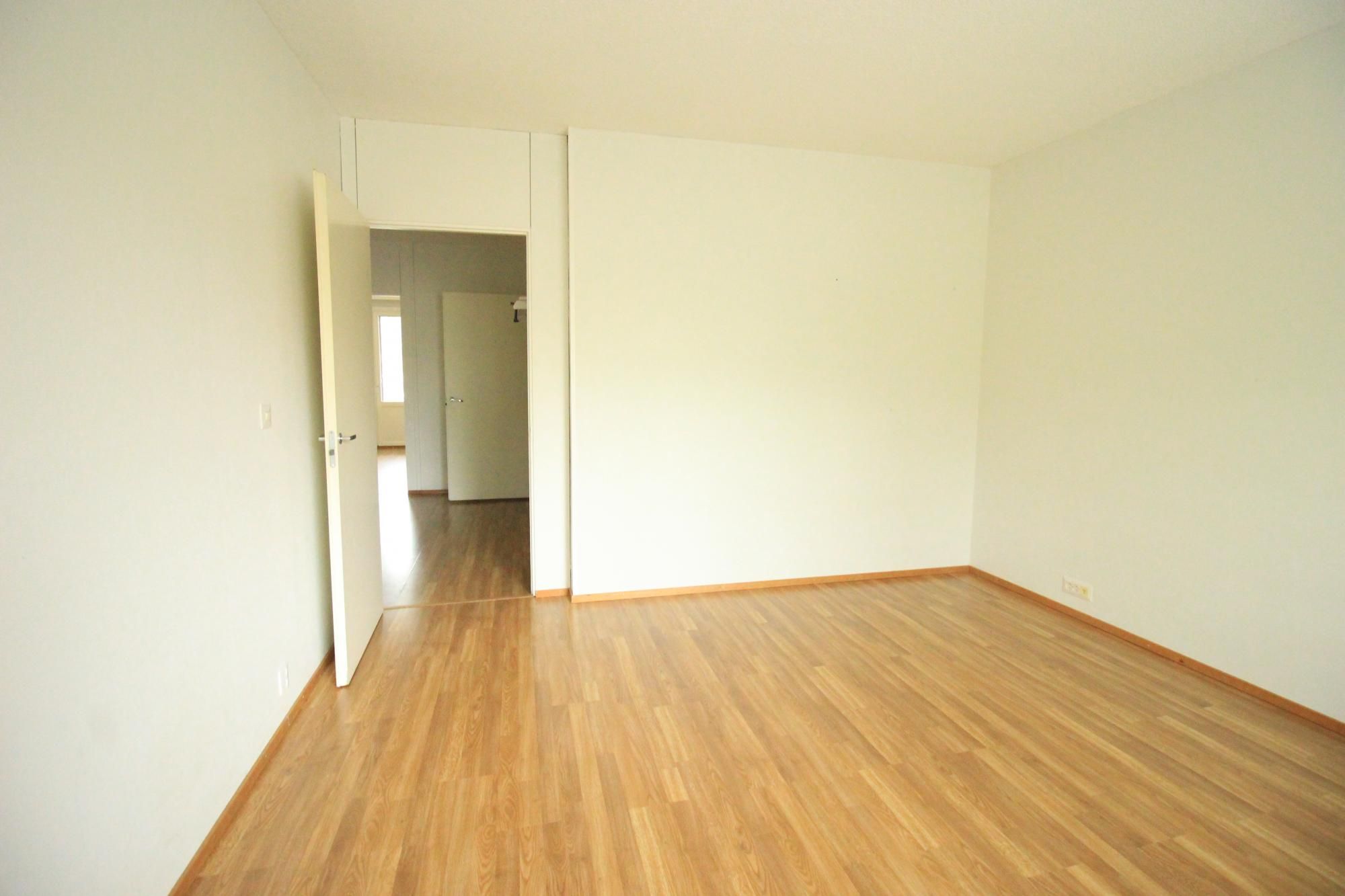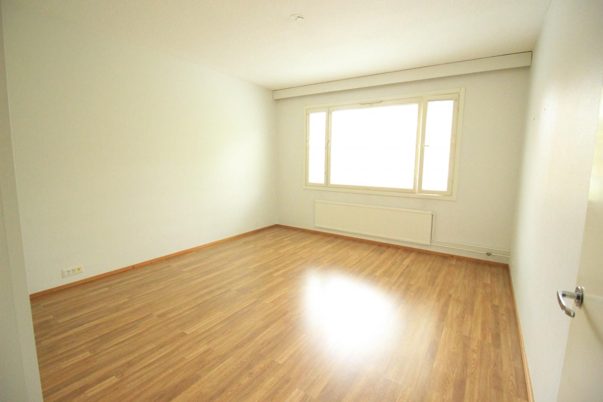 Laminaattilattiat, seinät maalipinnoin, ikkunoissa sälekaihtimet.