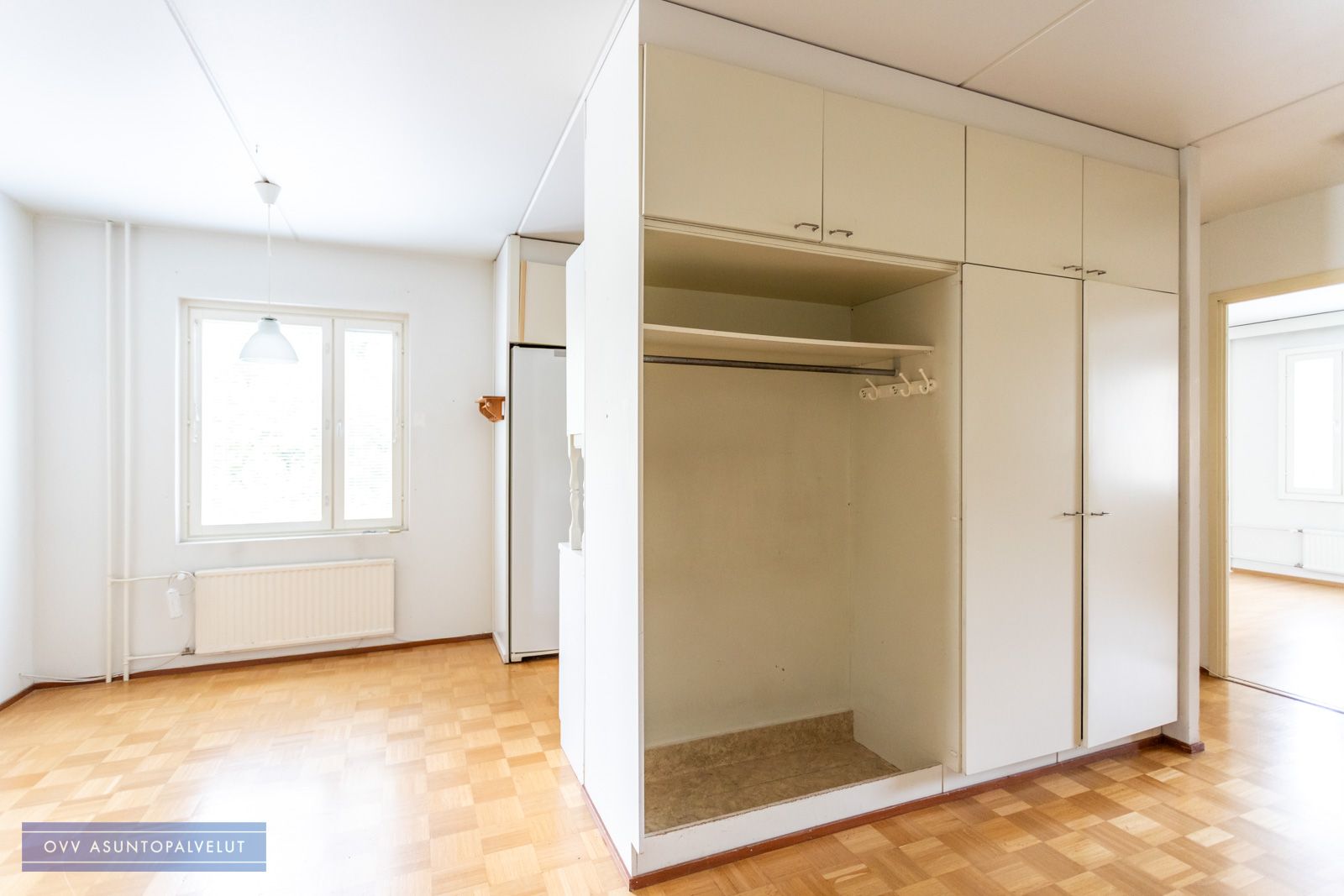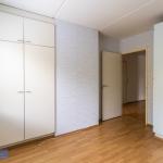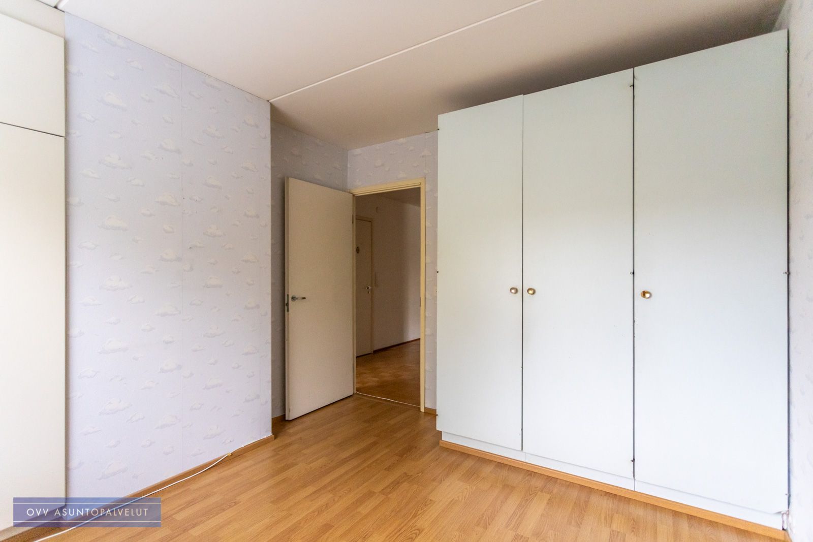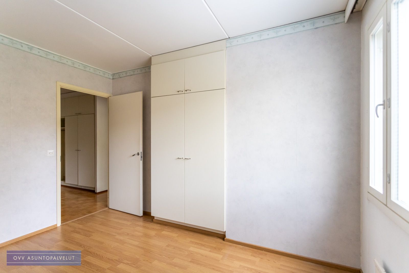 Keittiössä hyvin kaappitilaa ja erillinen ruokailutila. Makuuhuoneet vierekkäin ja molemmista löytyy säilytystilaa.
