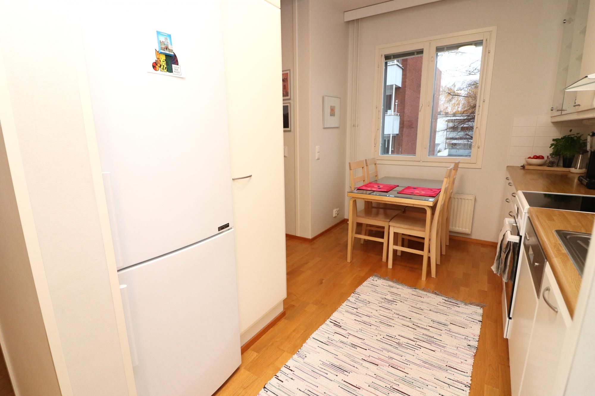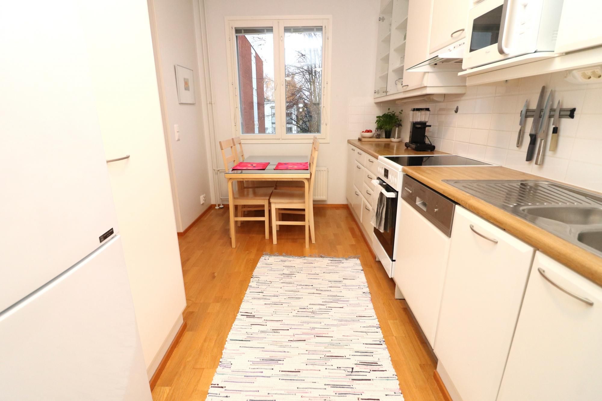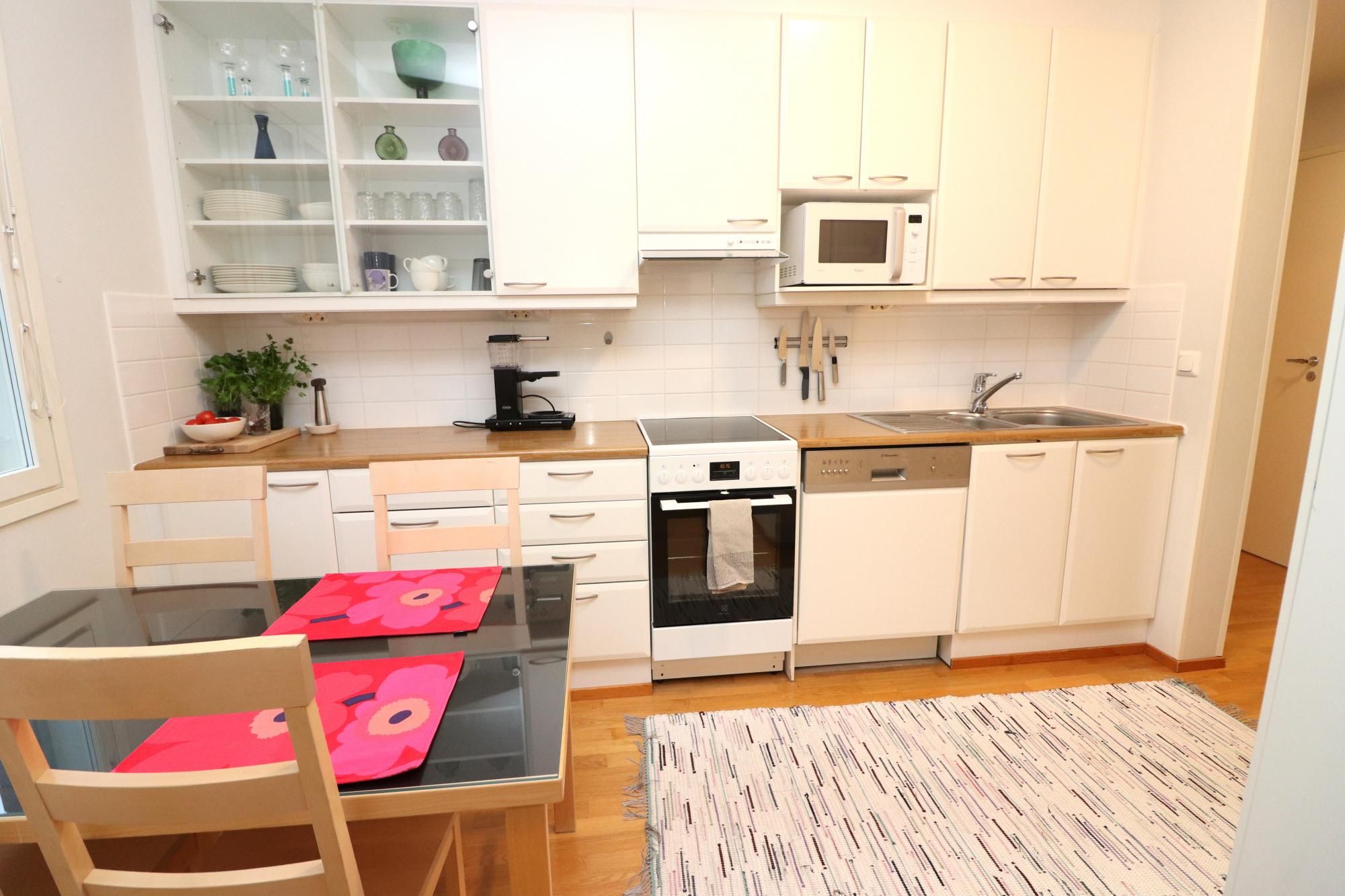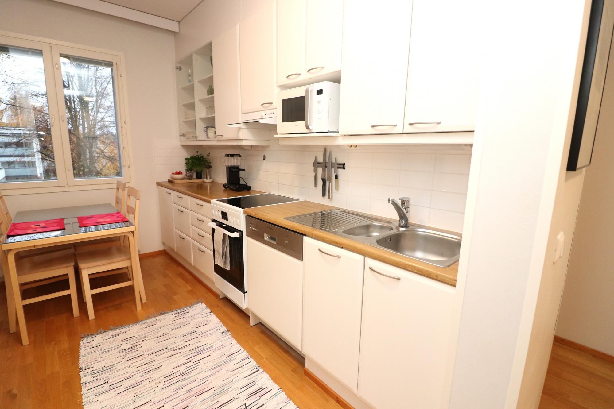 Keittiössä vaaleat kaapistot, jääkaappi/pakastin, astianpesukone, liesi- ja liesituuletin sekä tilaa ruokapöydälle. Olohuoneesta käynti lasitetulle parvekkeelle, josta näkymä Kallavedelle. Wc/kylpyhuoneessa pyykinpesukone vuokralaisen käytössä toimintansa ajan. Säilytystilaa on makuuhuoneen ja eteisen kaapistoissa. Häkkivarasto ei ole käytettävissä.