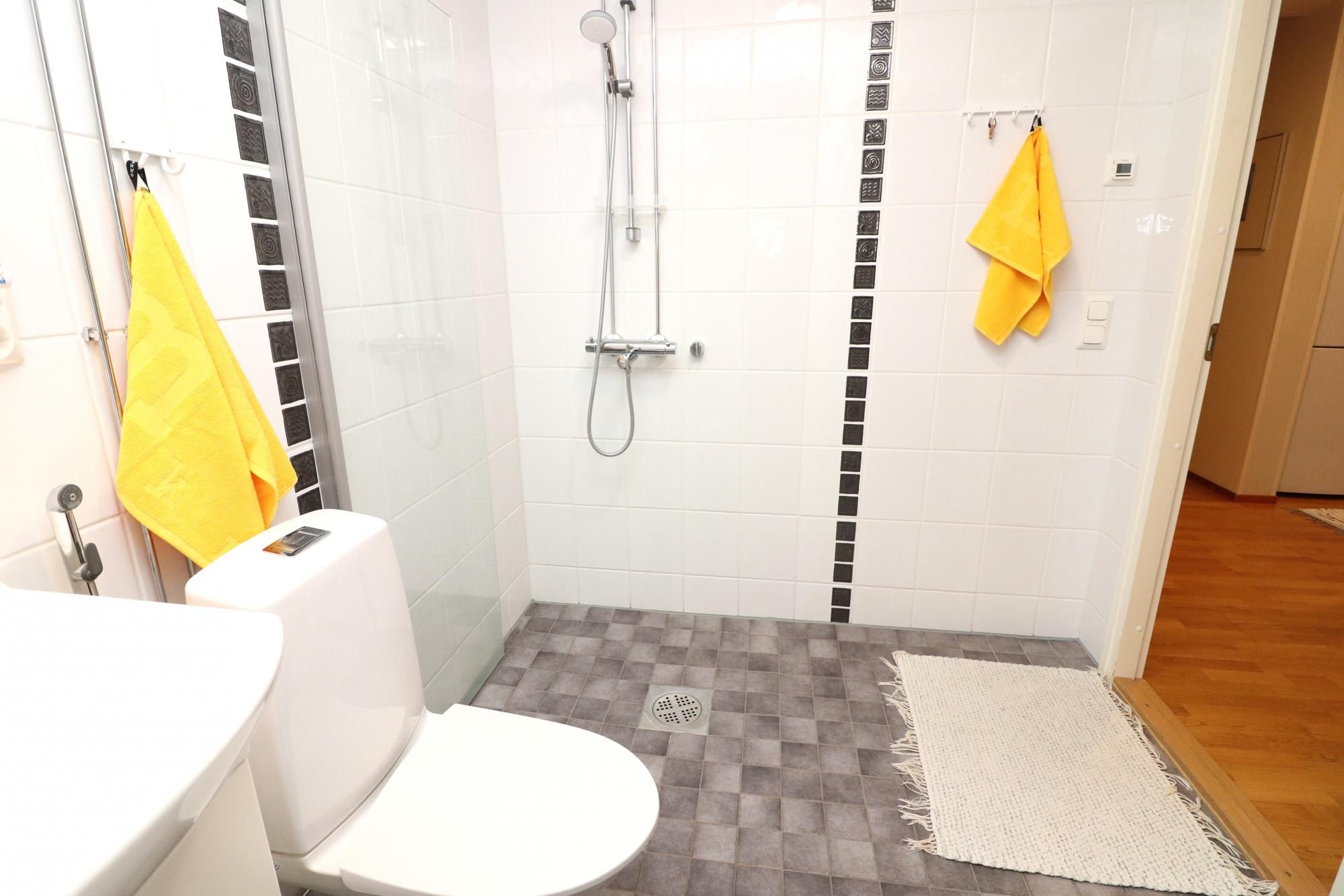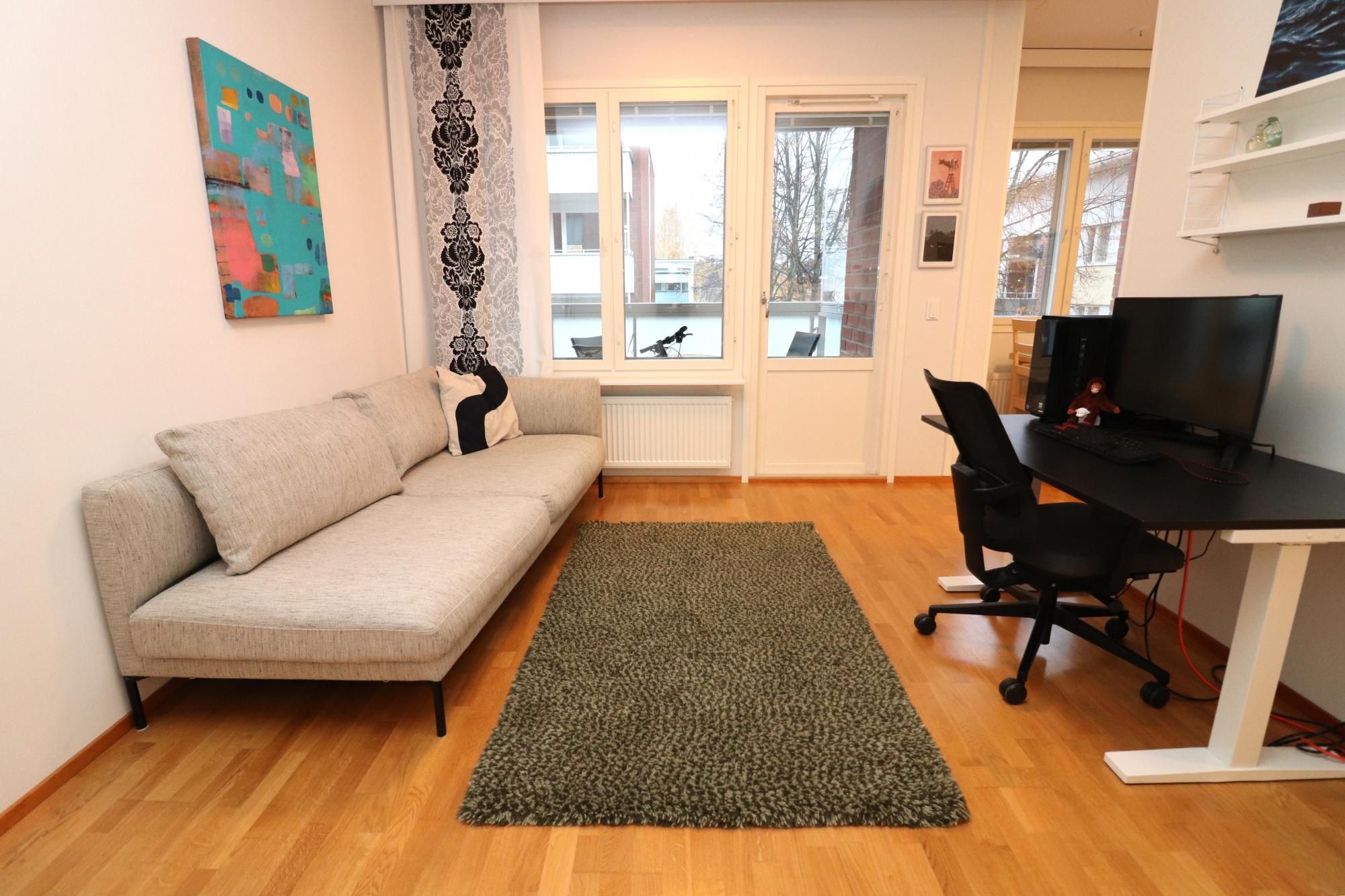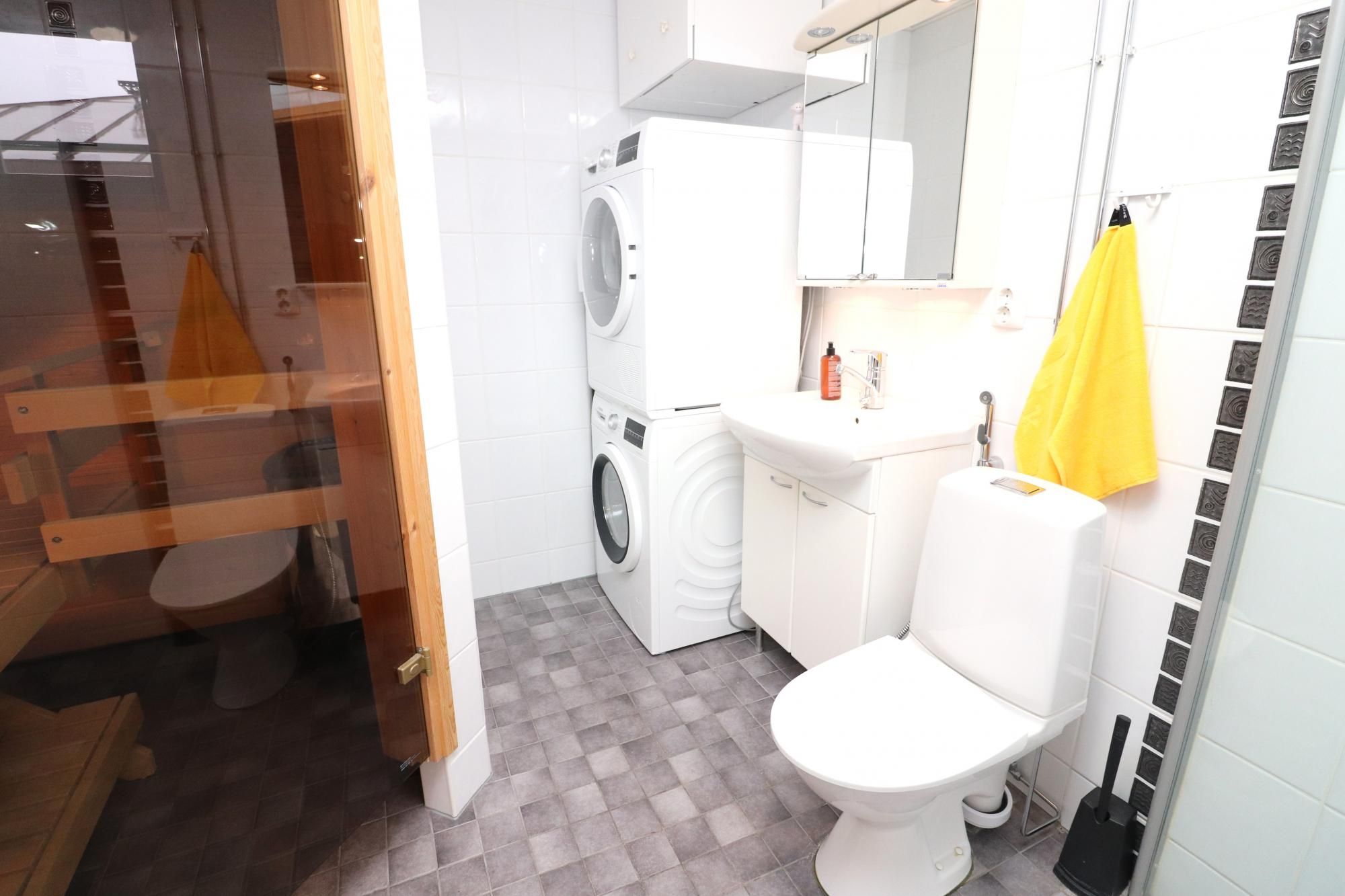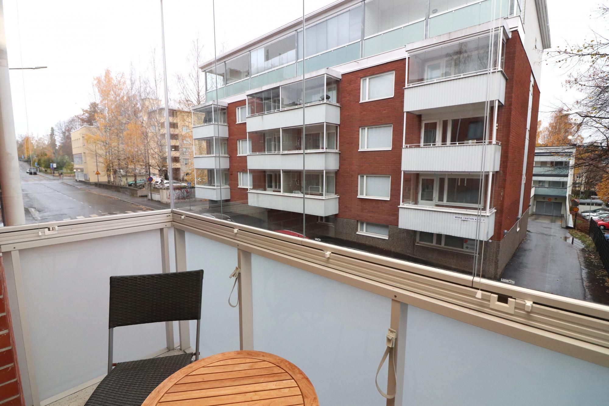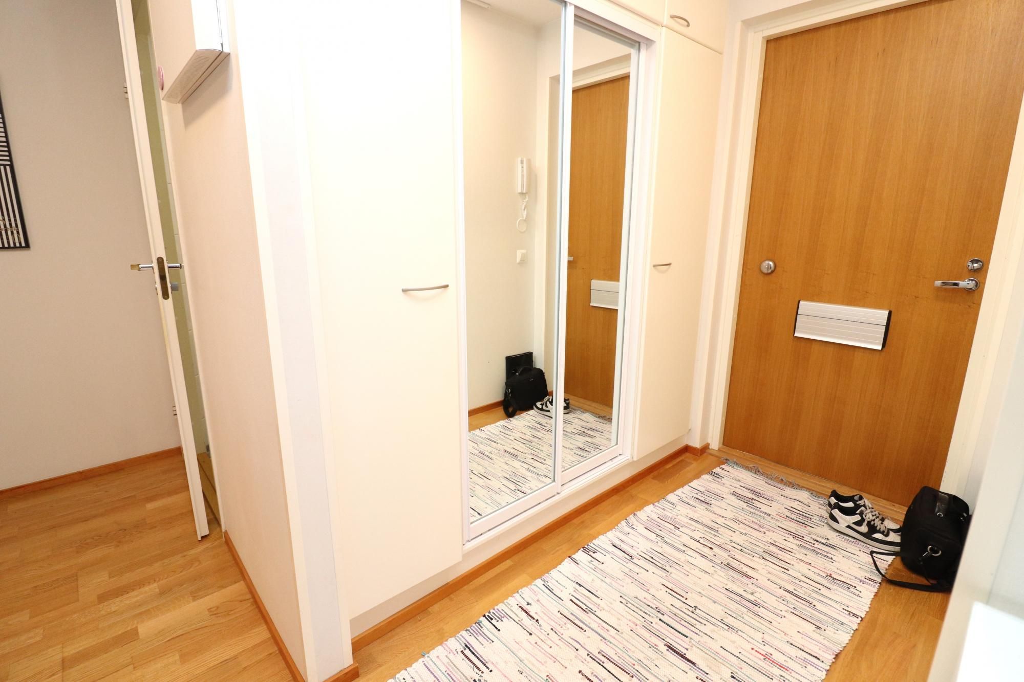 Keittiössä vaaleat kaapistot, jääkaappi/pakastin, astianpesukone, liesi- ja liesituuletin sekä tilaa ruokapöydälle. Olohuoneesta käynti lasitetulle parvekkeelle, josta näkymä Kallavedelle. Wc/kylpyhuoneessa pyykinpesukone vuokralaisen käytössä toimintansa ajan. Säilytystilaa on makuuhuoneen ja eteisen kaapistoissa. Häkkivarasto ei ole käytettävissä.